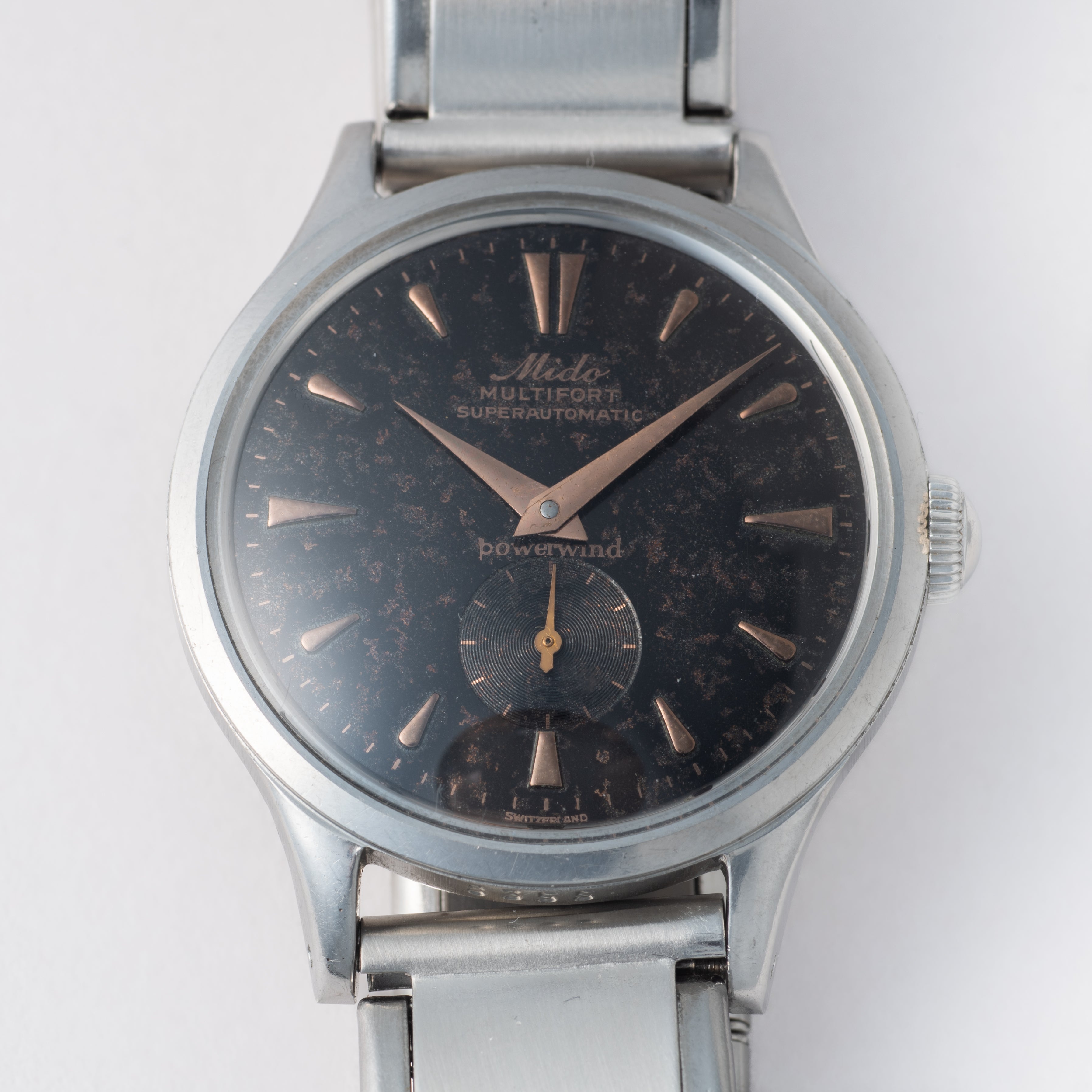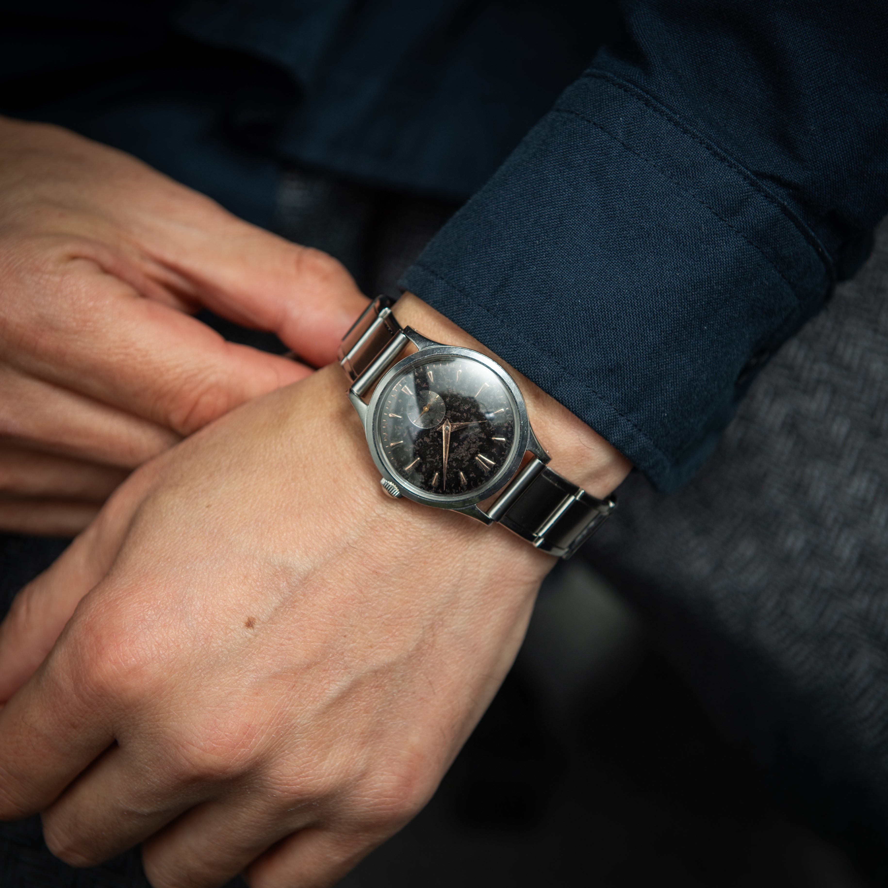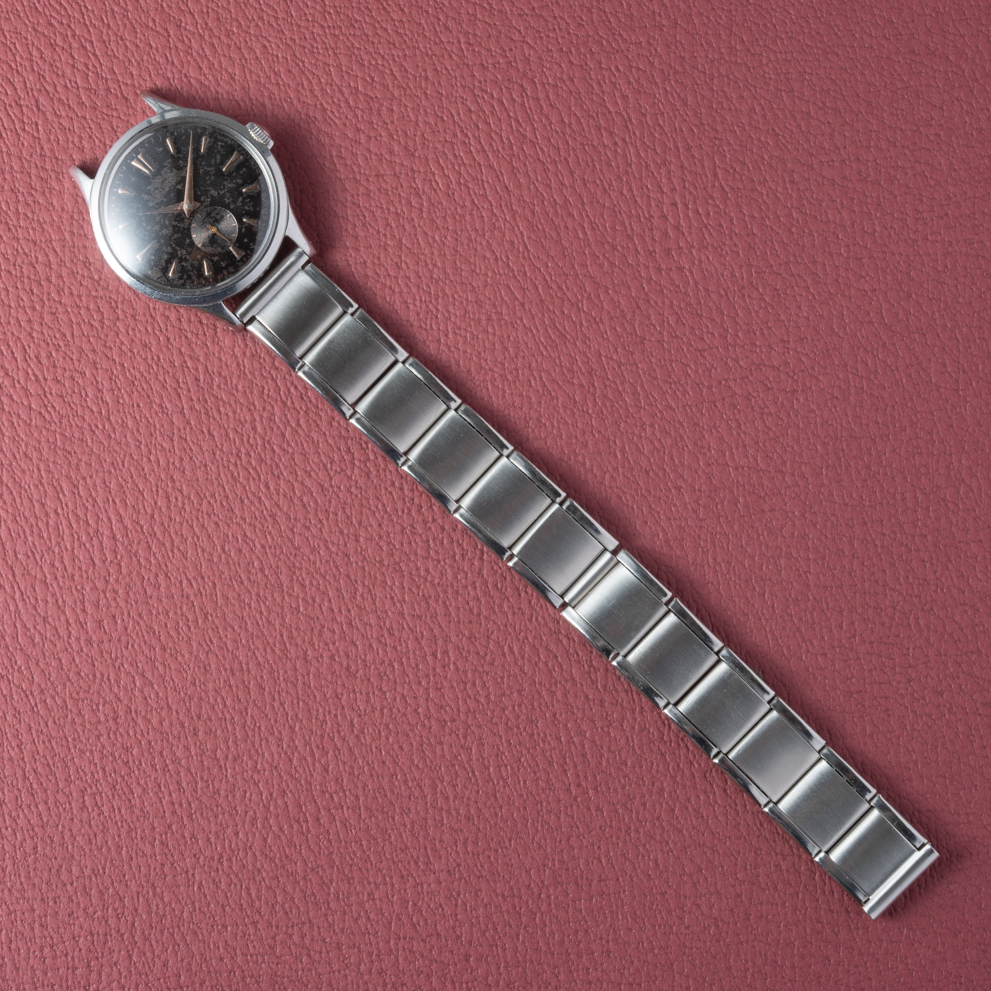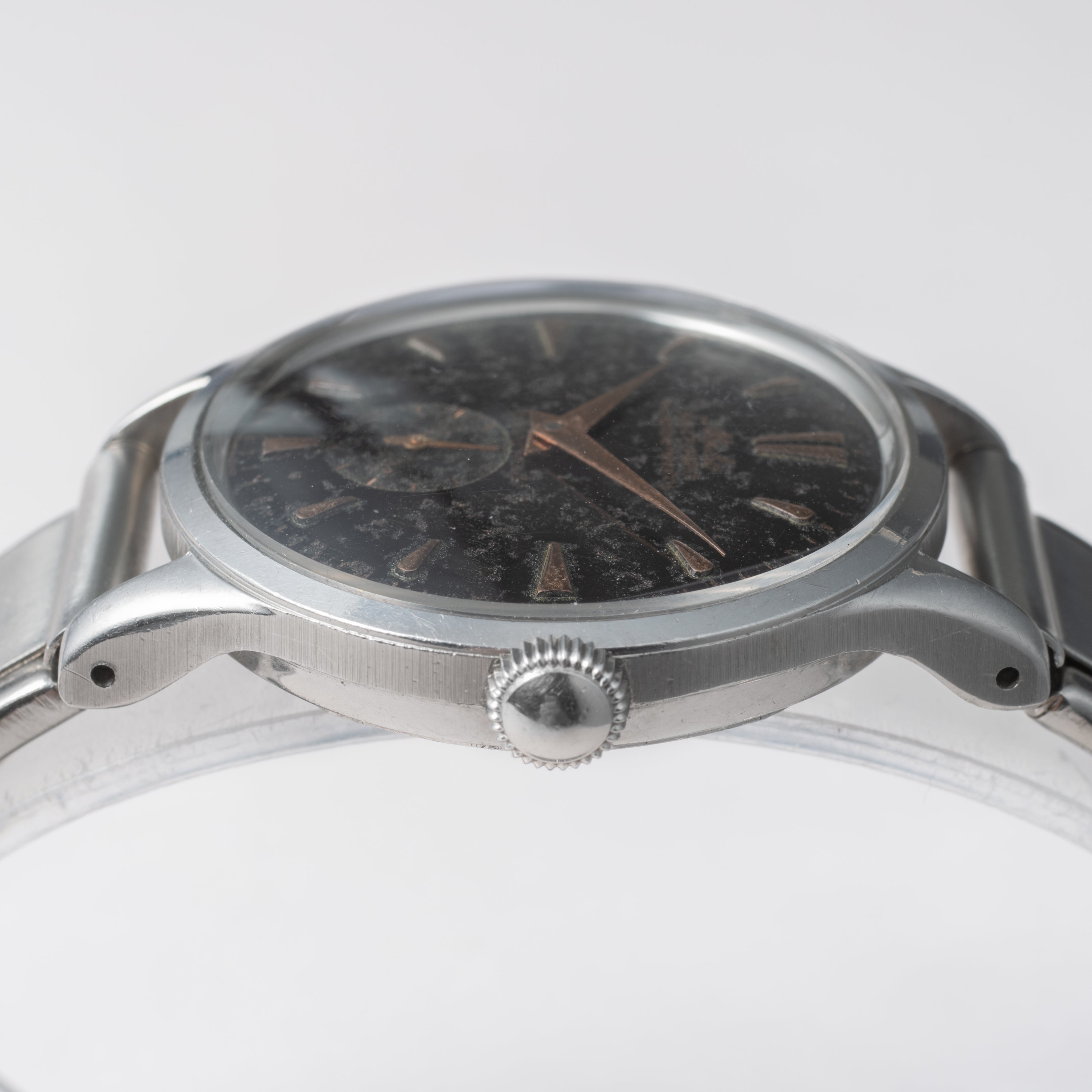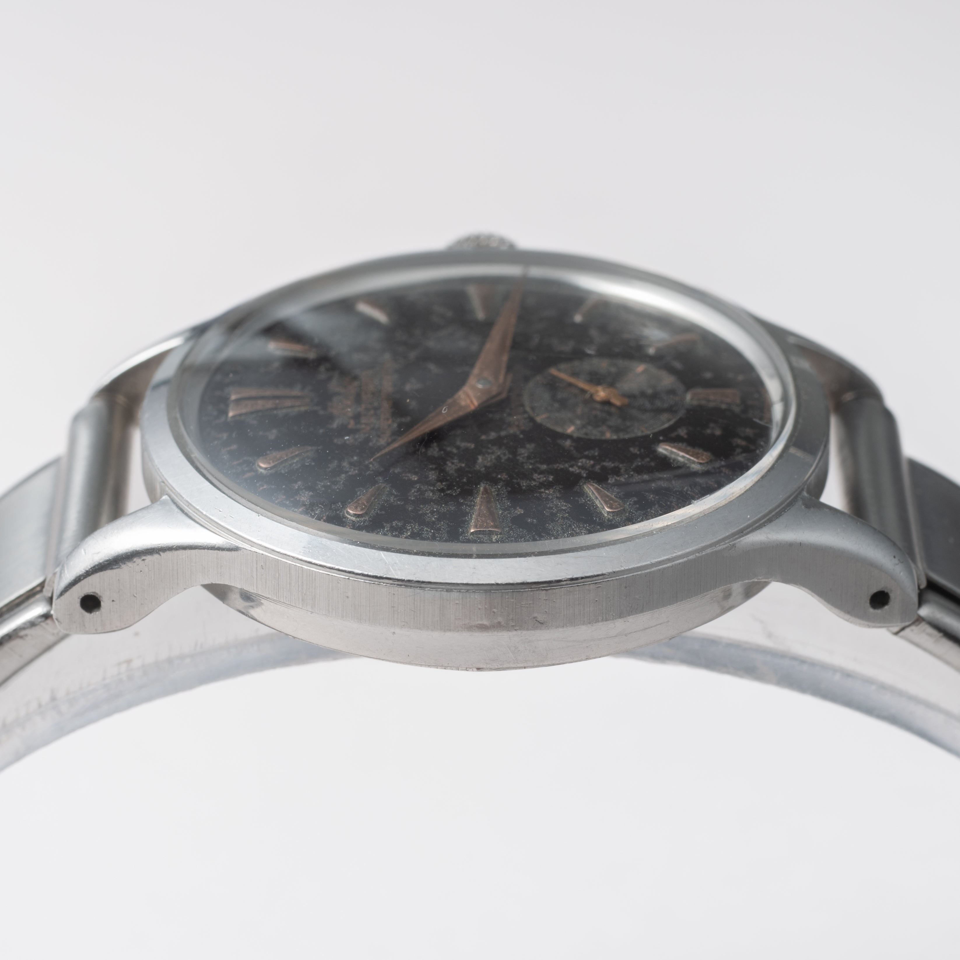 - ヴィンテージ時計の特性上、風防・パッキン・リューズ・バネ棒などの消耗部品は後年メンテナンス過程で交換されている場合がございます。オリジナル性を重視しておりますが、必要に応じて適切な部品にて調整されていますので、よりコレクション性重視のお求めのお客様は事前にご確認ください。