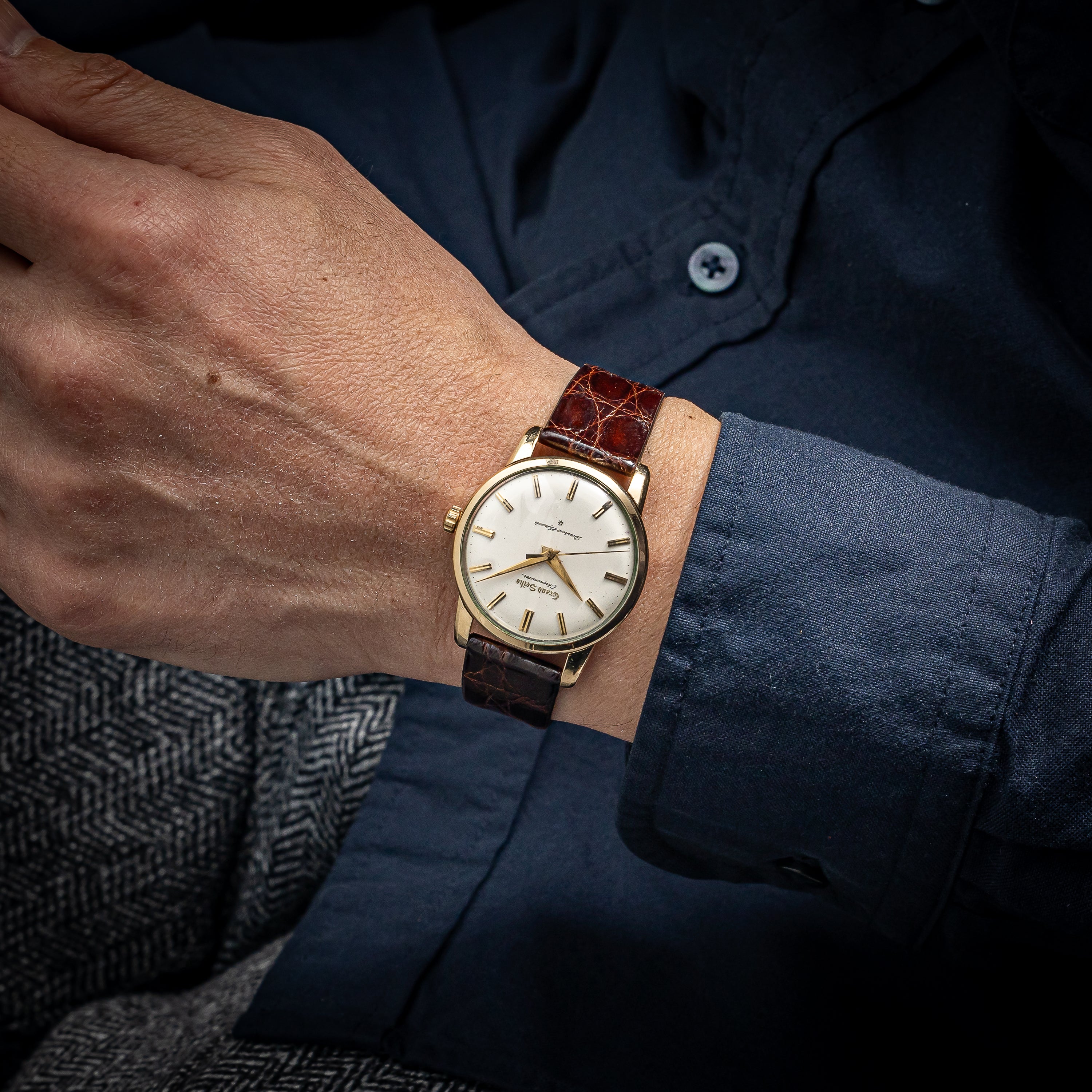 - ヴィンテージ時計の特性上、風防・パッキン・リューズ・バネ棒などの消耗部品は後年メンテナンス過程で交換されている場合がございます。オリジナル性を重視しておりますが、必要に応じて適切な部品にて調整されていますので、よりコレクション性重視のお求めのお客様は事前にご確認ください。