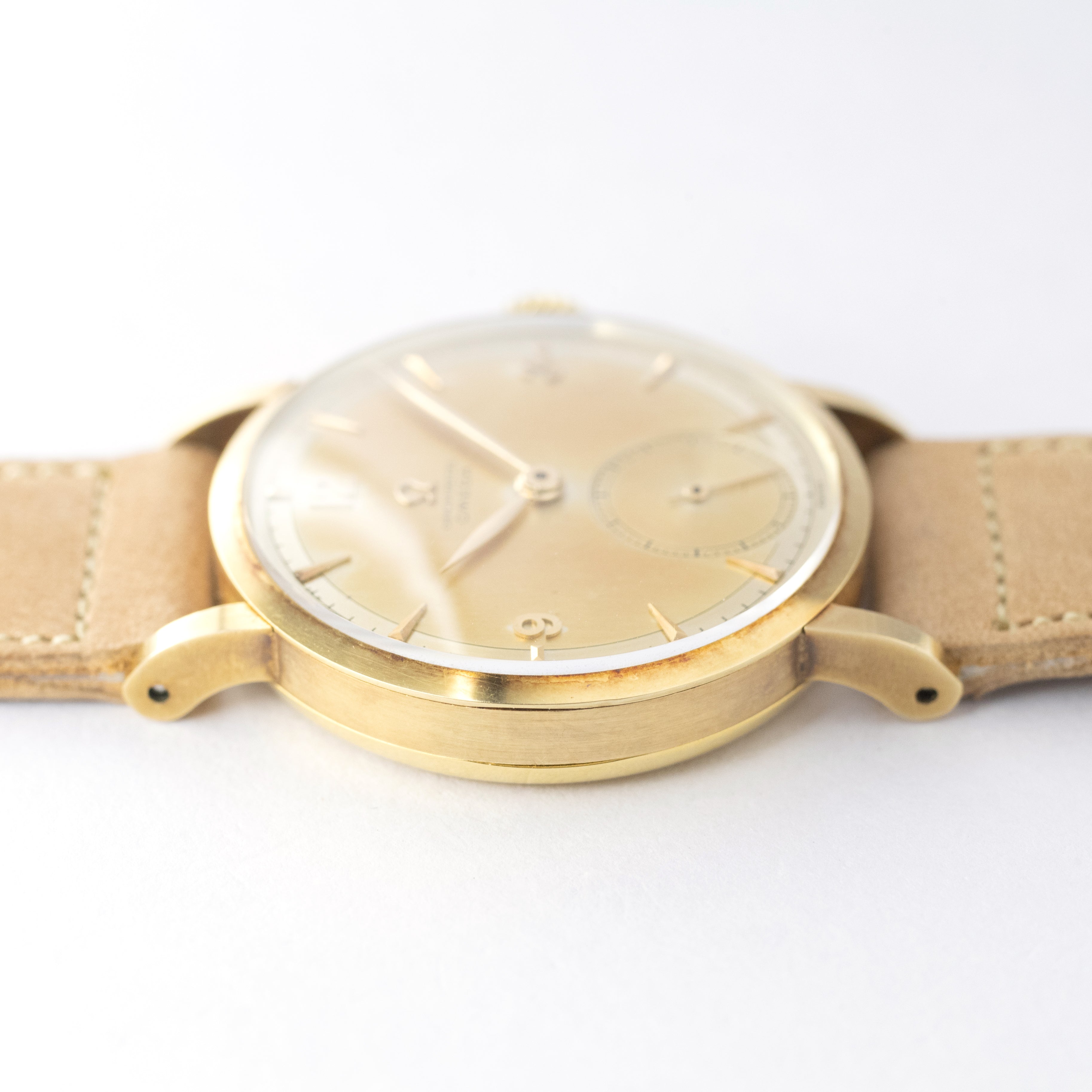 - ヴィンテージ時計の特性上、風防・パッキン・リューズ・バネ棒などの消耗部品は後年メンテナンス過程で交換されている場合がございます。オリジナル性を重視しておりますが、必要に応じて適切な部品にて調整されていますので、よりコレクション性重視のお求めのお客様は事前にご確認ください。