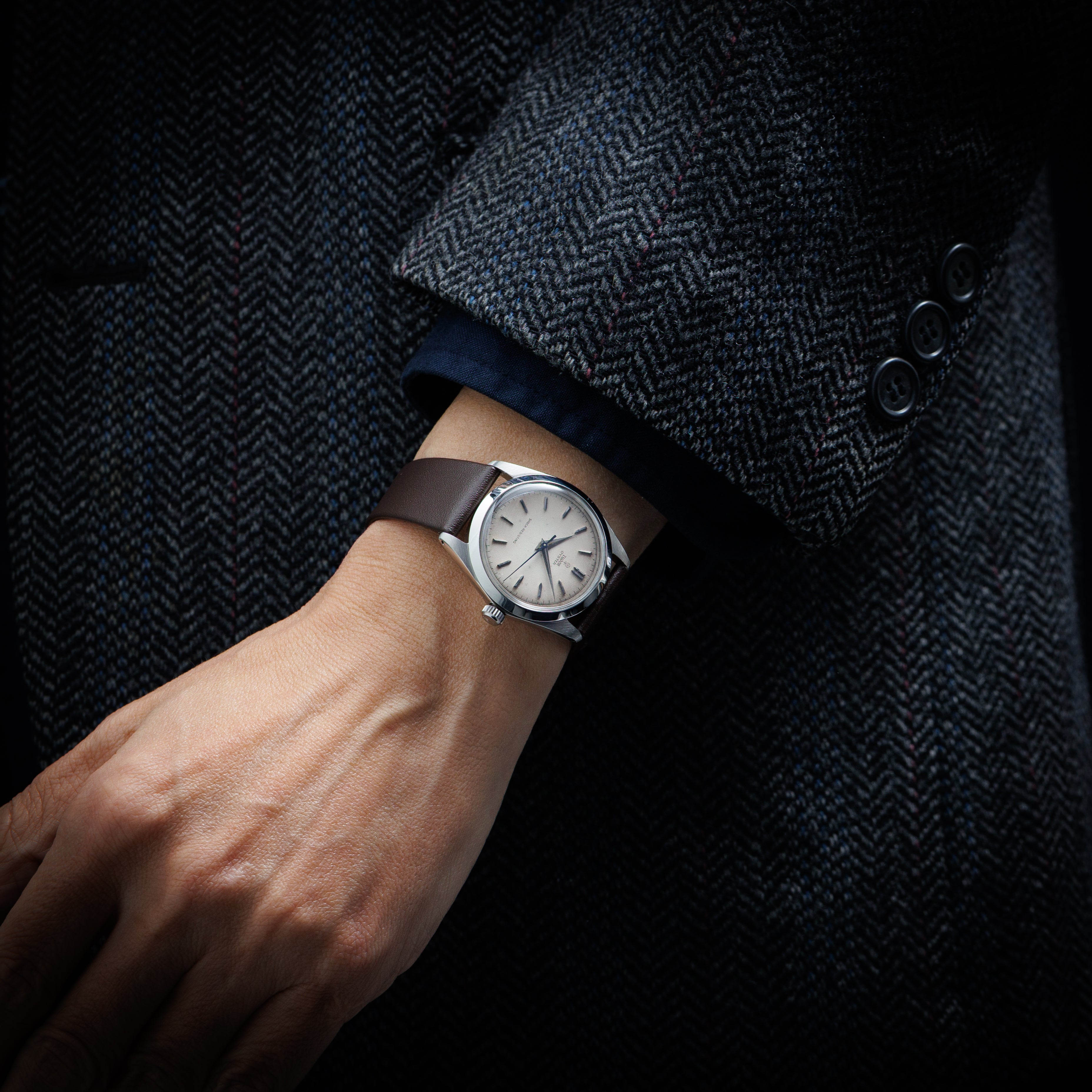 - ヴィンテージ時計の特性上、風防・パッキン・リューズ・バネ棒などの消耗部品は後年メンテナンス過程で交換されている場合がございます。オリジナル性を重視しておりますが、必要に応じて適切な部品にて調整されていますので、よりコレクション性重視のお求めのお客様は事前にご確認ください。