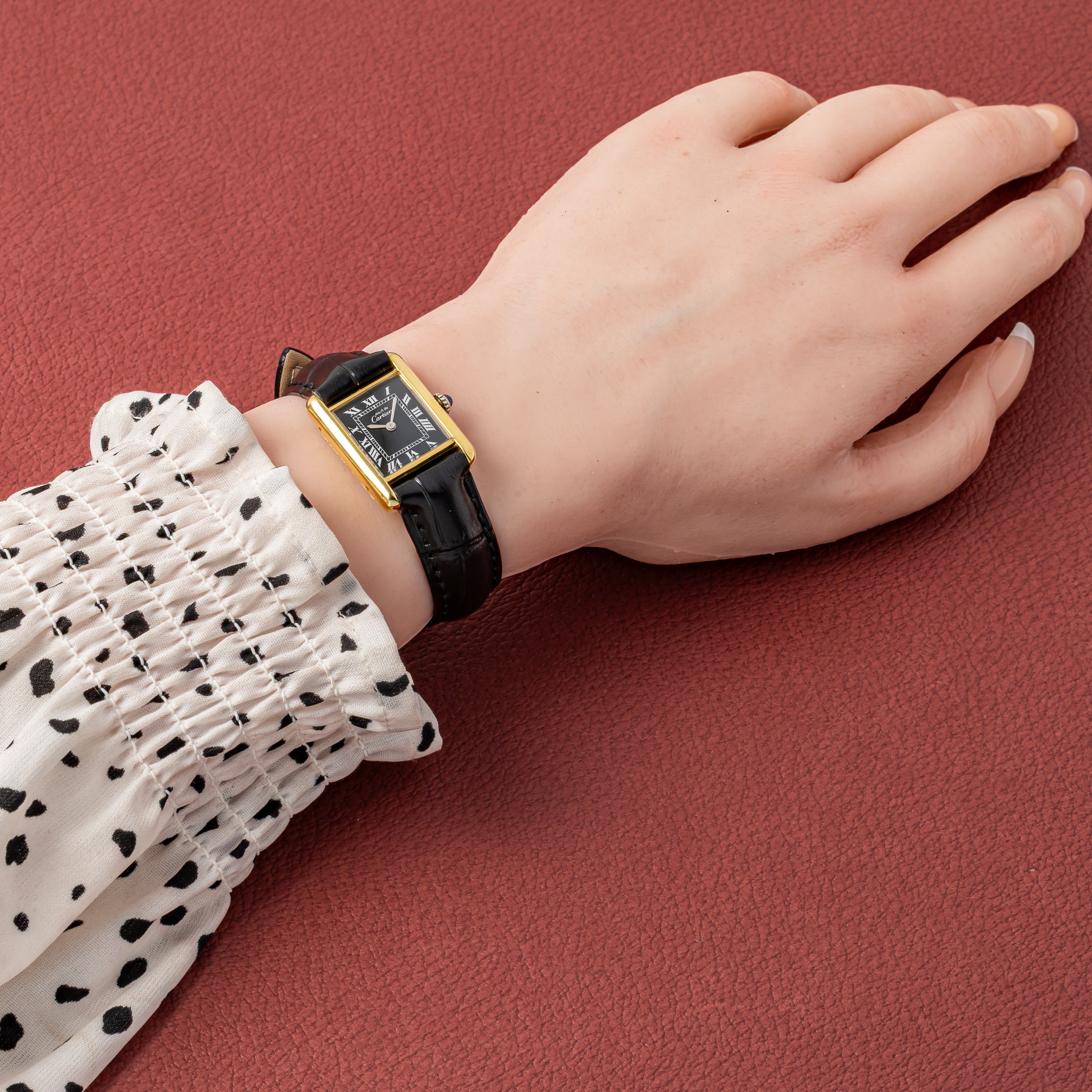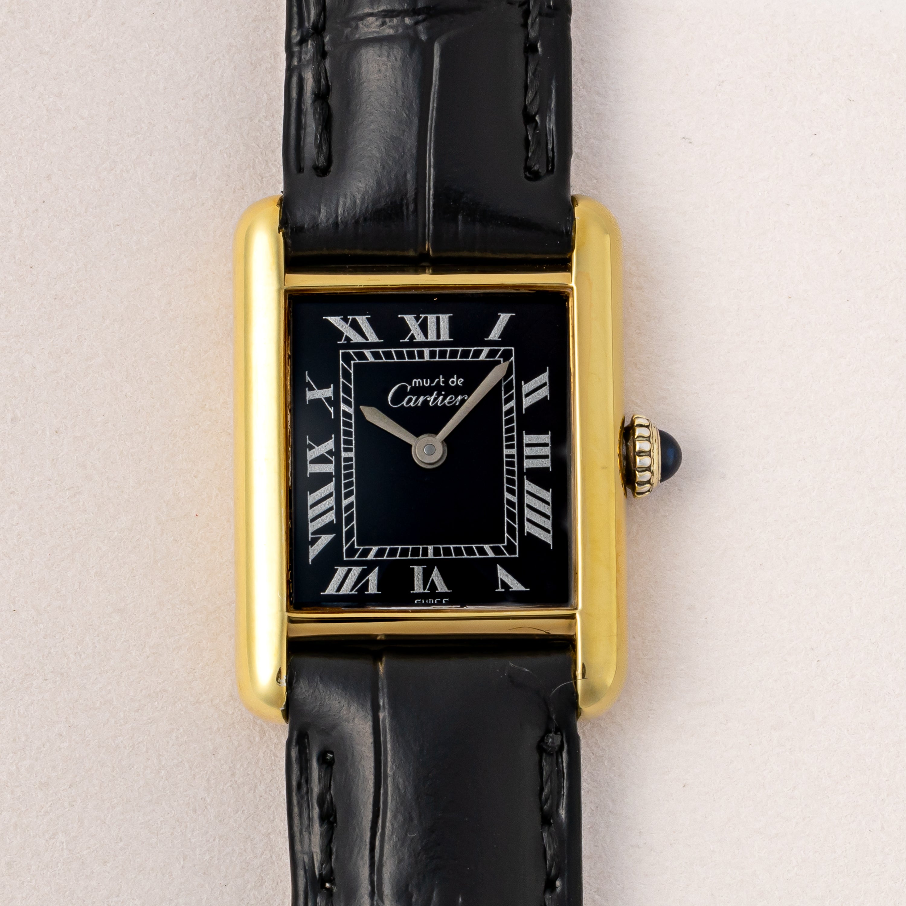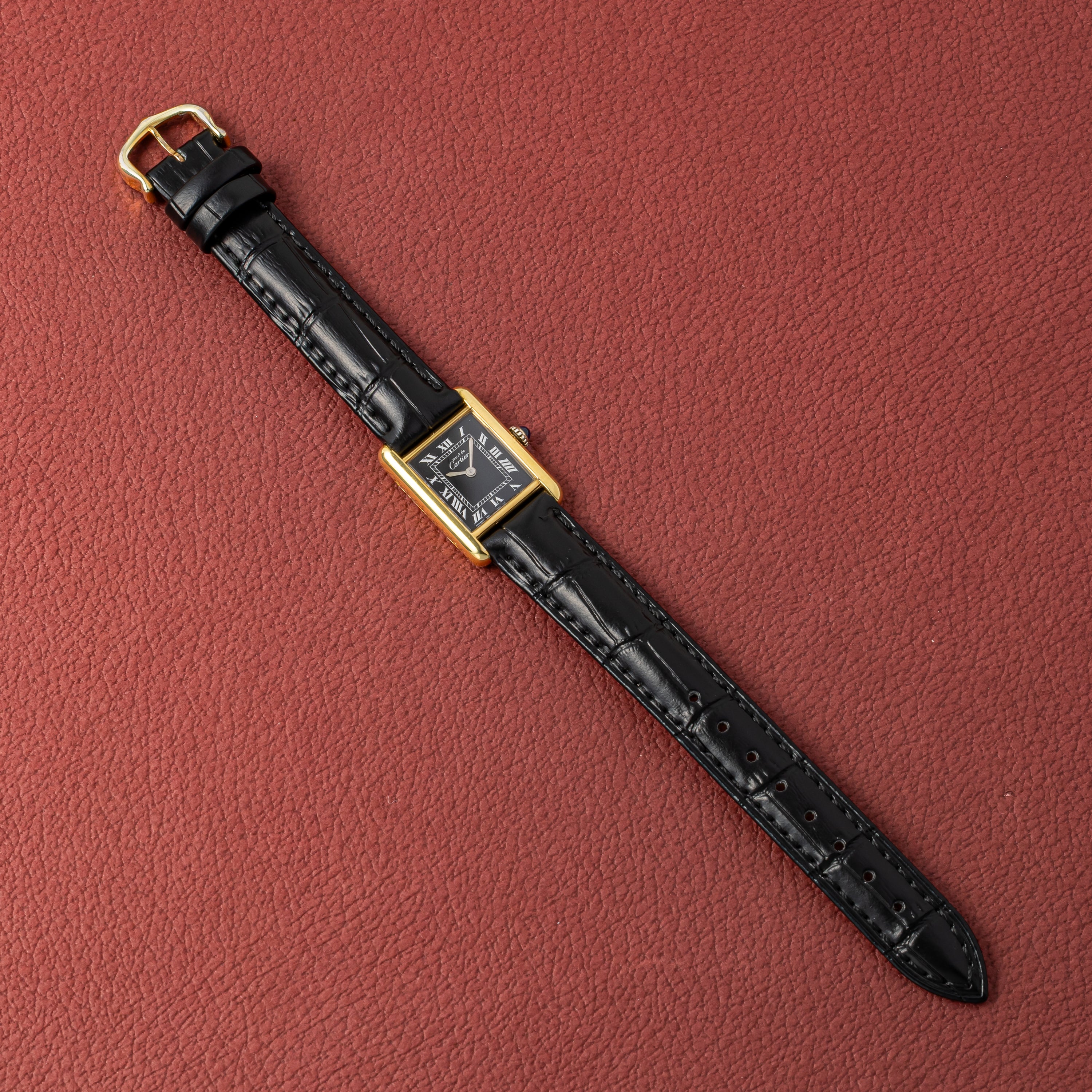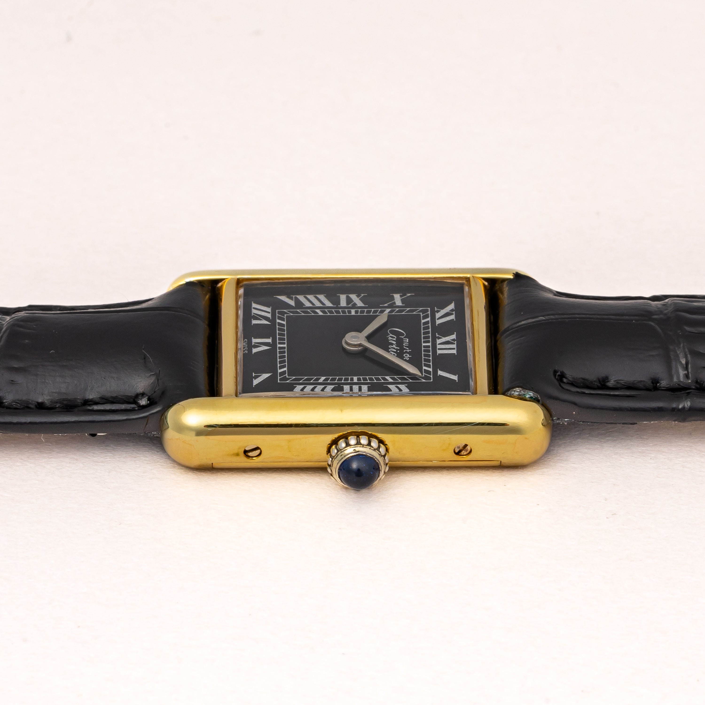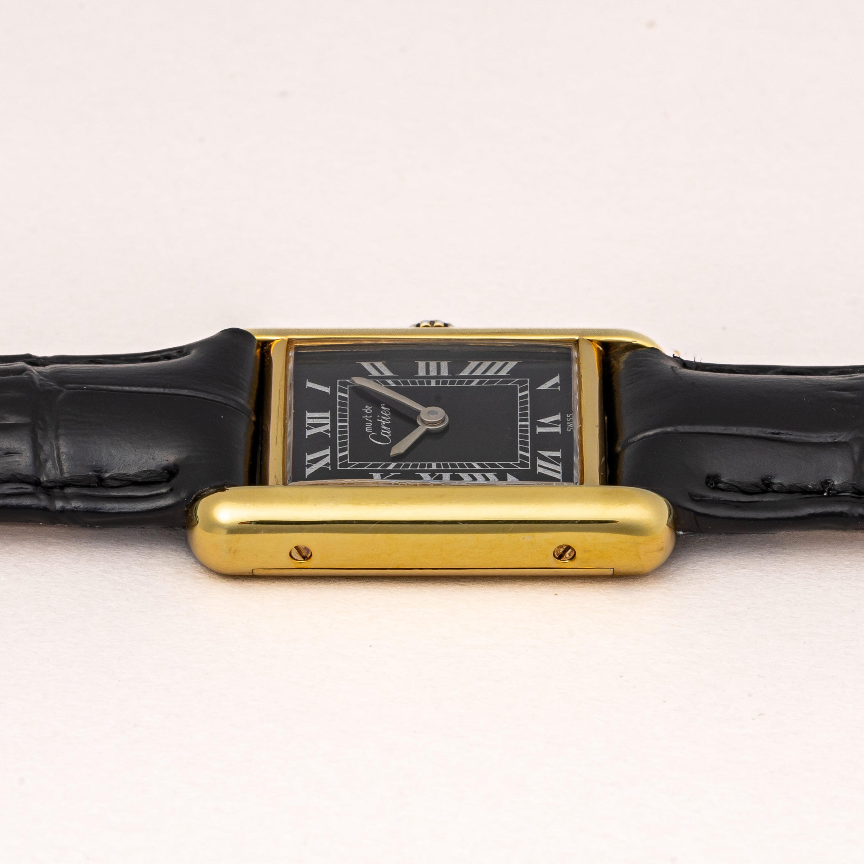 カルティエ マストタンク 1980年代製 SMサイズ ブラックローマンダイヤル 純正尾錠付き