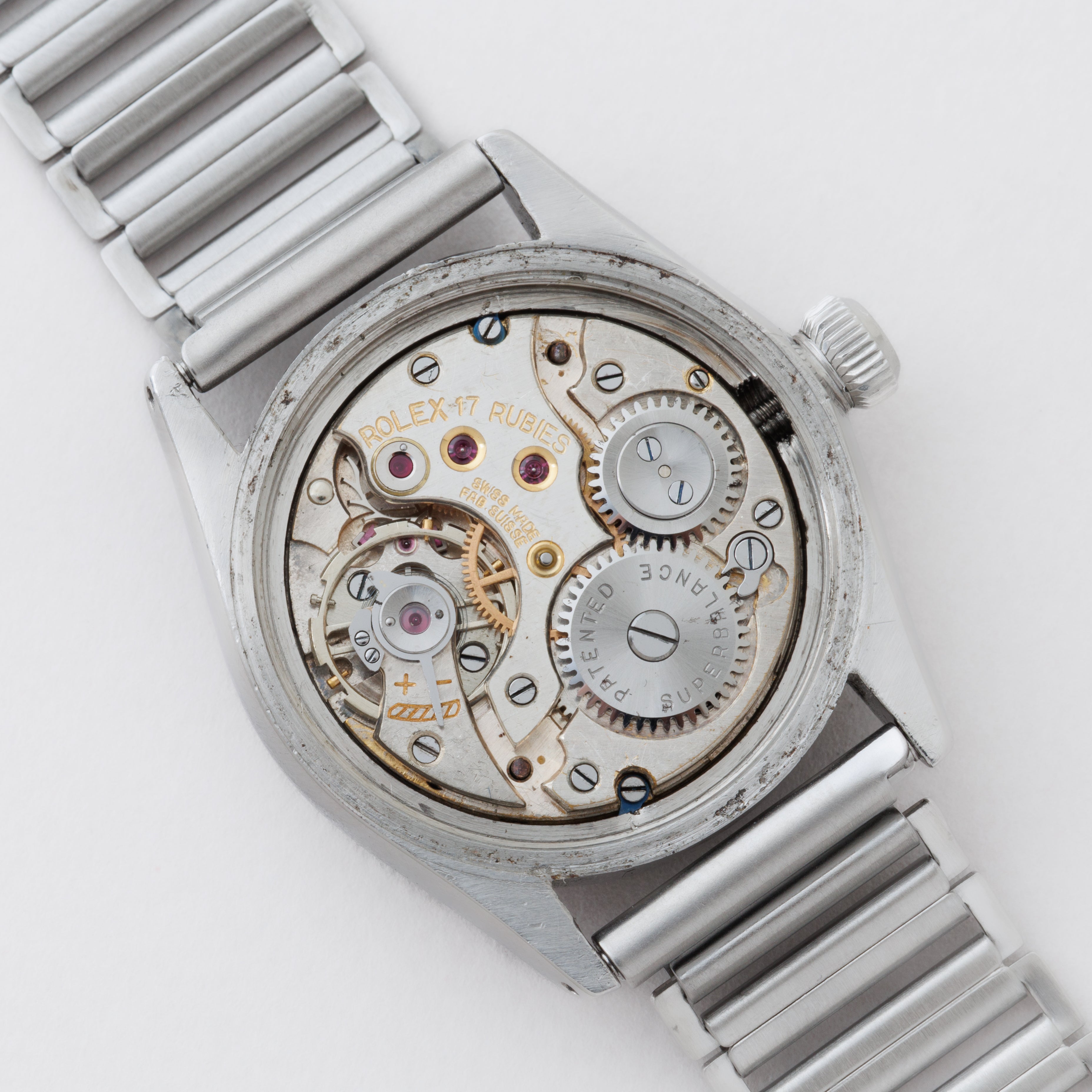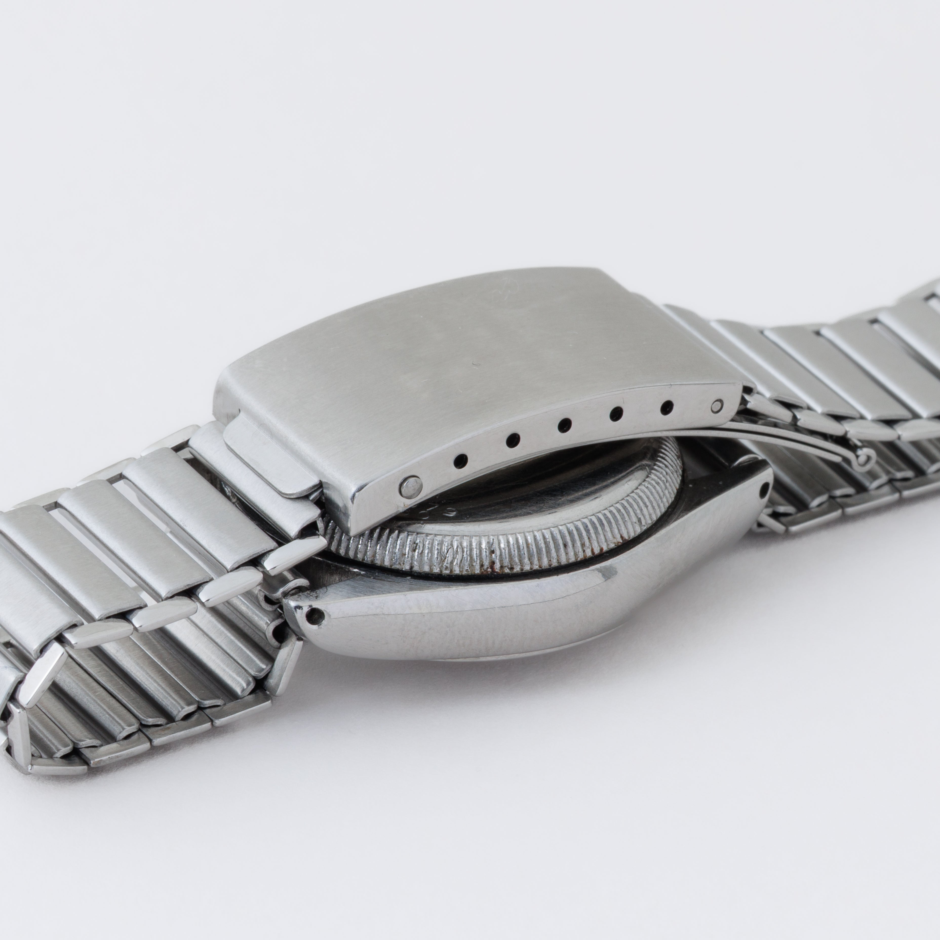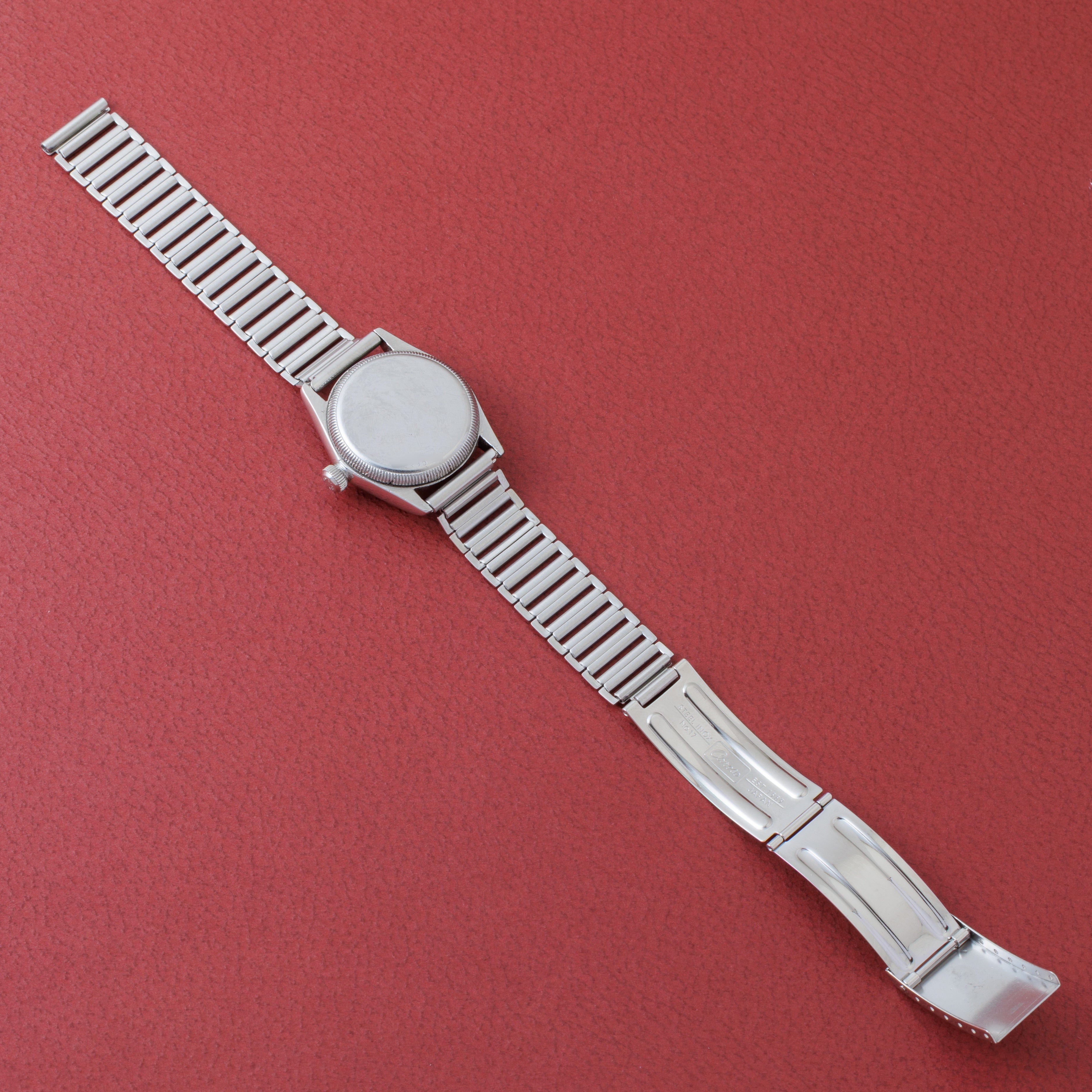 - ヴィンテージ時計の特性上、風防・パッキン・リューズ・バネ棒などの消耗部品は後年メンテナンス過程で交換されている場合がございます。オリジナル性を重視しておりますが、必要に応じて適切な部品にて調整されていますので、よりコレクション性重視のお求めのお客様は事前にご確認ください。