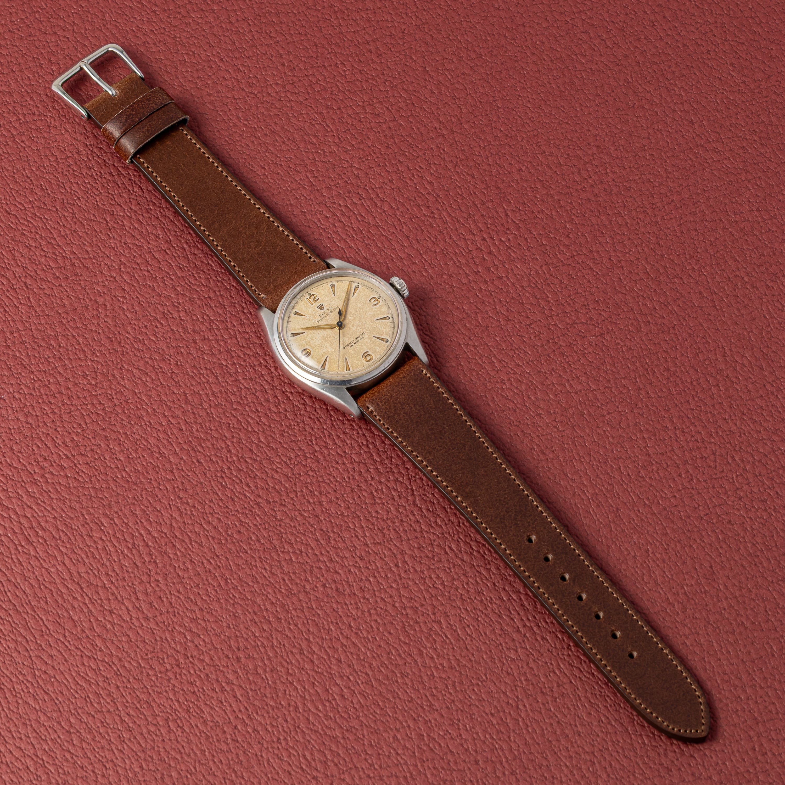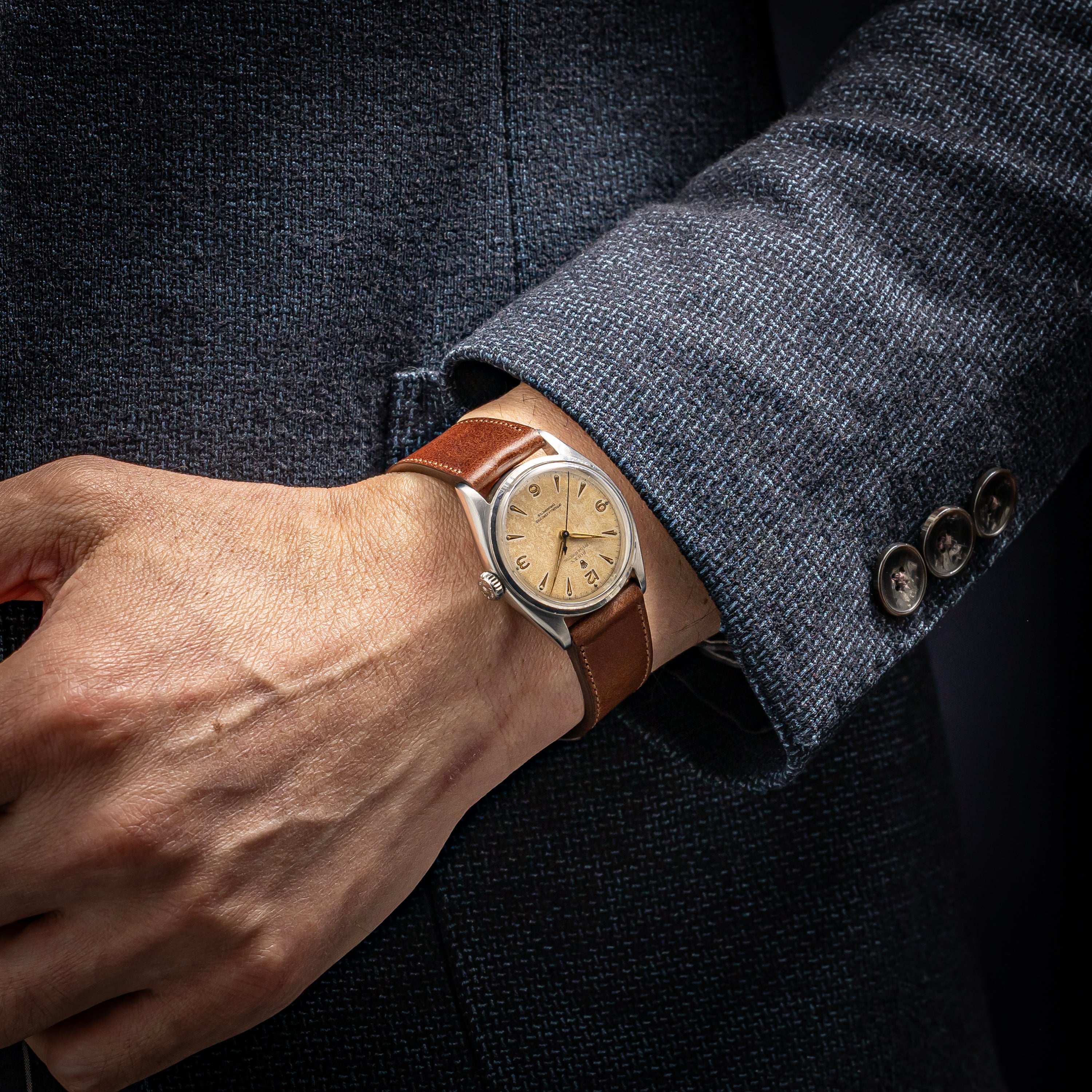 - ヴィンテージ時計の特性上、風防・パッキン・リューズ・バネ棒などの消耗部品は後年メンテナンス過程で交換されている場合がございます。オリジナル性を重視しておりますが、必要に応じて適切な部品にて調整されていますので、よりコレクション性重視のお求めのお客様は事前にご確認ください。