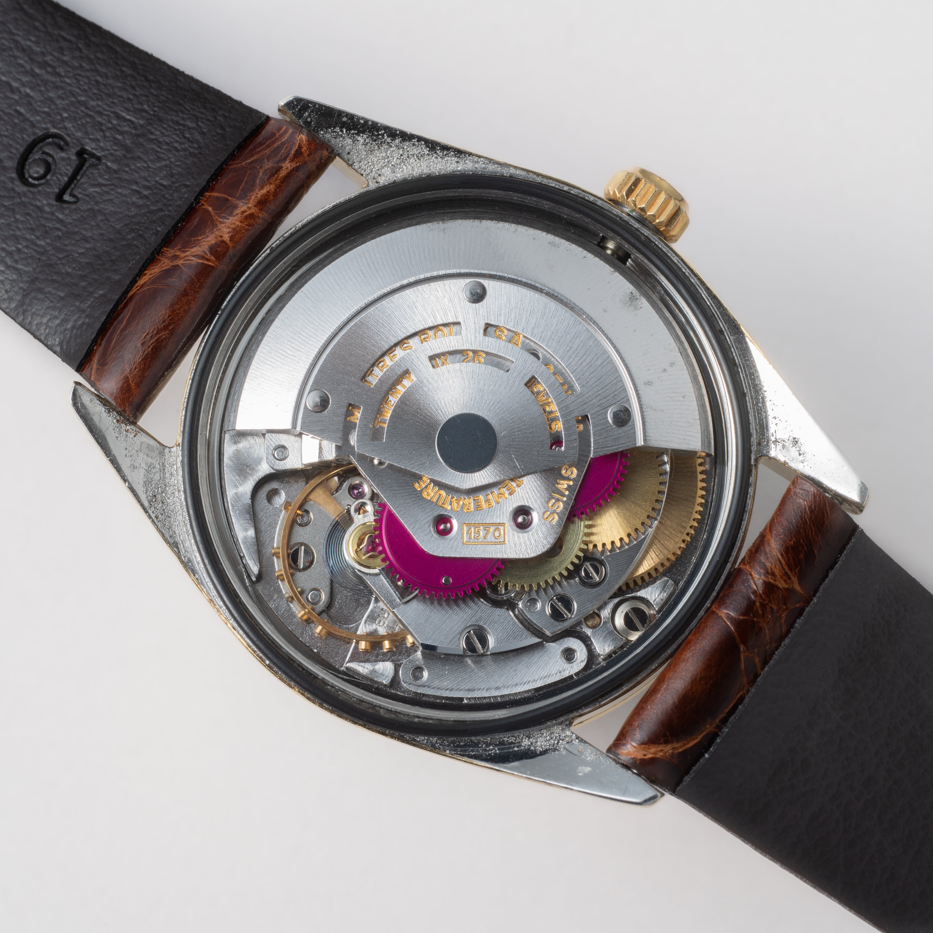 - ヴィンテージ時計の特性上、風防・パッキン・リューズ・バネ棒などの消耗部品は後年メンテナンス過程で交換されている場合がございます。オリジナル性を重視しておりますが、必要に応じて適切な部品にて調整されていますので、よりコレクション性重視のお求めのお客様は事前にご確認ください。