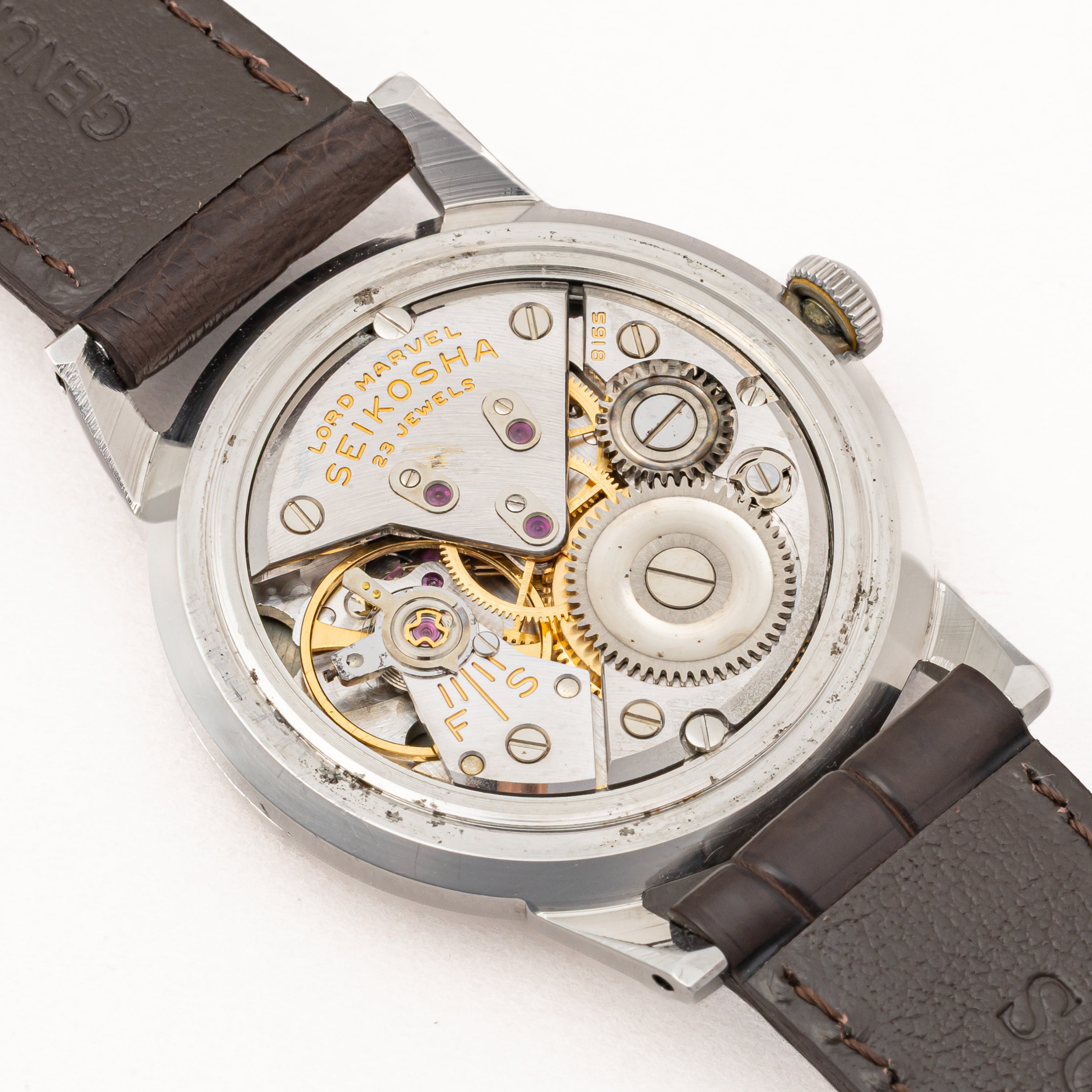 - ヴィンテージ時計の特性上、風防・パッキン・リューズ・バネ棒などの消耗部品は後年メンテナンス過程で交換されている場合がございます。オリジナル性を重視しておりますが、必要に応じて適切な部品にて調整されていますので、よりコレクション性重視のお求めのお客様は事前にご確認ください。