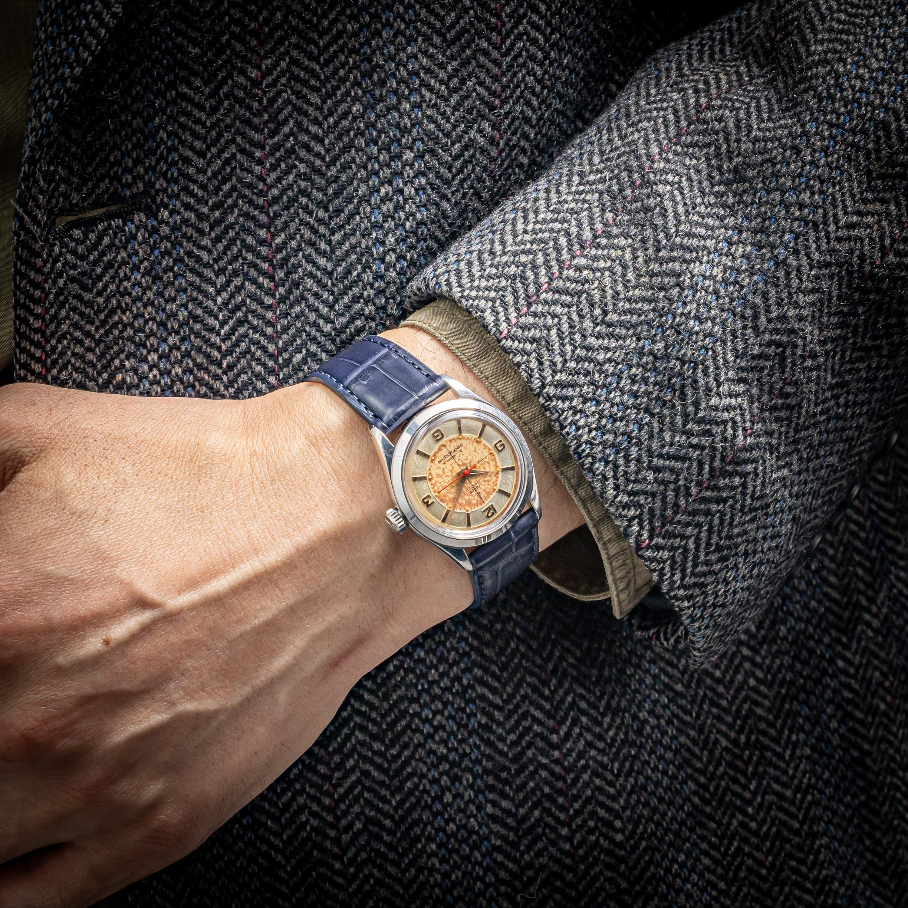 - ヴィンテージ時計の特性上、風防・パッキン・リューズ・バネ棒などの消耗部品は後年メンテナンス過程で交換されている場合がございます。オリジナル性を重視しておりますが、必要に応じて適切な部品にて調整されていますので、よりコレクション性重視のお求めのお客様は事前にご確認ください。
