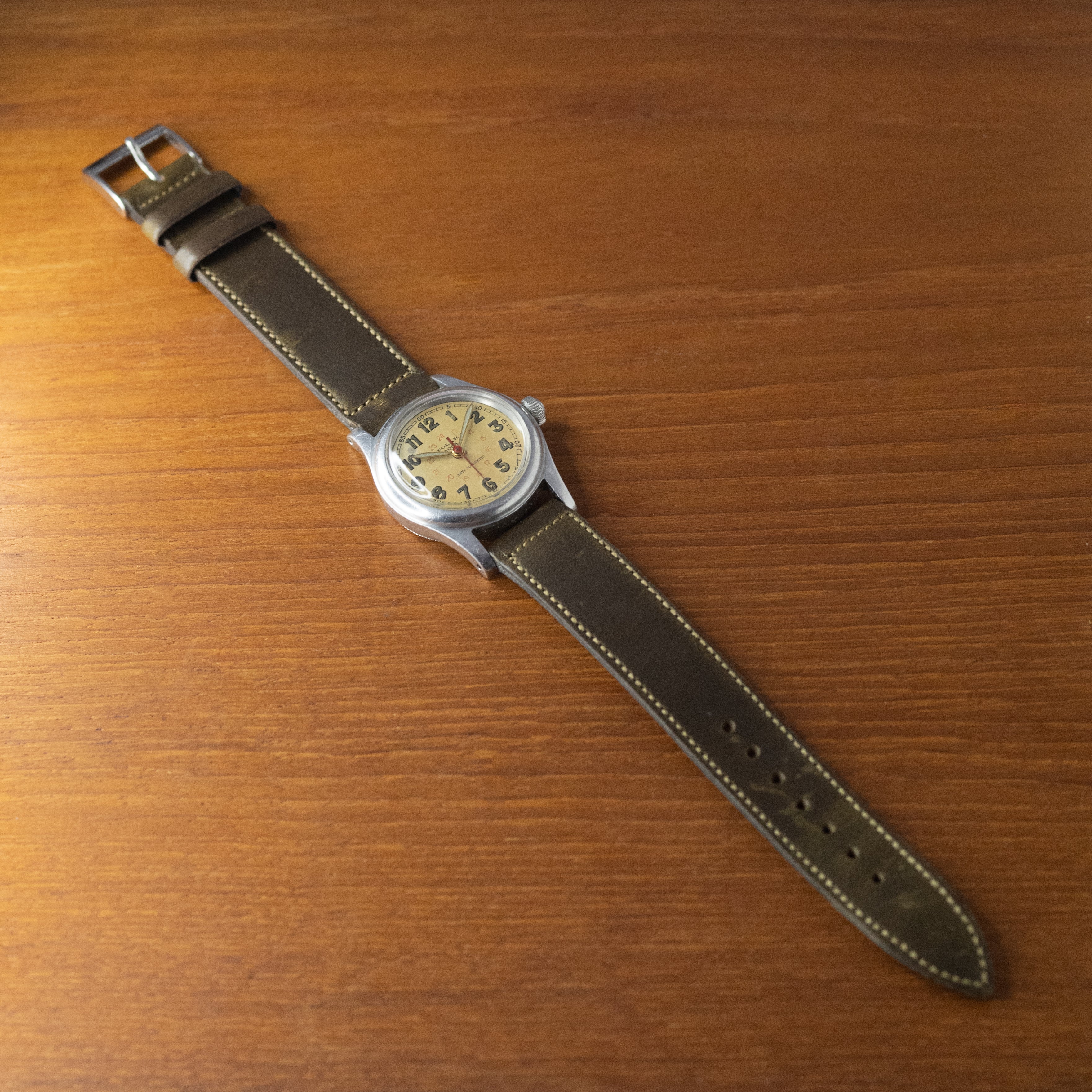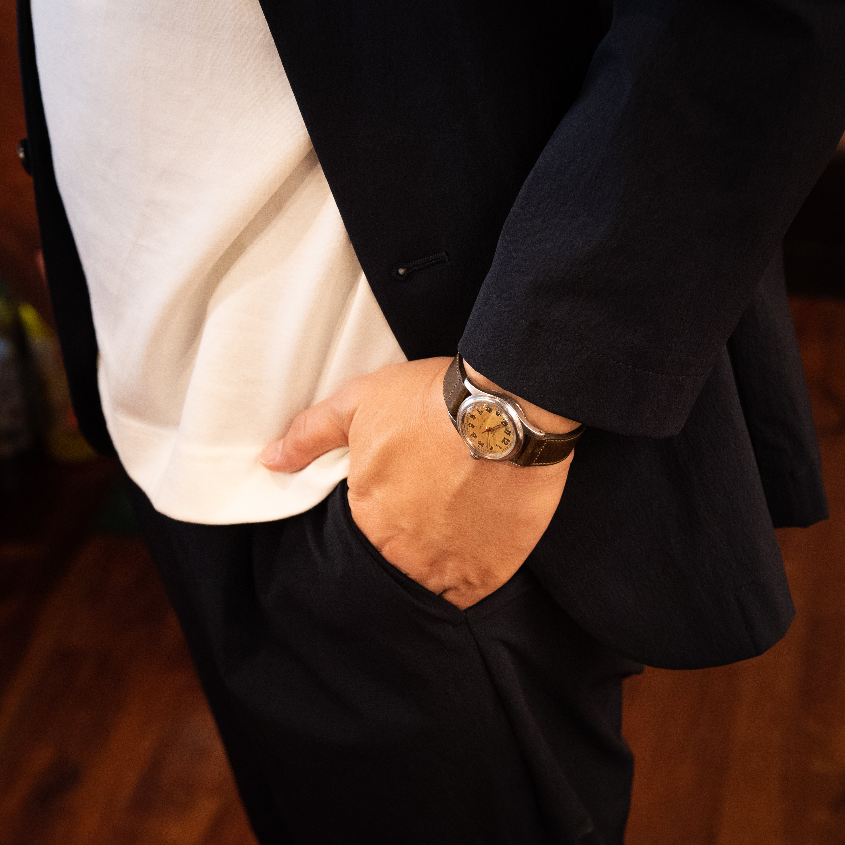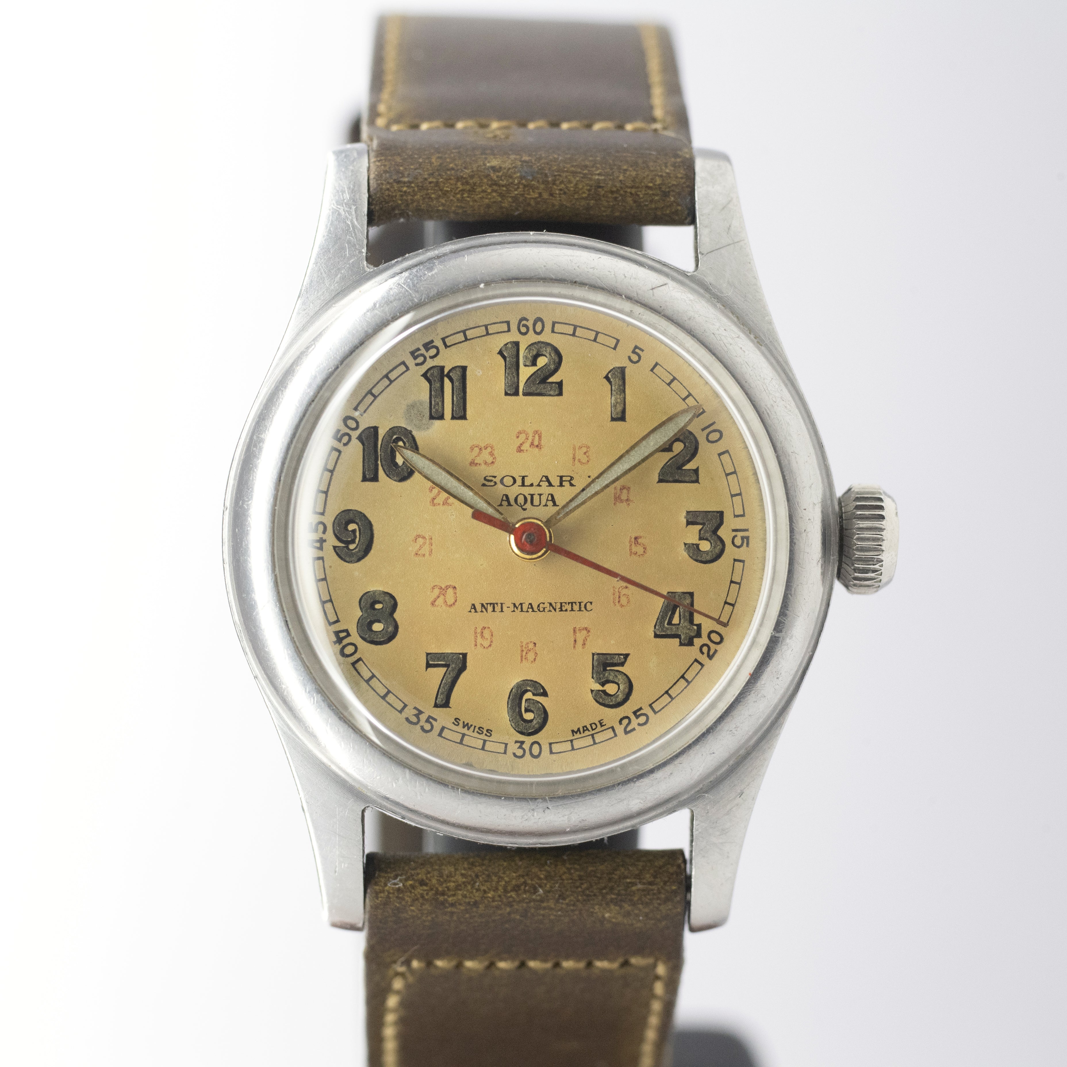 - ヴィンテージ時計の特性上、風防・パッキン・リューズ・バネ棒などの消耗部品は後年メンテナンス過程で交換されている場合がございます。オリジナル性を重視しておりますが、必要に応じて適切な部品にて調整されていますので、よりコレクション性重視のお求めのお客様は事前にご確認ください。