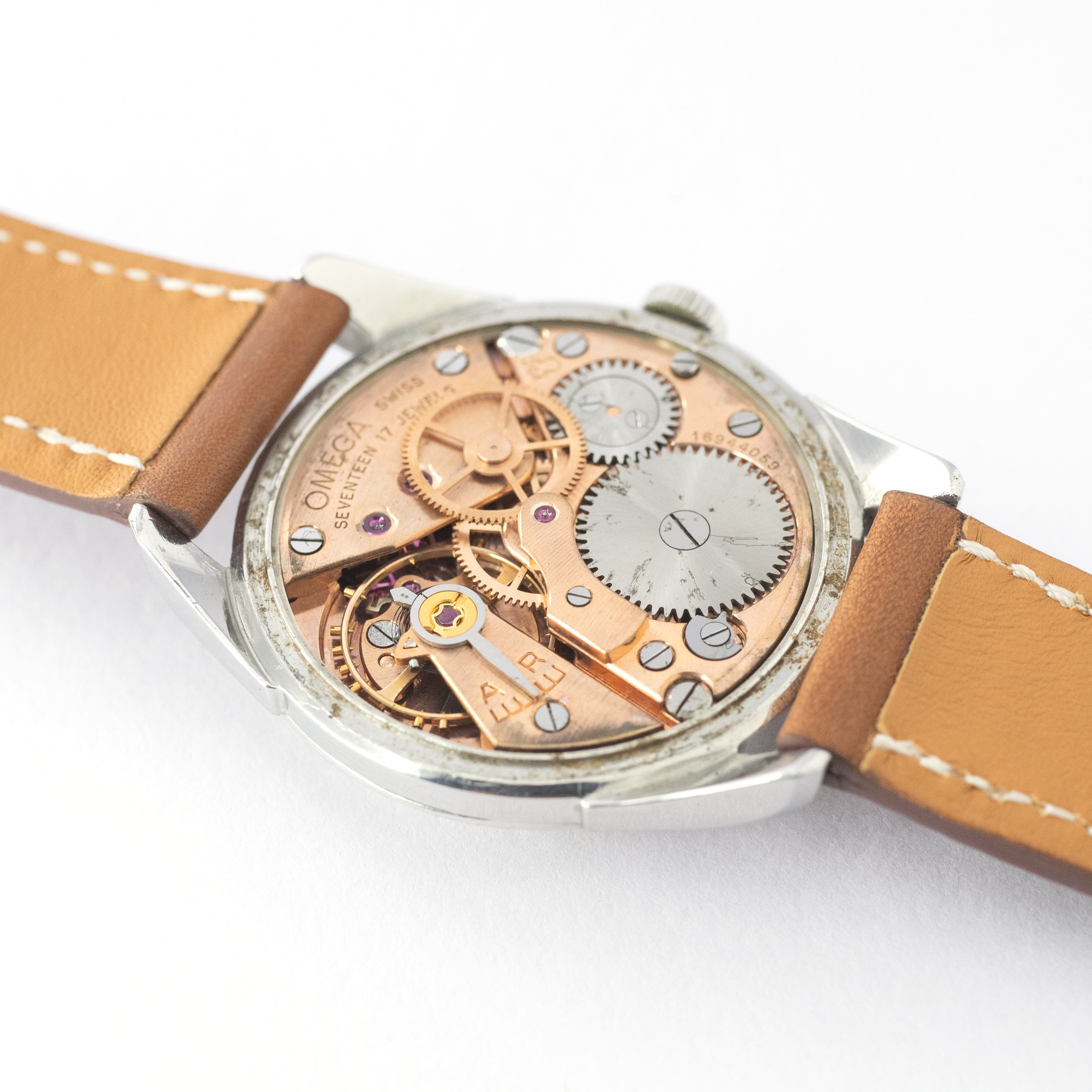 - ヴィンテージ時計の特性上、風防・パッキン・リューズ・バネ棒などの消耗部品は後年メンテナンス過程で交換されている場合がございます。オリジナル性を重視しておりますが、必要に応じて適切な部品にて調整されていますので、よりコレクション性重視のお求めのお客様は事前にご確認ください。