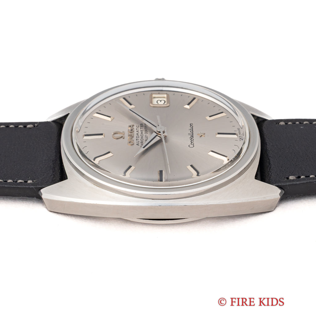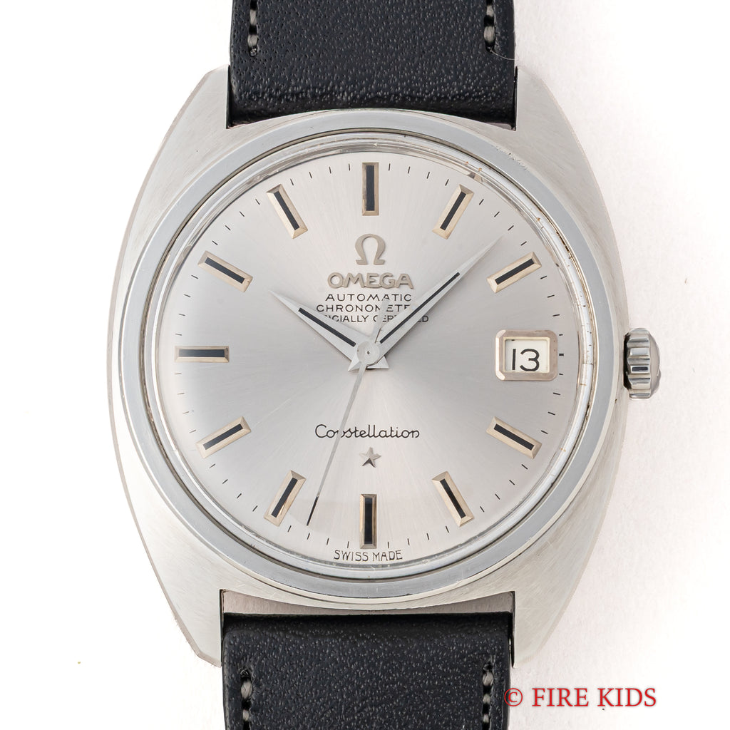 オメガ コンステレーション ジェンタ初期型 ドーフィンハンド1967年製 Ref.168.017です。 ジェラルド・ジェンタデザインのコンステレーションでも初期型モデルで、ドーフィンハンドになっています。文字盤はシミ等無く綺麗です。ケースは小傷が見られますが大きなダメージはありません。手巻きや針回しの操作はスムースです。ベルトはファイアーキッズオリジナルクロコダイルのブッテーロレザーベルトが取り付けられています。