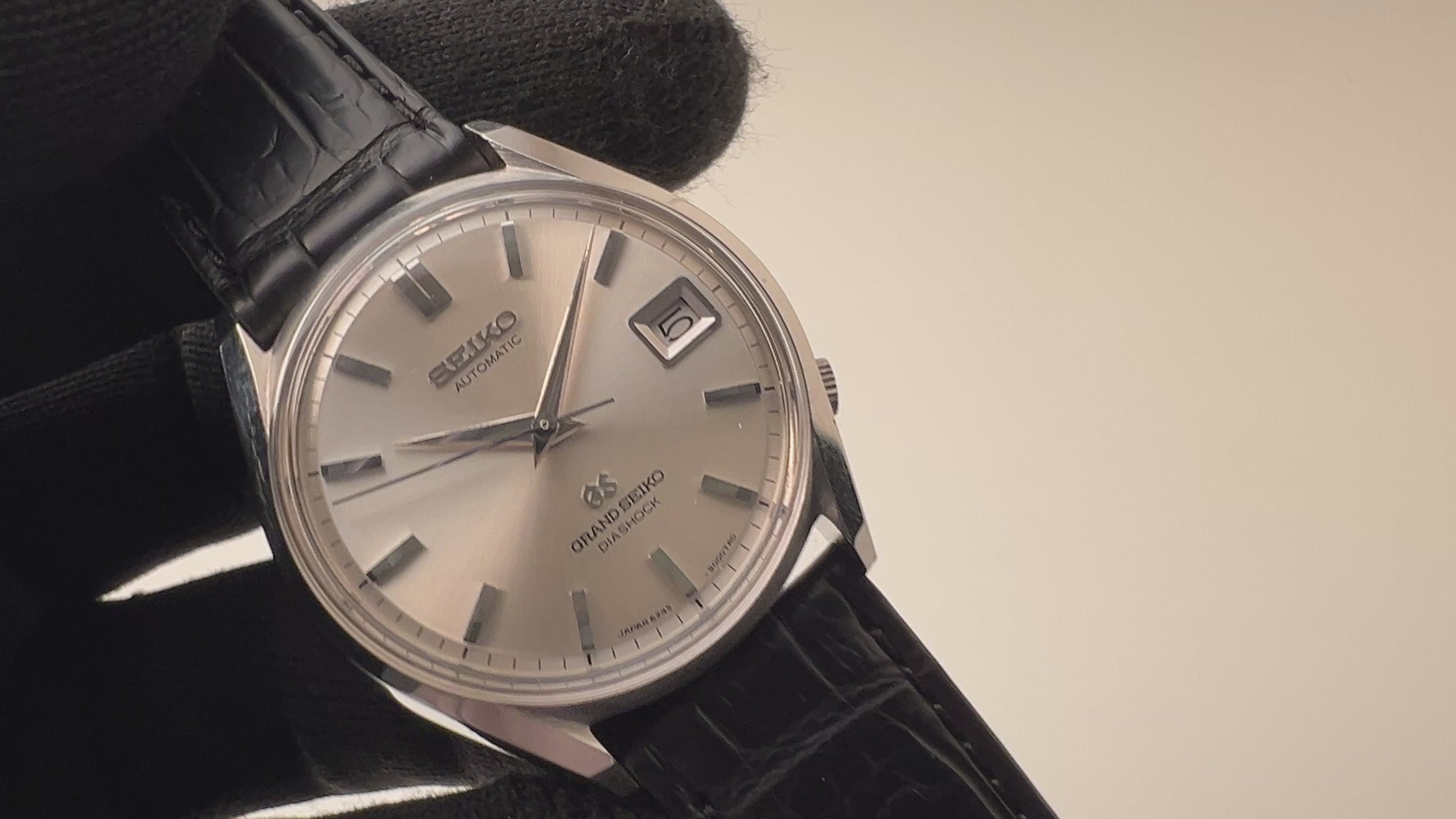 1968年製の62グランドセイコー 自動巻きモデルです。グランドセイコー初の自動巻きで、それまでの手巻きグランドセイコーとは全く違うケースデザインで4時位置にリューズを配置したスッキリとデザインに仕上がっています。1960年代後半ハイビート化されて行く時代背景もあり約2年間という短い生産期間の為希少なモデルになります。ムーブメントは自動巻きのCal.6245Aを搭載、自動巻きのみですが、マジックレバーを採用して巻き上げの効率は良い機械になります。ケースは小傷が見られますが大きなダメージはありません。裏ブタのメダリオンもキレイに残っています。針回しの操作はスムーズです。ベルトはファイアーキッズオリジナルクロコダイル革ベルトが取り付けてあります。