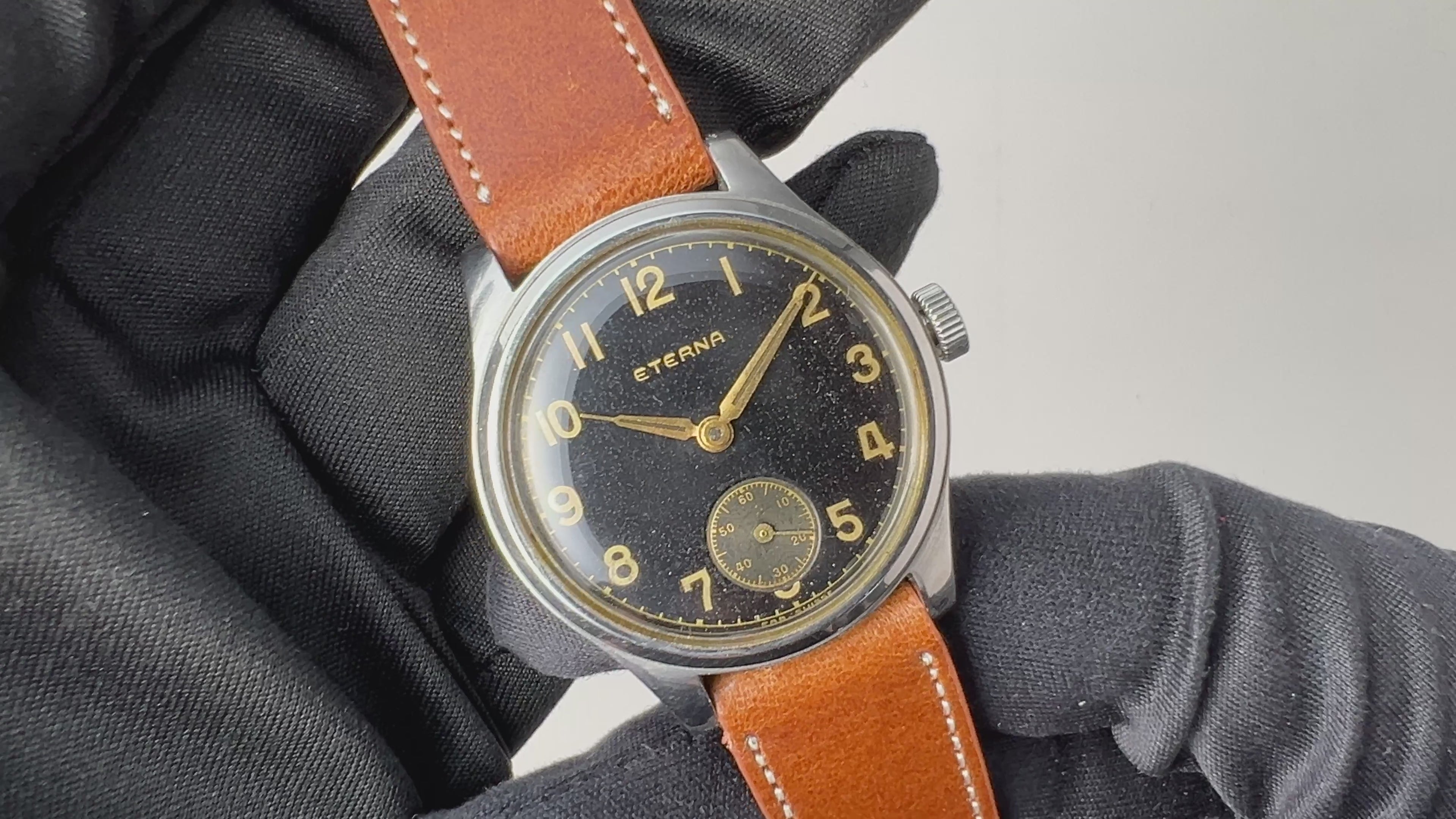 エテルナ ラウンドケース 1940年代製 ギルトダイヤル 手巻 Cal.520の入荷になります。艶感のしっかり残ったブラックギルトダイヤルは、光の当たり方や角度によって薄くブラウン掛かった抜群の雰囲気です。小振りな30㎜(リューズ別)サイズながら存在感があります。三つ爪のスクリューバックケースもポイントです。文字盤やケースは年代なりの経年や小傷はありますがトータルでコンディションの良さを感じる良い個体です。手巻きや針回しはスムーズです。ベルトはファイアーキッズオリジナル、イタリアンレザーのブッテーロ(裏面ラバー)革ベルトを合わせています。