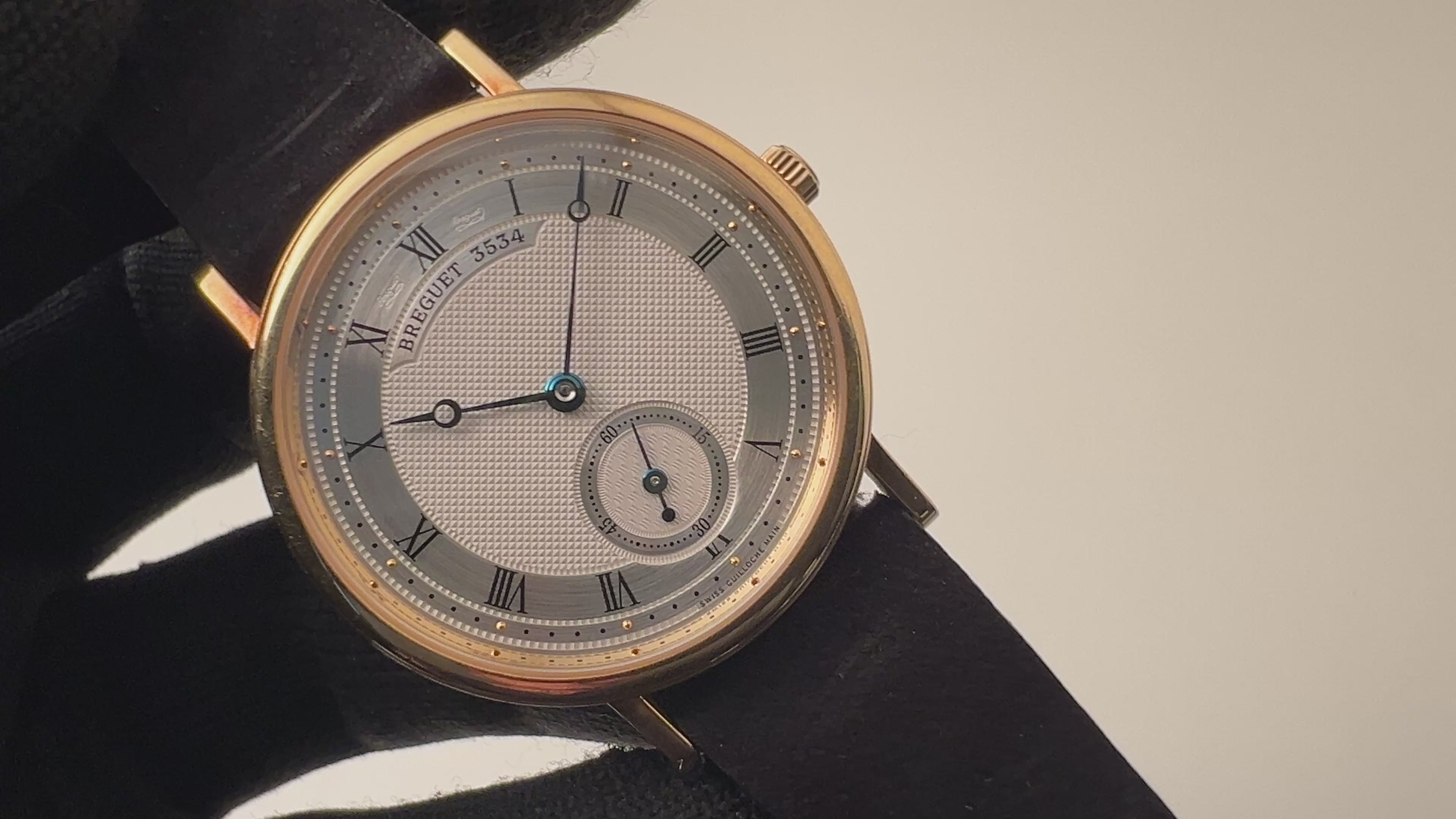 ブレゲ クラシック パワーリザーブ 18金無垢 1997年製 Ref.5907前期型 手巻き式 Cal.510DR 純正YG尾錠 箱、ギャラ付の入荷になります。ブレゲらしいクラシカルなツートーンのローマンダイヤルにローマ数字の、ブルースチールのブレゲ針34.5㎜(リューズ別)の使いやすいサイズ感が魅力です。Cal.510を搭載する前期型でリューズが小さい最初期型となります。高精度の8振動手巻き式、72時間のパワーリザーブでインジケーターはスケルトンバックの方に取り付けられています。文字盤はシミ等無く綺麗です。ケースは小傷が見られますが大きなダメージはありません。手巻きや針回しの操作はスムースです。ベルトはジャンクロードペランで純正の金無垢尾錠が取り付けられています。箱、ギャラ付になります。