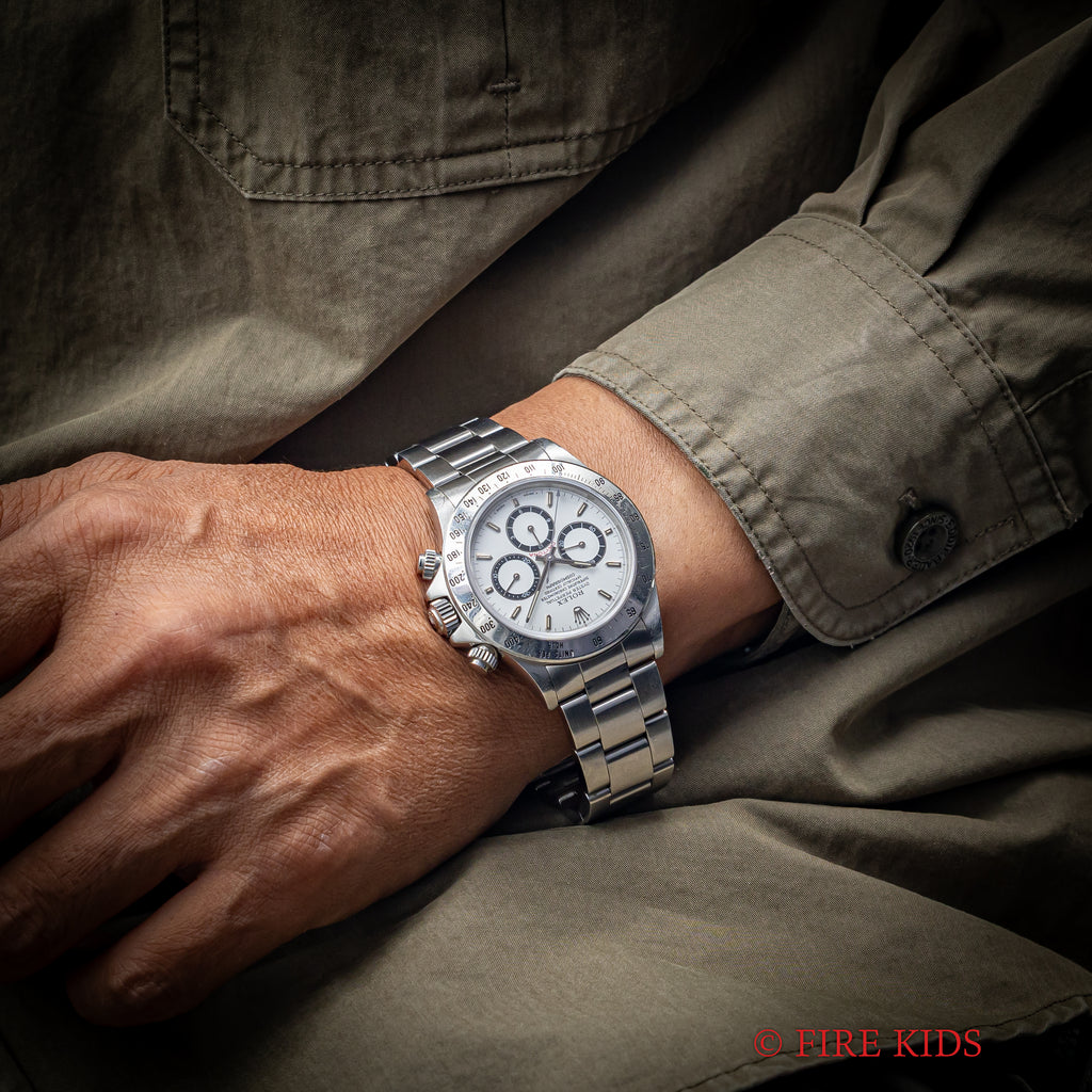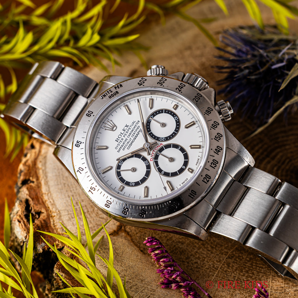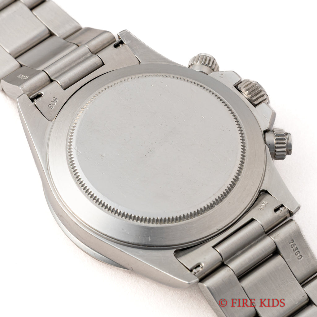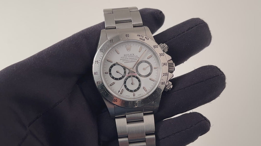 ロレックス デイトナ 1991年製 Ref.16520 ホワイト 逆6ダイヤル シングルバックル オールトリチウム メーカーサービスカード付の入荷になります。ダイヤル6時位置の12時間積算系の6が反転して9に見えることから通称逆6と呼ばれる人気の初期仕様です。オールトリチウムの個体で、ダイヤルは若干の経年はありますが大きなダメージはありません。ケースは小傷や多少の磨きは感じますが特筆すべきダメージは無く、実用派の方にとっては良い個体かと思います。ムーブメントはゼニスのエルプリメロCal.400ベースのCal.4030を搭載、振動数を36000振動から28800振動にすることで、耐久性を高めています。手巻きや針回し、クロノグラフの操作はスムースです。ベルトは純正シングルバックルブレス78360/FF503がフルコマで取り付けてあります。ロレックスのサービスカード付で2027年4月迄の保証が残っています。