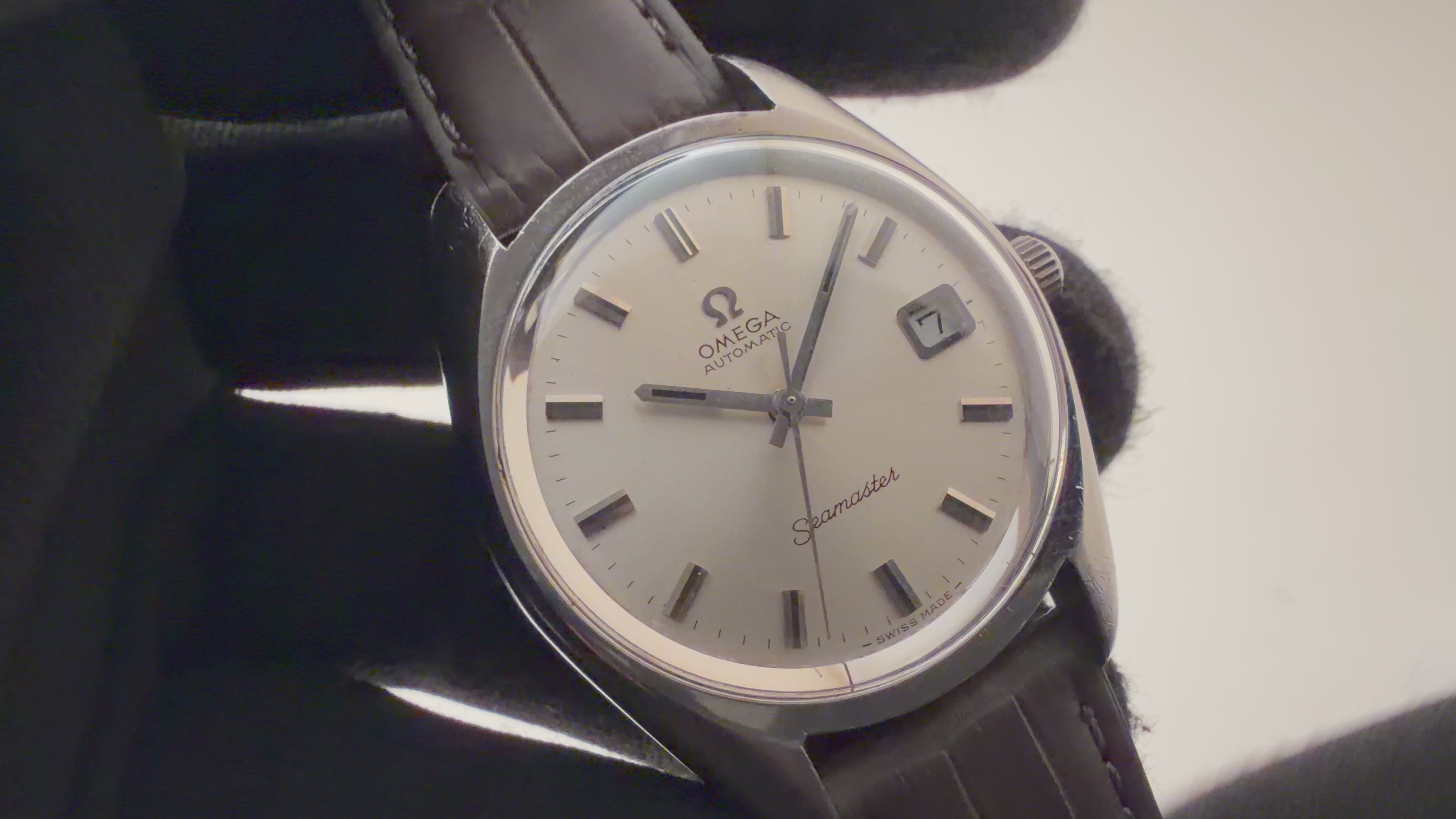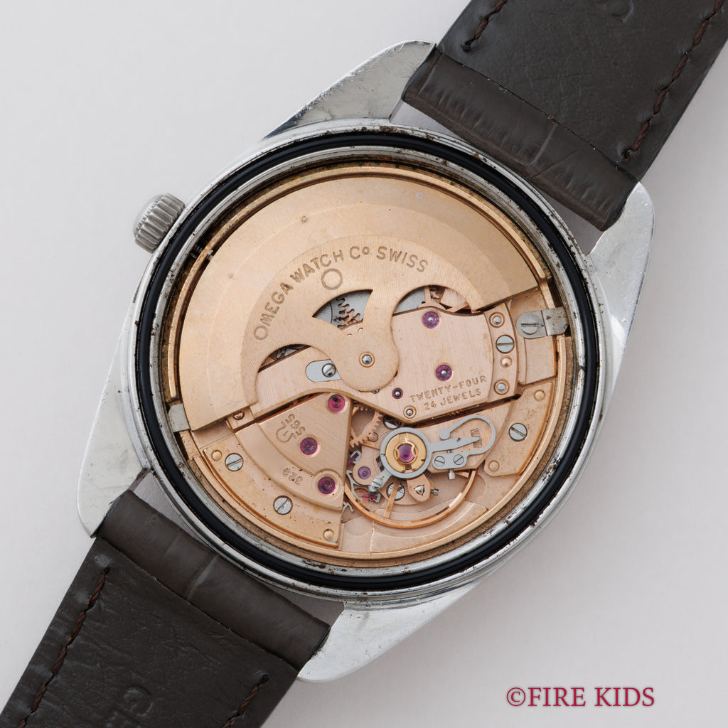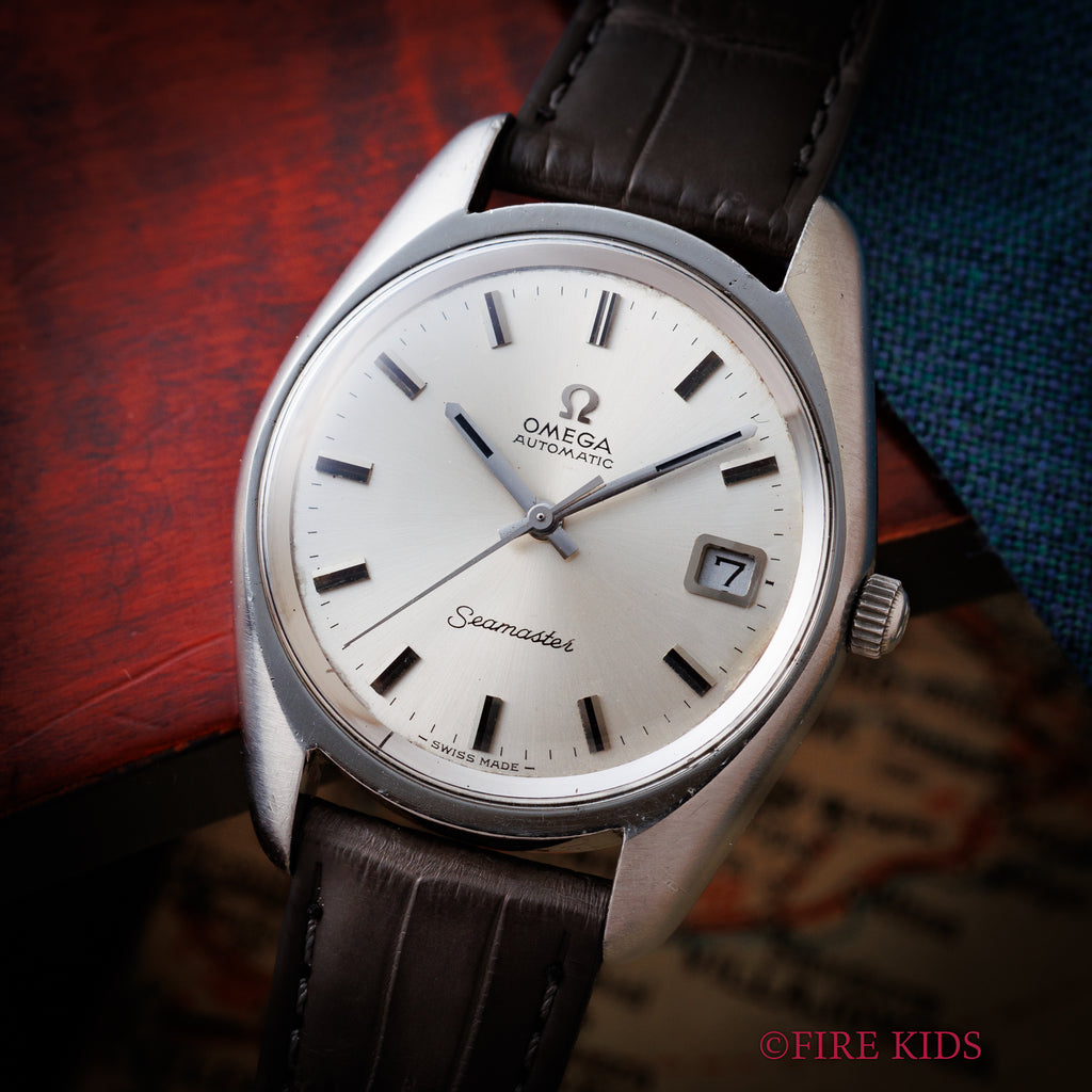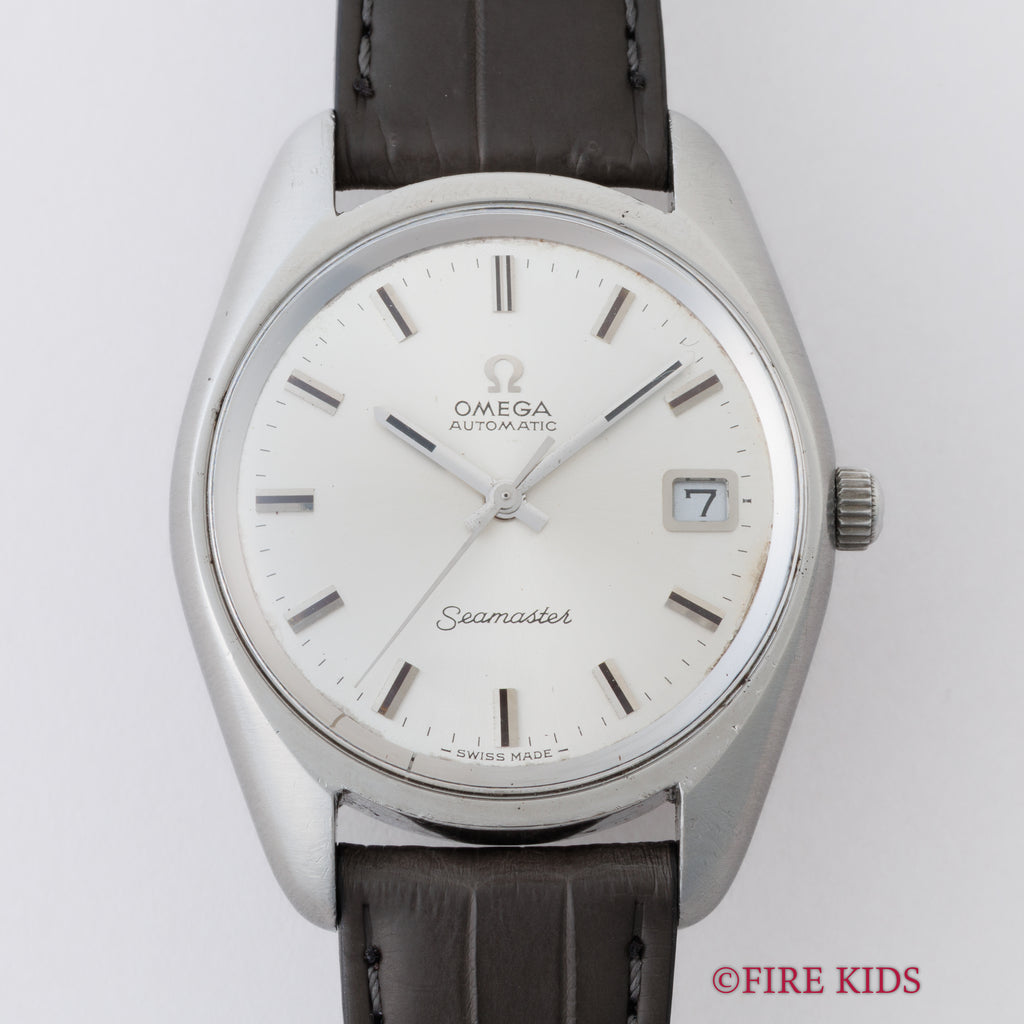 1970年製のオメガ「シーマスター」です。ステンレスのケースにサンレイ仕上げの文字盤とアップライトのバーインデックスのシンプルで飽きの来ない組み合わせです。キャリバーはオメガの名作自動巻き500系Cal.565を搭載。スワンネック式微動緩急針を持ち、高い精度の出る機械です。カレンダーはリューズを2段引くと早送り可能です。文字盤に劣化は無く綺麗な状態を保っています。ケースは小傷等ございますが目立つ大きな傷はございません。手巻きや針回しの操作はスムースです。ベルトはファイアーキッズオリジナルクロコダイル革ベルトを合わせています。