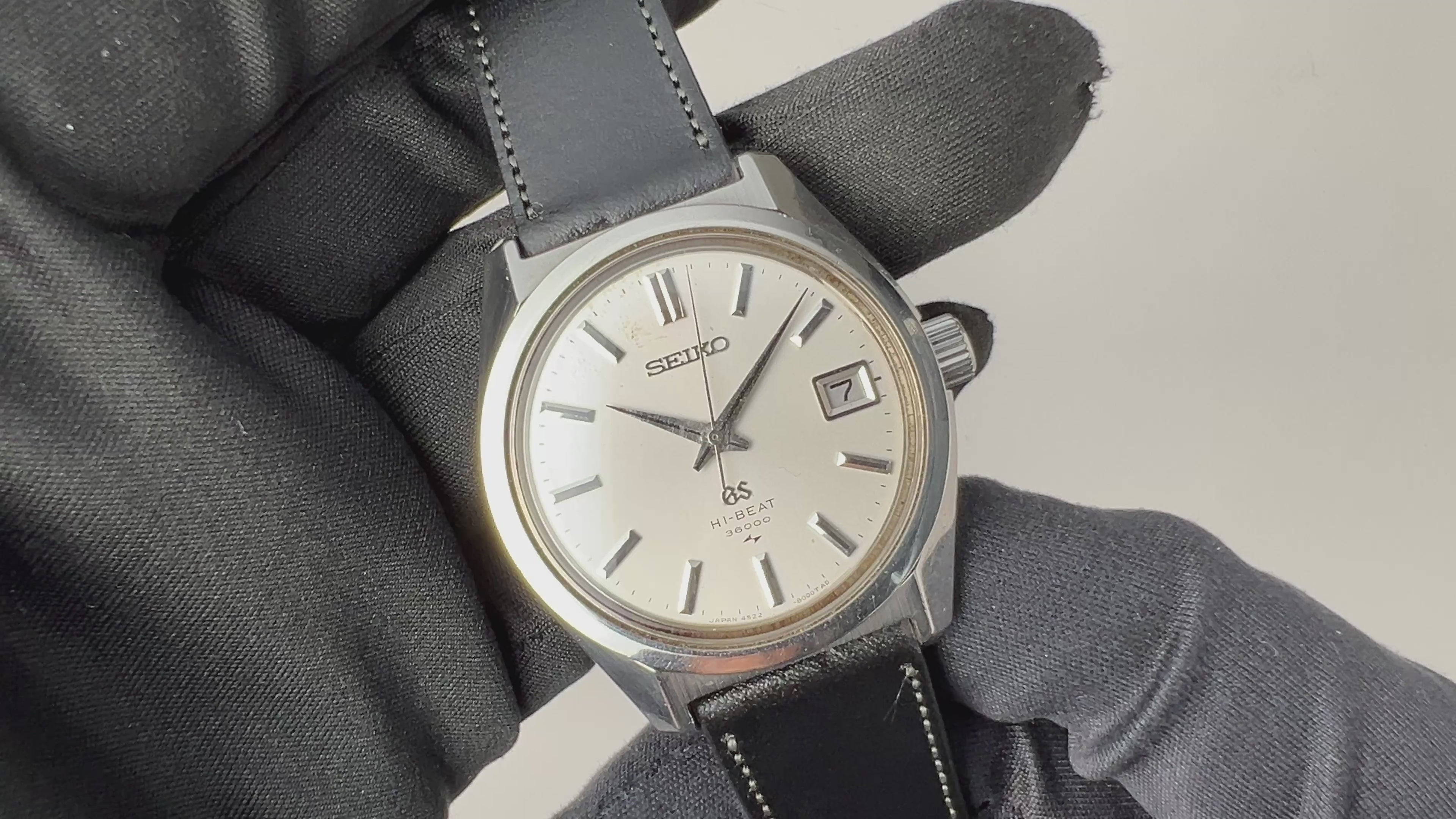 グランドセイコー1968年製 10振動手巻き 45GS Ref.4522-8000 ハイビート セイコースタイルケースの入荷になります。グランドセイコーでセイコースタイルと呼ばれる独自デザインのケースも魅力的で、それまでの海外の高級時計を意識したデザインから独自デザインに変わり、セイコーの技術がスイス製に負けていないという自信がデザインにも現れている感じがします。文字盤は表面の荒れが見られますが全体的には綺麗です。ムーブメントは手巻き10振動の4522Aを搭載、カレンダーの早送り付きで実用性もございます。ケースは小傷はございますが大きなダメージはございません。裏ブタのメダリオンも健在です。ベルトはファイアーキッズオリジナルのイタリアンレザーのブッテーロ(裏面ラバー)を取り付けしています。