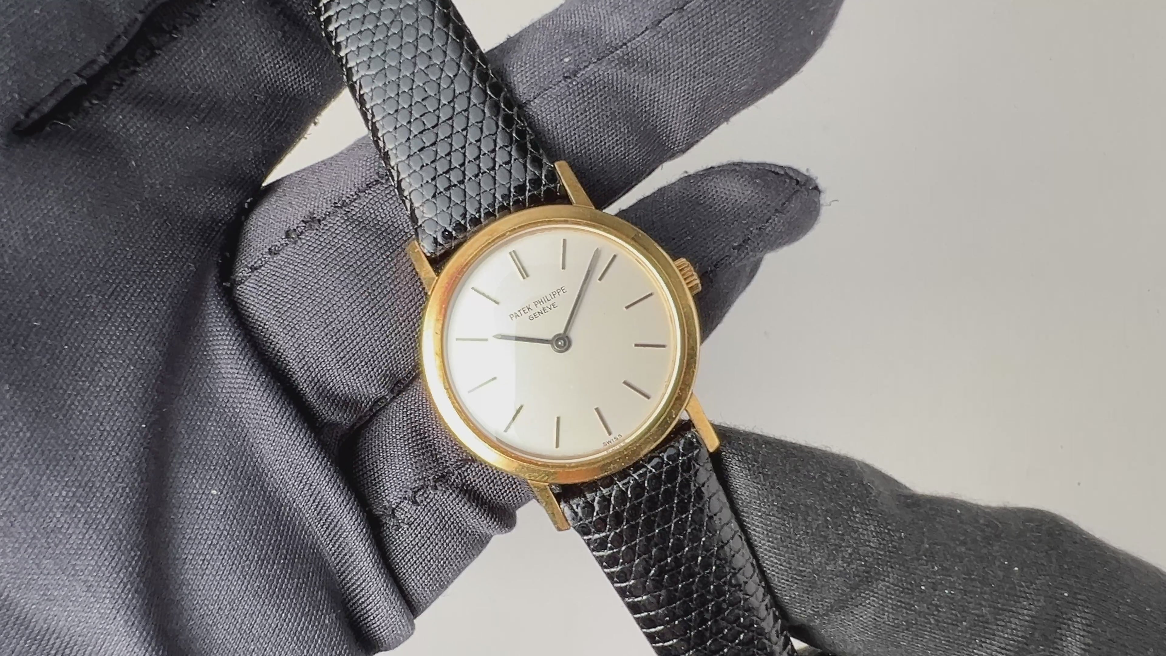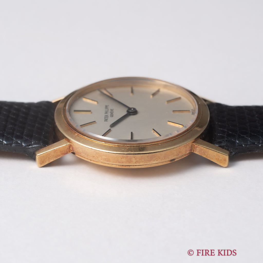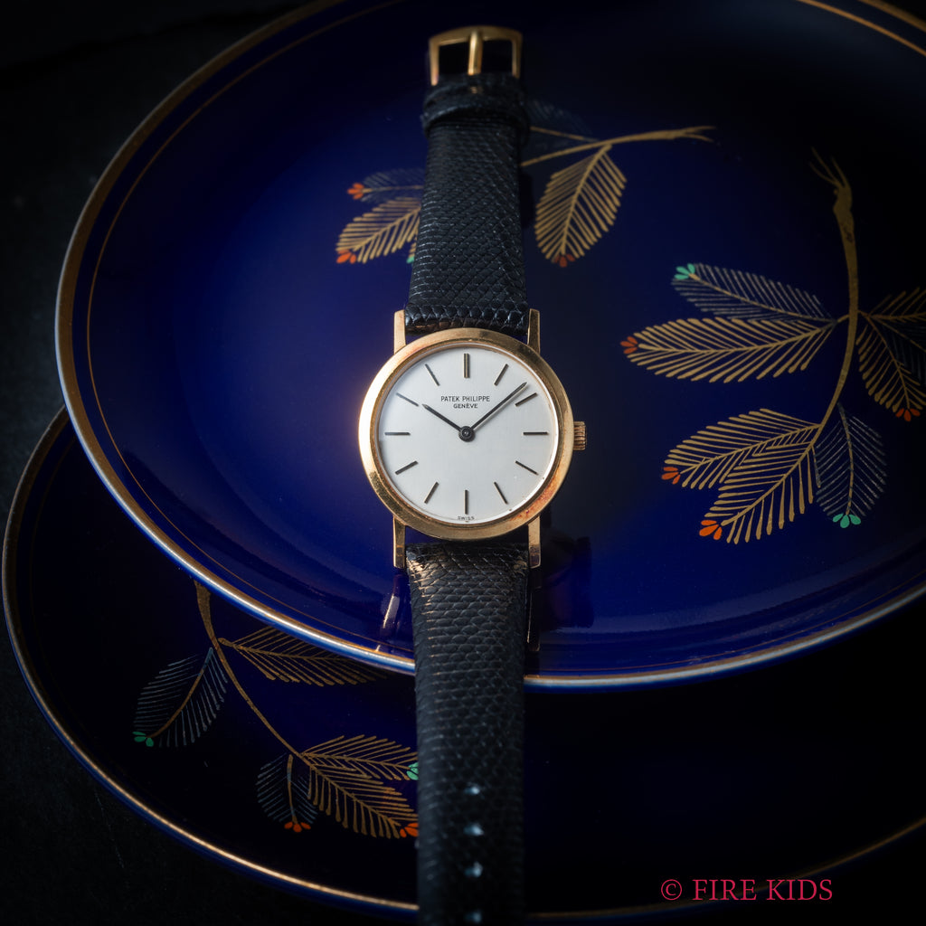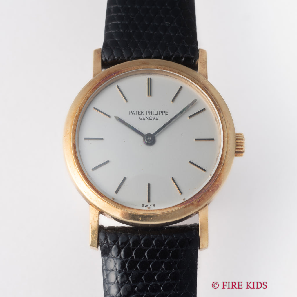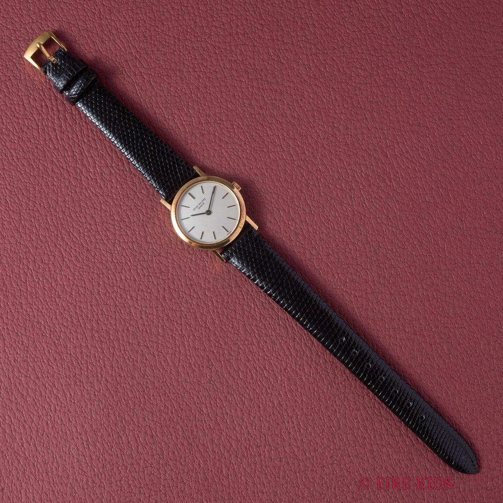 パテック・フィリップ カラトラバ レディース 1970年代製 18金無垢 Ref.4184 Cal.16-250 純正18KYG尾錠の入荷になります。これ以上無い位シンプルな2針の手巻式ですが、シンプルだからこそ造りの良さが感じられます。手巻きをした際の感触は流石パテック・フィリップと実感出来る1本です。文字盤は若干の劣化がある程度でシミ等無く綺麗です。ケースは小傷が見られますが大きなダメージはありません。手巻きや針回しの操作はスムースです。ベルトは社外のリザード革ベルトに純正金無垢尾錠が取り付けられています。