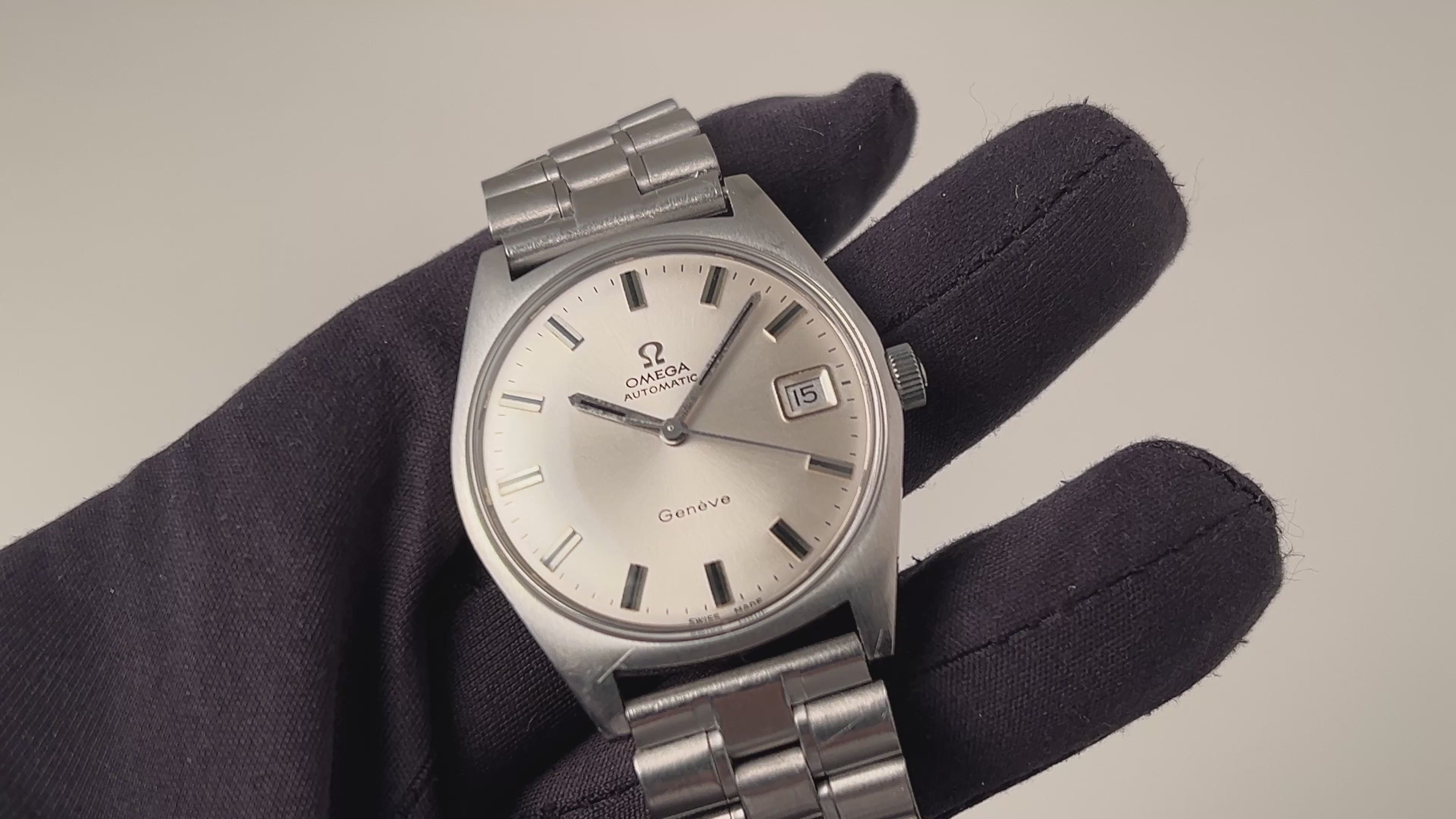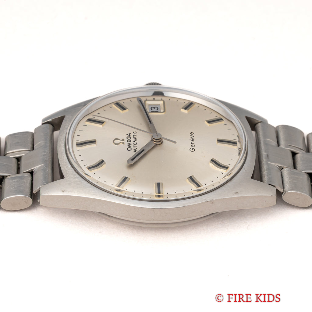 1968年製のオメガ ジュネーブ トノー型ケースが入荷しました。現在のオメガにはラインナップとして存在しないジュネーブ。当時、新たな客層や若年層向けに様々なデザインが発表されました。本品は3針で日付付き、夜光無しのスッキリとしたダイヤルは経年によりほんのり色付いた良い顔立ちです。滑らかな曲線を描いたトノー型ケースはオリジナルのヘアラインが残っているかが肝となりますが、当個体は小傷こそあるもののしっかり残っています。デザインは後年の70年代テイストを感じつつ、機械は造りの良さに定評のあるCal.565を搭載しています。ファンクションも問題ありません。ブレスは純正ブレスが取り付けてあります。こちらは分解掃除済みになります。