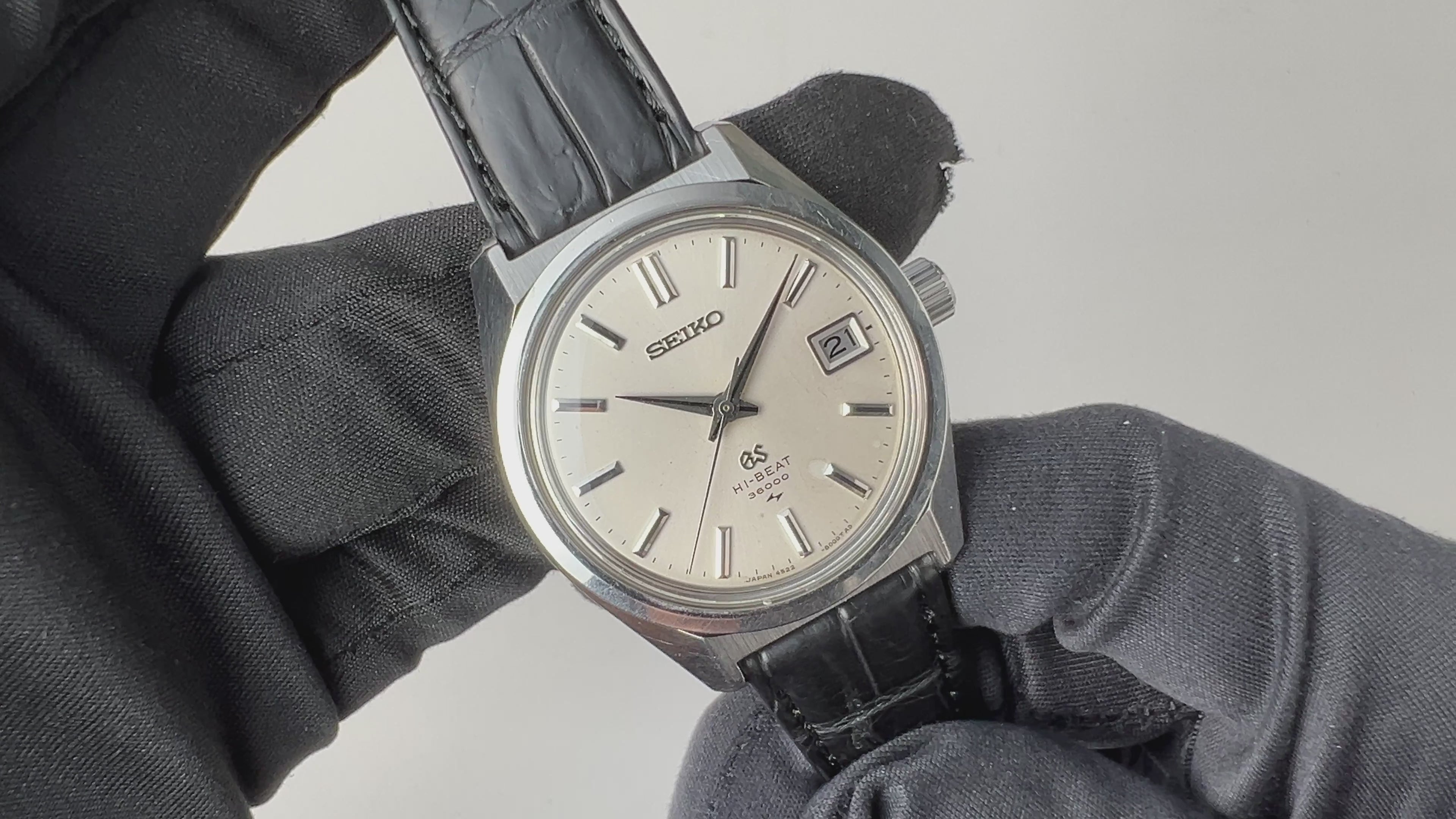 グランドセイコー1969年製 10振動手巻き 45GS Ref.4522-8000 ハイビート セイコースタイルケースの入荷になります。グランドセイコーでセイコースタイルと呼ばれる独自デザインのケースも魅力的で、それまでの海外の高級時計を意識したデザインから独自デザインに変わり、セイコーの技術がスイス製に負けていないという自信がデザインにも現れている感じがします。文字盤は若干シミがありますが全体的には綺麗です。ムーブメントは手巻き10振動の4522Aを搭載、カレンダーの早送り付きで実用性もございます。ケースは裏蓋に工具を滑らせた跡がありますがその他目立つダメージはありません。ベルトはファイアーキッズオリジナルのクロコダイル革ベルトを取り付けしています。こちらは分解掃除済みです。