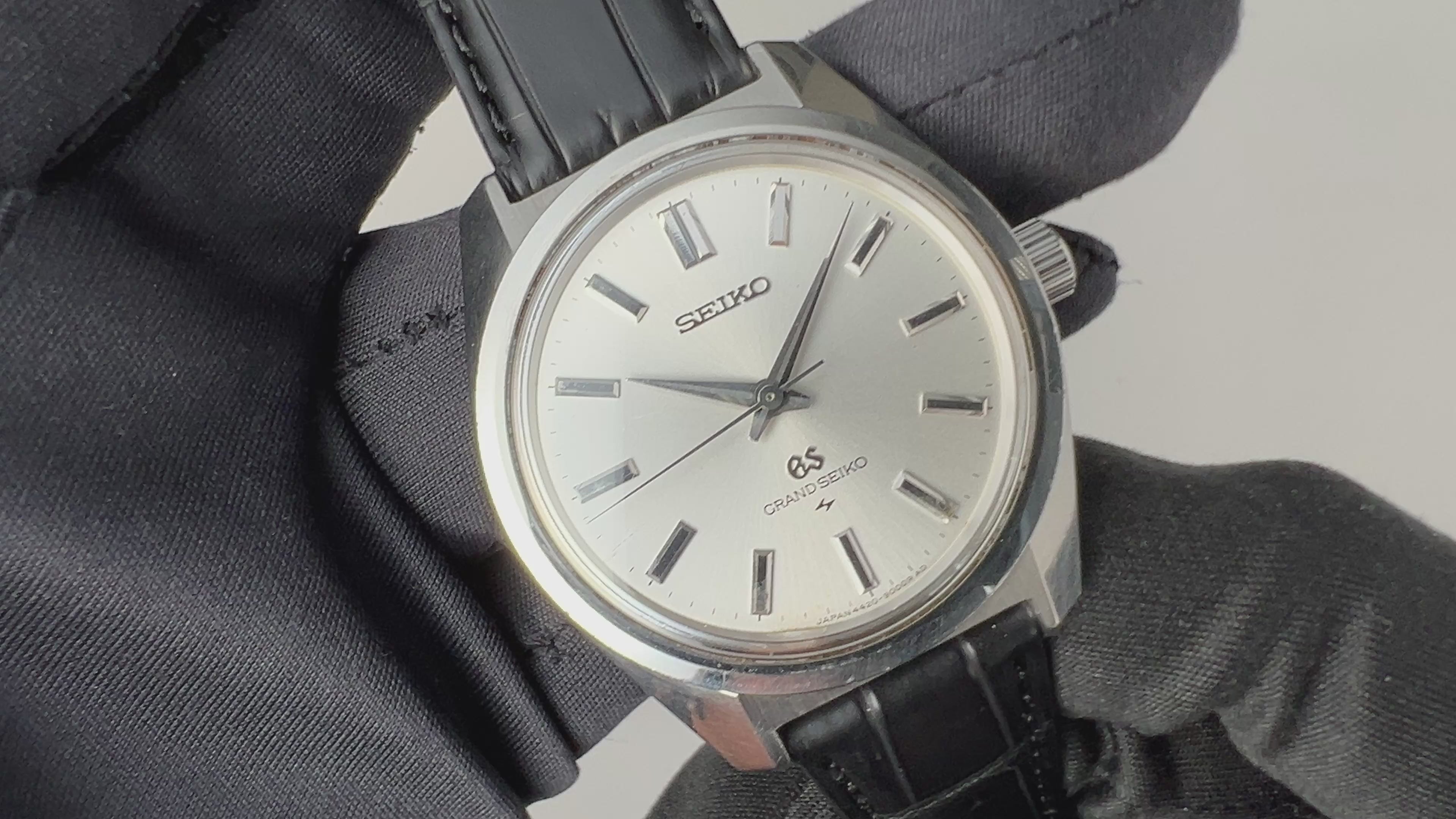 1967年製の44グランドセイコー後期型です。初の第二精工舎(亀戸セイコー)製グランドセイコー、製造期間が僅か2年間の希少なモデルでセイコースタイルと呼ばれるデザインを確立させたといわれるモデルです。ムーブメントは手巻きのCal.4420Bを搭載。文字盤は肉眼でキレイな状態でケースは小傷はございますが大きなダメージはございません。手巻きや針回しの操作はスムースです。ベルトはファイアーキッズオリジナルクロコダイル革ベルトを取り付けてあります。