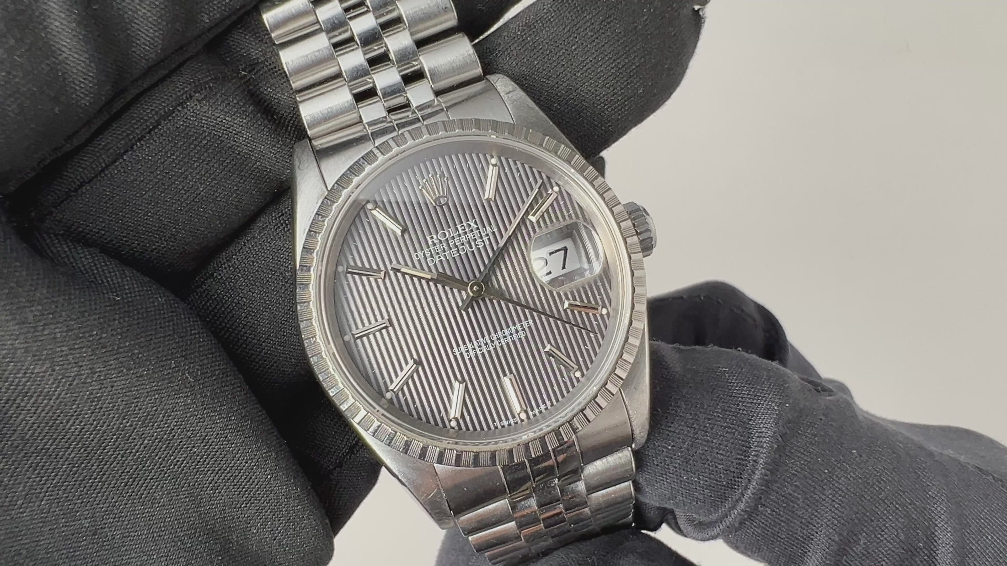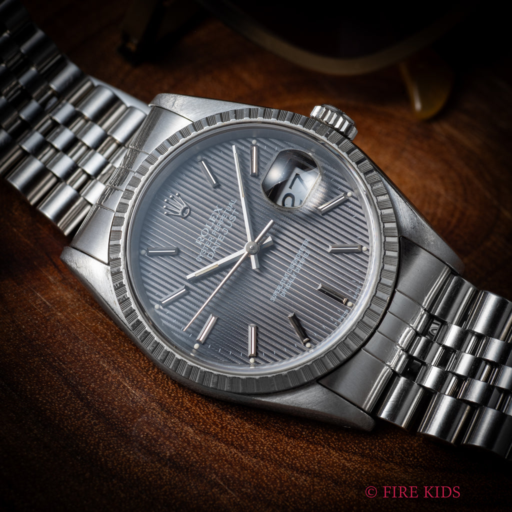 ロレックス デイトジャスト 1991年製 Ref.16220 グレータペストリーダイヤル の入荷になります。珍しいグレーのタペストリーダイヤルにステンレスベゼルを搭載し、華やかな雰囲気も感じる一本です。ケースは小傷程度で大きなダメージはありません。機械は安心のロングセラーCal.3135を搭載しております。手巻きや針回し、ねじ込みリューズの操作はスムースです。ベルトは純正ジュビリーブレス62510H/FF555Bが取り付けてあります。