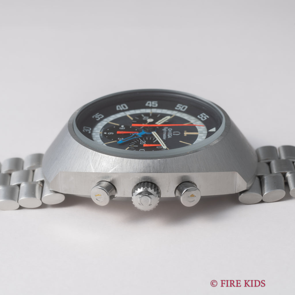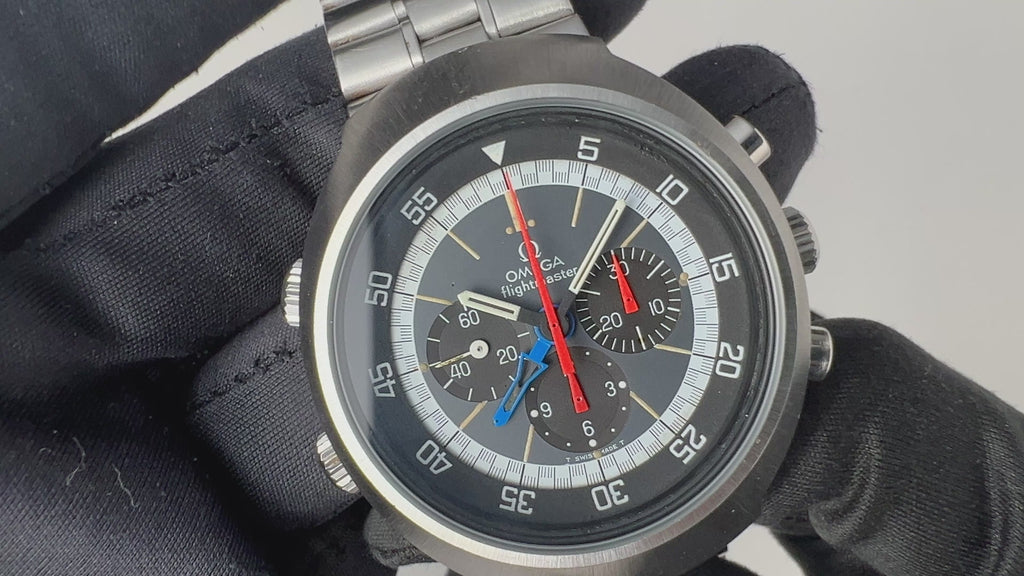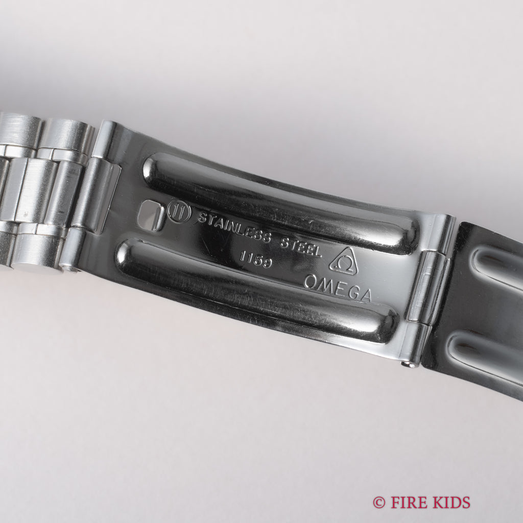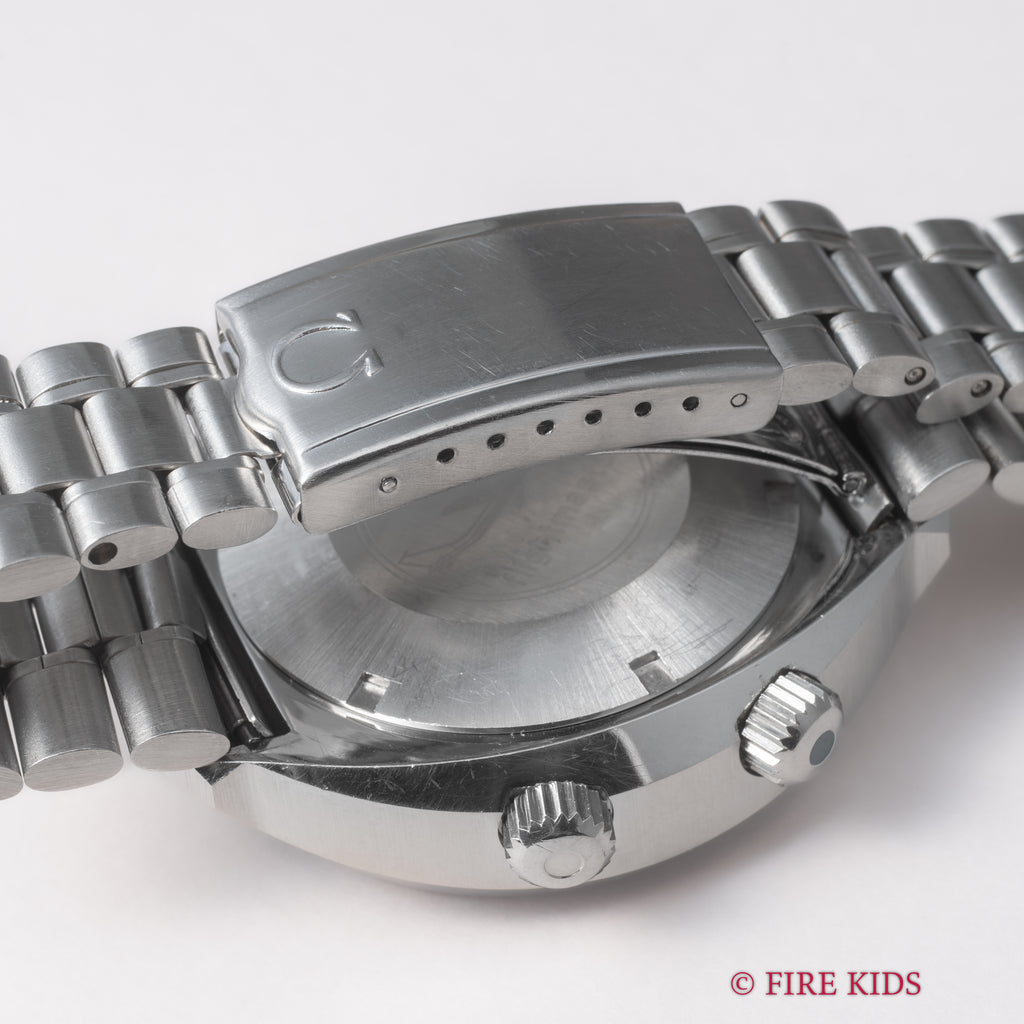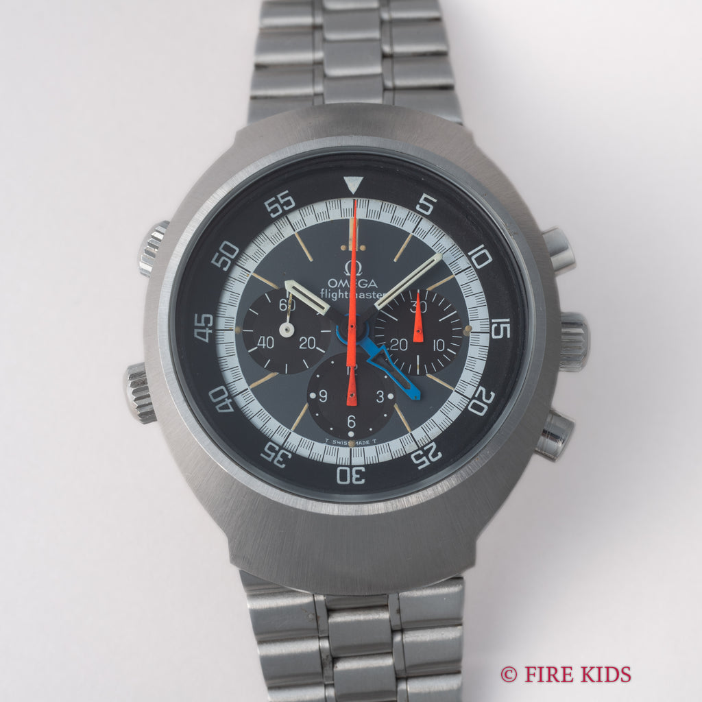オメガ フライトマスター 後期型 1972年製 Ref.145.026 手巻クロノグラフ Cal.911 オレンジ針 純正ブレスの入荷になります。ケースが前期型より分厚くなった後期型です。オレンジのクロノ針で如何にも1970年代といった雰囲気のパイロットウォッチです。クロノグラフとGMTが合わさった多機能モデルで3時位置に30分積算計、6時位置に12時間計、9時位置に秒針を配置したクロノグラフに、8時半位置のリュウズでインナーベゼルの調整、10時位置のリュウズはGMT針を調整することができます。ムーブメントはスピードマスターのCal.861に付加機能を追加したCal.911を搭載。ケースやブレスは小傷はあるものの申し分なく良いコンディションで、インダイヤルはブラウンに変化しています。このようなコンディションの良さと経年変化を同時に感じることが出来る個体は多くありません。ベルトは純正ステンレスベルト(1159/FF155)が取り付けてあります。手巻きや針回しの操作はスムースです。こちらの時計は分解掃除済みです。