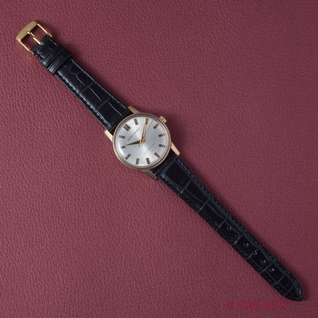 キングセイコーファーストモデル 1963年製 100ミクロン金張り Ref. J14102 KSの入荷になります。グランドセイコーと比べるとスッキリとしたサイズ感で使いやすいモデルです。文字盤は多少表面の劣化が見られますが良い雰囲気です。ケースは小傷が見られますが大きなダメージはありません。手巻きや針回しの操作はスムースです。ベルトはファイアーキッズオリジナルクロコダイル革ベルトを合わせています。こちらは分解掃除済みです。