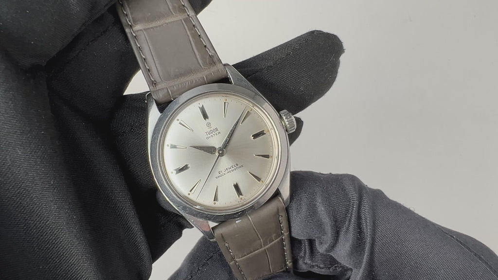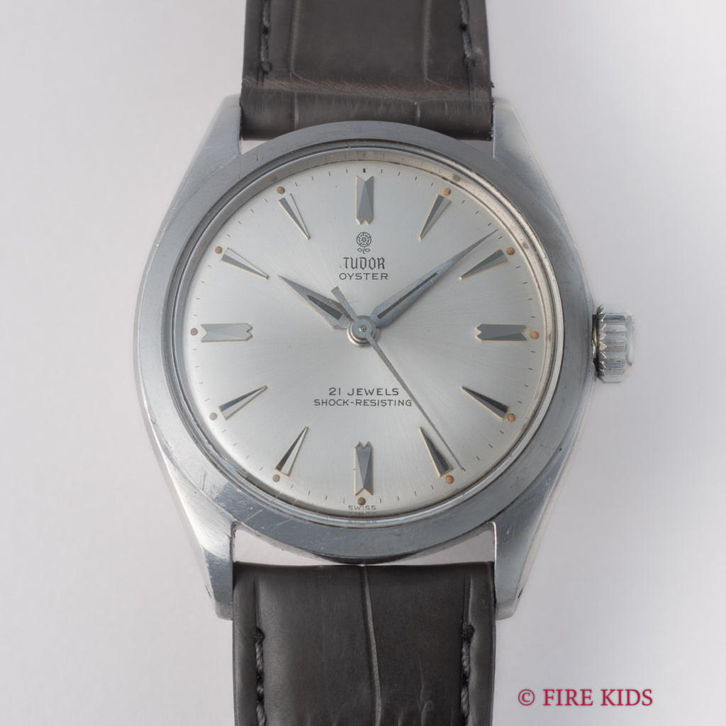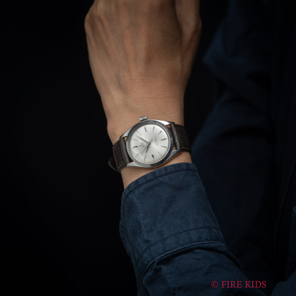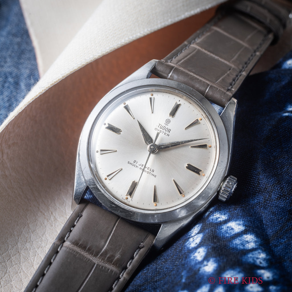 チューダーの小薔薇オイスター1961年製シルバーダイヤルです。サンバースト仕上げのシルバーダイヤルは若干の経年劣化がありますが、大きなダメージはなく良好なコンディションです。ROLEX製のオイスターケースは小キズが見られますが大きなダメージはありません。ムーブメントは手巻きのCal.1156を搭載。手巻きや針回しの操作はスムースです。ベルトはファイアーキッズオリジナルのクロコダイル革ベルトが取り付けてあります。