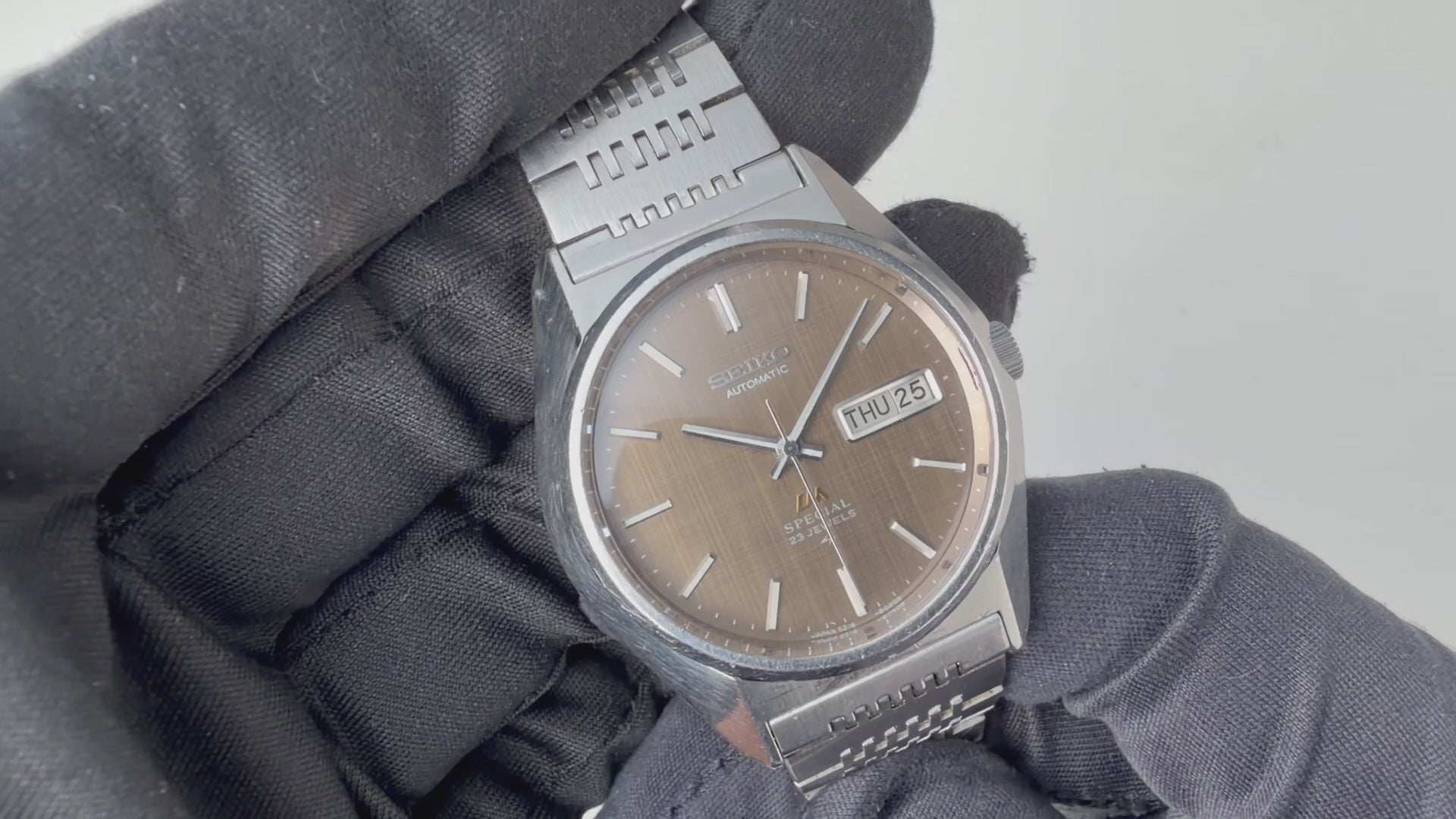セイコー ロードマチック スペシャル 1975年製 Ref.5216-8020 グレーダイヤル 純正ブレスの入荷になります。1970年代らしいセイコースタイルデザインでブラウン化したグレーの文字盤が魅力的です。ロードマチックはセイコーマチックのハイグレードモデルで23石の自動巻きムーブメントを搭載しています。ケースは小傷がありますが大きなダメージはありません。文字盤は良好な状態です。ブレスはLM用のオリジナルステンレスブレスが着いています。こちらの時計は分解掃除済みです。