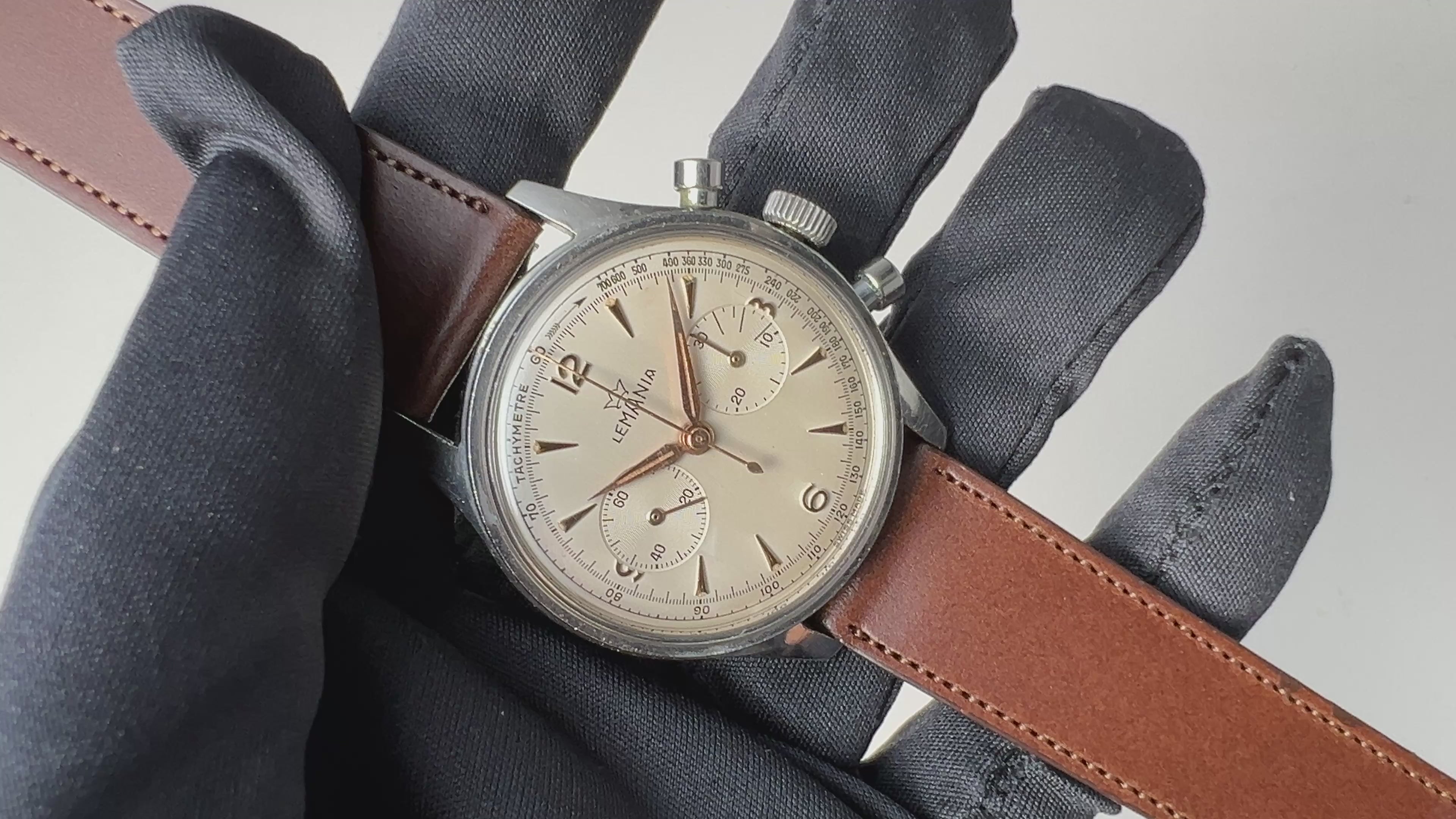1950年代製のレマニア 2レジスタークロノグラフ Cal.27CH搭載モデルが入荷しました。ダイヤルはマットホワイトで、ピンクカラーの楔インデックスとアラビアの組み合わせ。針もピンクカラーで統一されています。外周をタキメーターで囲んでおりシンプルながら飽きの来ないデザインです。機械はオメガのスピードマスターにも搭載されたCal.321の2レジスターバージョンの名機Cal.27CHを搭載。小振りなインダイヤルが内側にギュッと詰まっていて良い感じです。手巻きや針回し、クロノグラフファンクションもスムーズです。ケースはスクリューバックケースでラウンドプッシャーと防水仕様です。ステップベゼルも魅力的です。ダイヤルとケースは年代なりの経年や小傷はありますが大きなダメージはありません。ベルトはファイアーキッズオリジナルのブッテーロカーフレザーを合わせています。