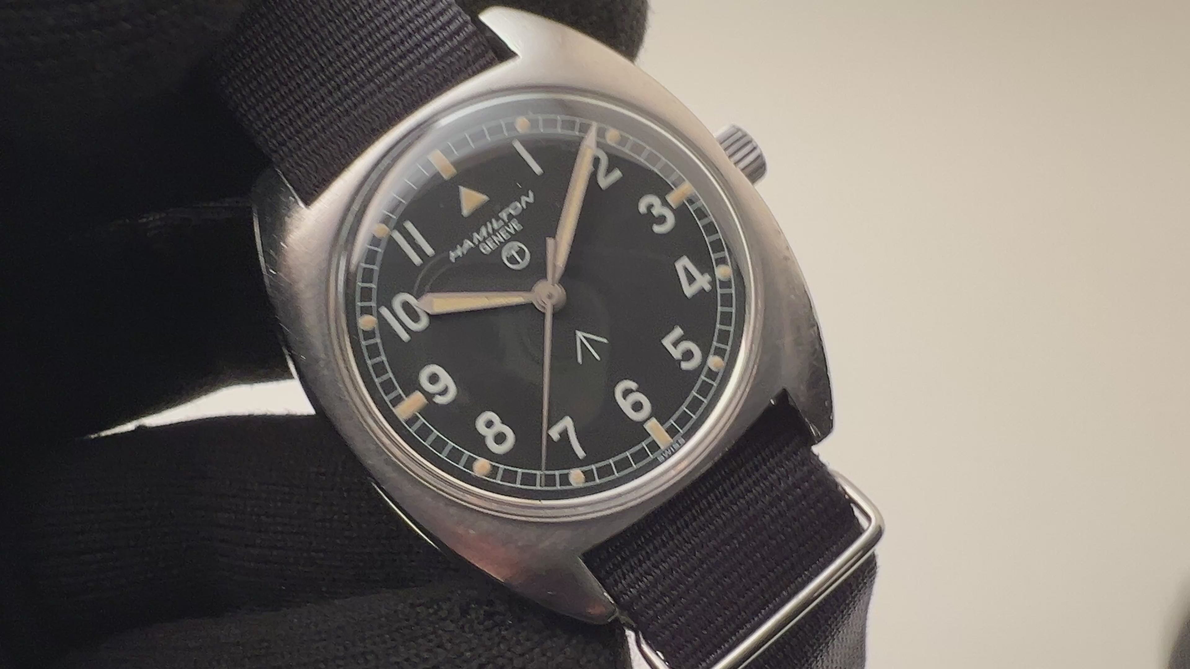 ハミルトン イギリス空軍 手巻き 6bb トノー型 ミリタリー 1970年代製 1974年支給品です。復刻も出た人気モデルのオリジナルで、気軽に日常使い出来るミリタリーウォッチとしておススメのモデルです。数の少ない空軍支給品です。ワンピースケースで堅牢な作りをしています。文字盤、ケースともに多少の経年や小傷程度で良いコンディションです。手巻きや針回しはスムーズです。ベルトはフェニックス社製のNATOベルトを合わせています。