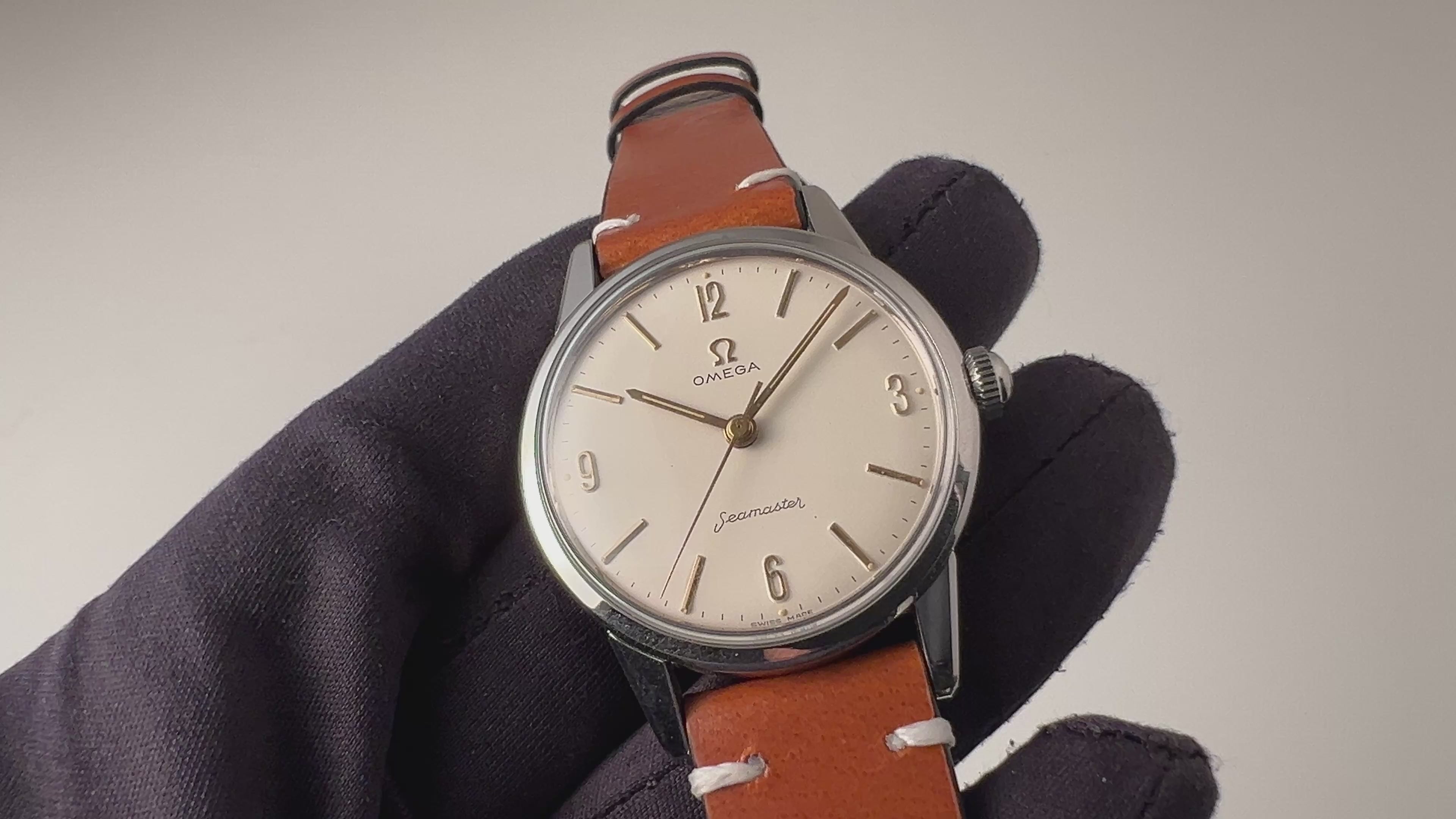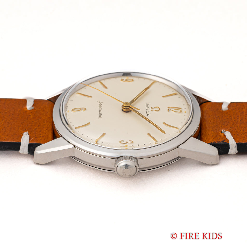 オメガ シーマスター 30mmキャリバー 手巻 Cal.285 1959年製 アラビアダイヤルの入荷になります。オメガの代表的な手巻きキャリバー30㎜シリーズの後期型Cal.285を搭載している珍しい1本です。ラグのしっかりとした防水ケースで存在感があります。ゆったりとしたカーブを描く文字盤や切れ味良さそうな針も魅力的です。ケースは小傷が見られますが大きなダメージはありません。文字盤表面に荒れが見られますが良い雰囲気です。ベルトは社外のカーフが取り付けられています。こちらの時計は分解掃除済みです。