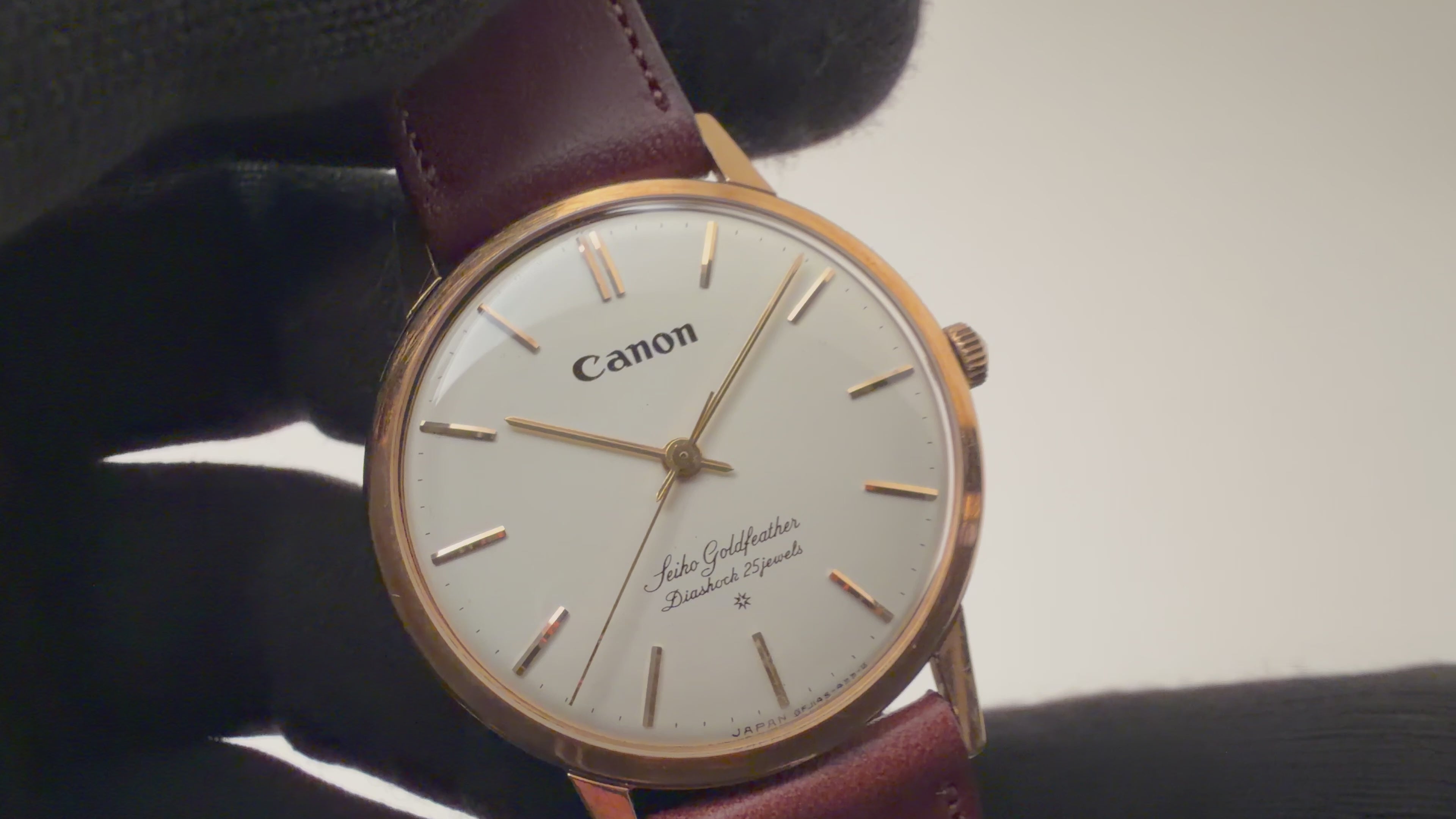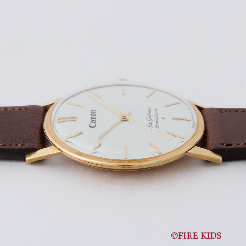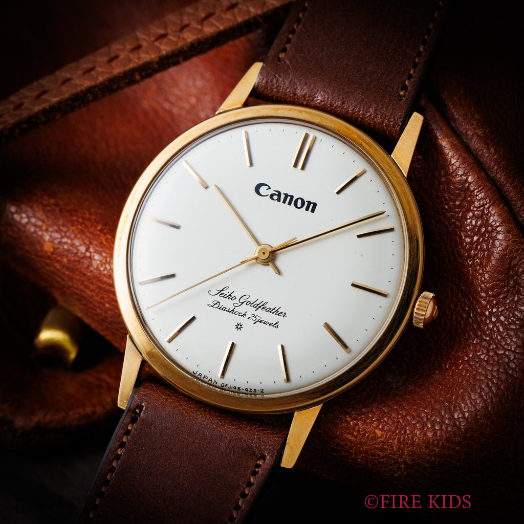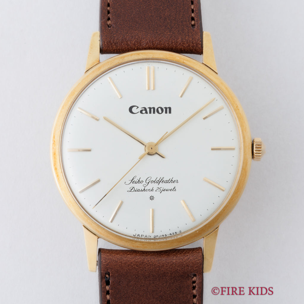 セイコー ゴールドフェザー キャノン 1960年製 Ref.J14060 18金無垢です。薄型手巻きのゴールドフェザーの珍しい18金無垢です。ゴールドフェザーはクレドールの前身にあたり、着け心地が羽根が触れたように上品で柔らかいドレスウォッチとして製造されました。こちらは更に12時位置にCanonロゴが入るダブルネーム個体です。SDダイヤルで高級感があります。小傷はありますが大きなダメージはありません。ベルトはファイアーキッズオリジナルブッテーロ革ベルトが付いています。こちらは分解掃除済みです。