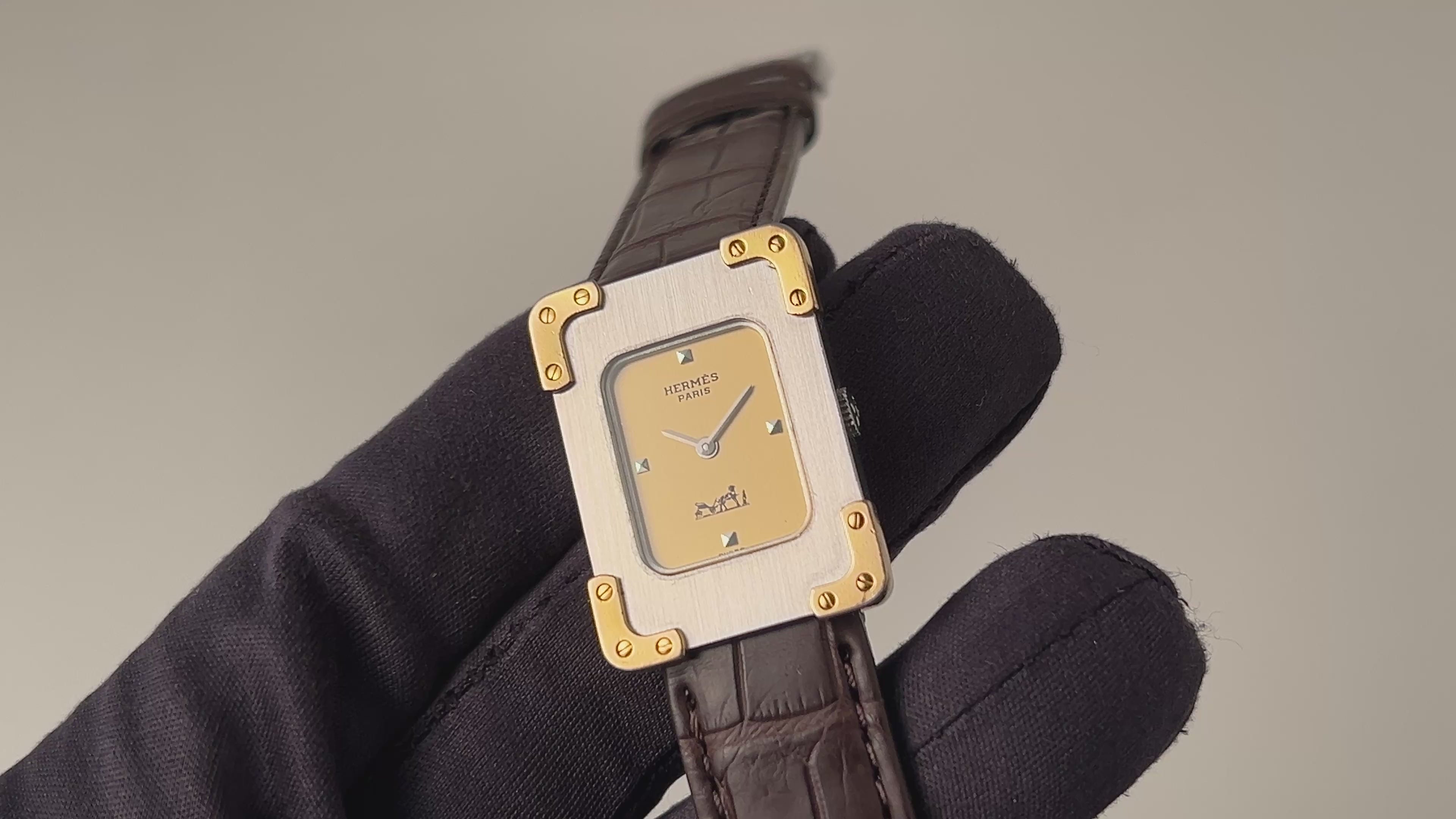 1980年代製のエルメス クロアジュール レクタンギュラー手巻きモデルです。珍しいエルメスの手巻き時計でステンレス製のレクタングルケースのコーナーに金色の金具がセットされています。当時はメンズとして販売されていたモデルで現在ではユニセックスサイズです。文字盤は上品なアイボリーダイヤルです。ムーブメントは手巻きの機械を搭載。手巻きや針回しの操作はスムースです。ベルトは社外のレザーベルトが取り付けてあります。
