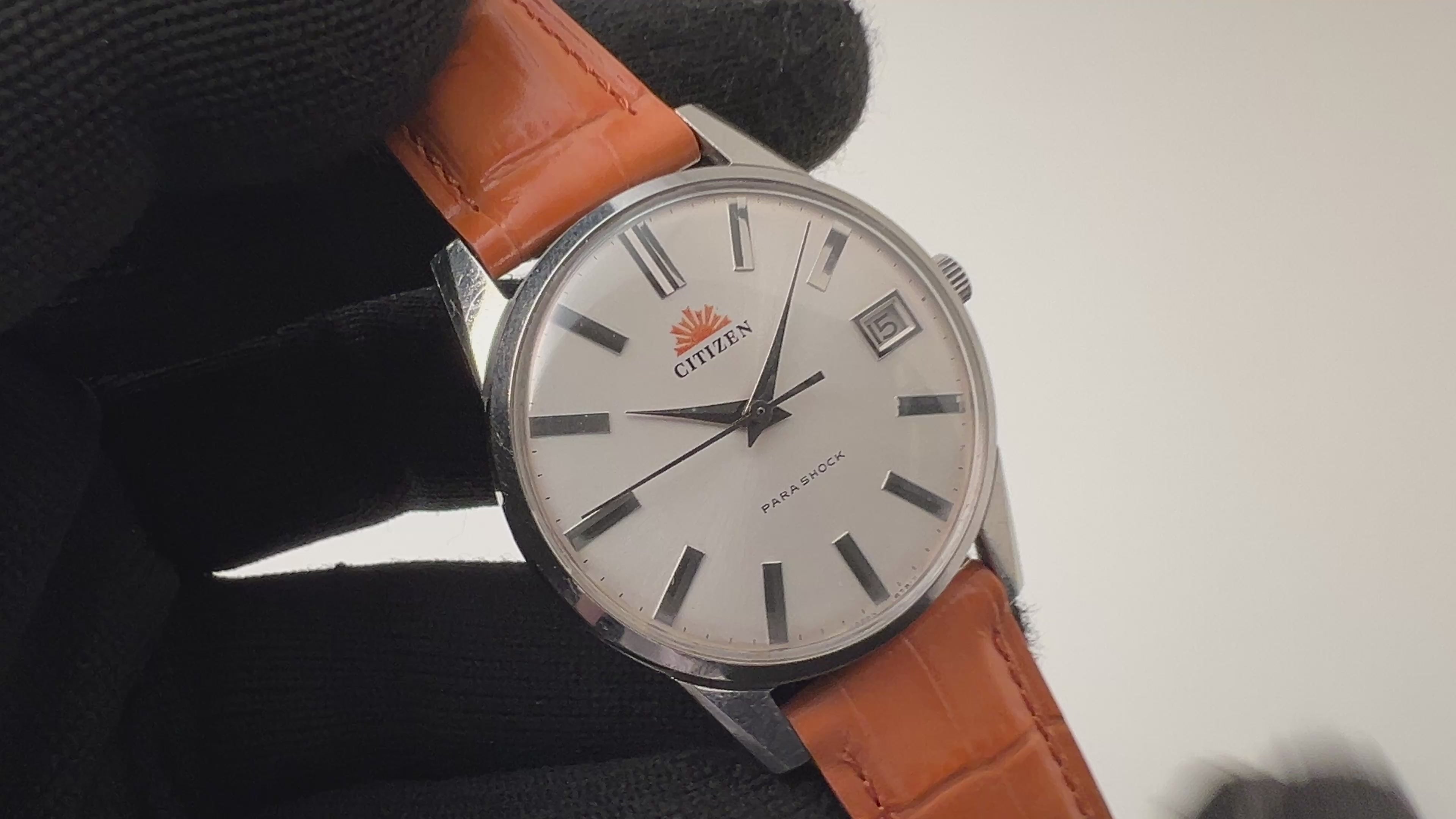 シチズン ラウンドケース パラショック 1960年代製 手巻きです。お洒落な変わり文字盤、ドーフィンハンド等、ヴィンテージ好きにはたまらない1本です。文字盤は表面の劣化が見られますが綺麗に見えます。ケースは小傷が見られますが大きなダメージはありません。手巻きや針回しの操作はスムースです。ベルトは社外の革ベルトが取り付けられています。