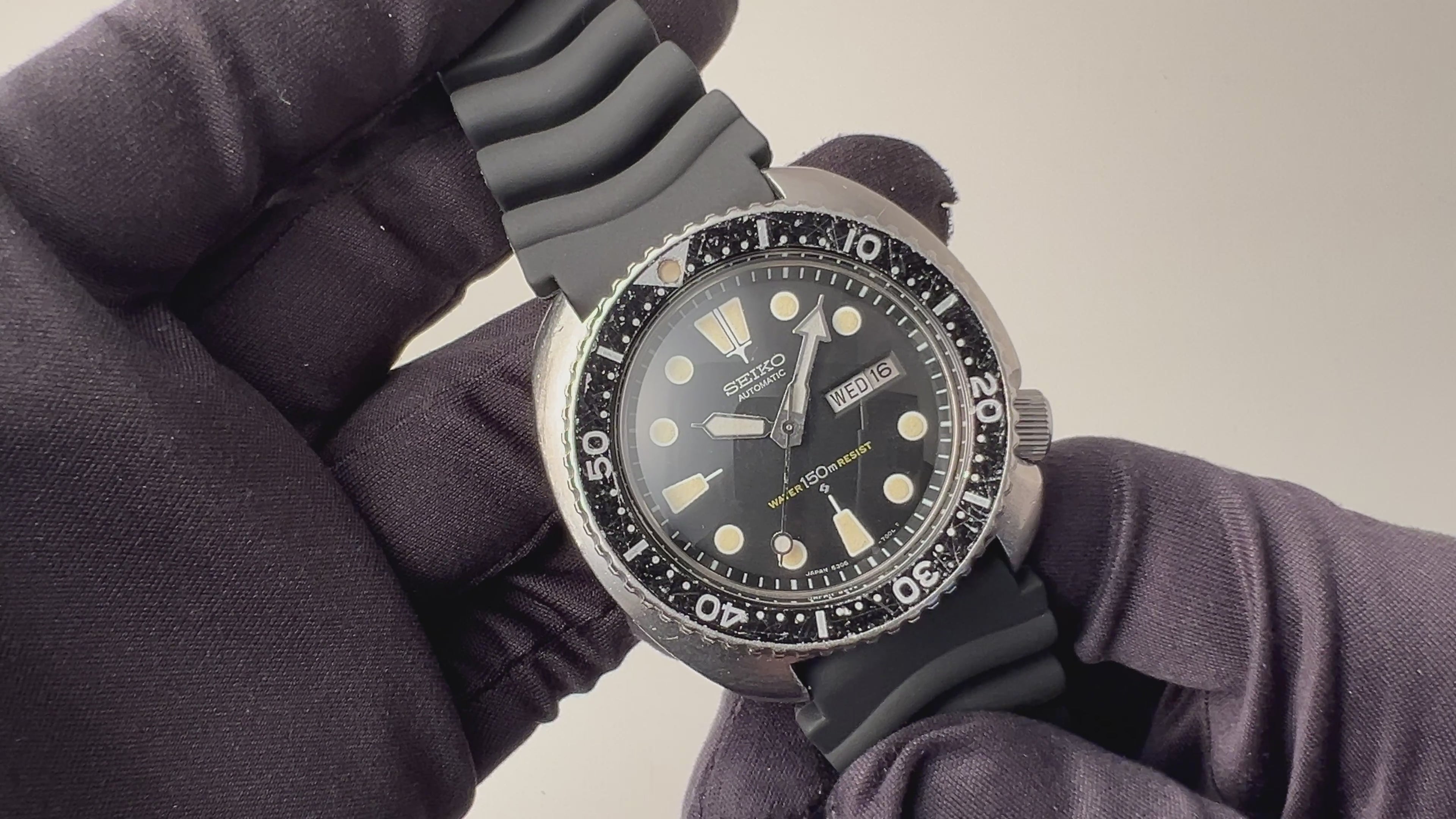 セイコー 150m 3rdダイバー 1976年製 Ref.6306-7001 国内仕様 タートル 自動巻の入荷になります。セイコーのダイバーモデルの中でその独特なケース形状から海外ではタートルと呼ばれ人気のサードダイバーです。ムーブメントは自動巻きのCal.6306Aを搭載、カレンダーは日本語と英語が選べる国内仕様になります。リューズのねじ込みもすり減っているものが多い中、しっかりと行えます。ケースは多少キズがございますがあまり気にならない程度です。ベルトは純正のラバーストラップに純正尾錠が取り付けられています。こちらの時計は分解掃除済みです。