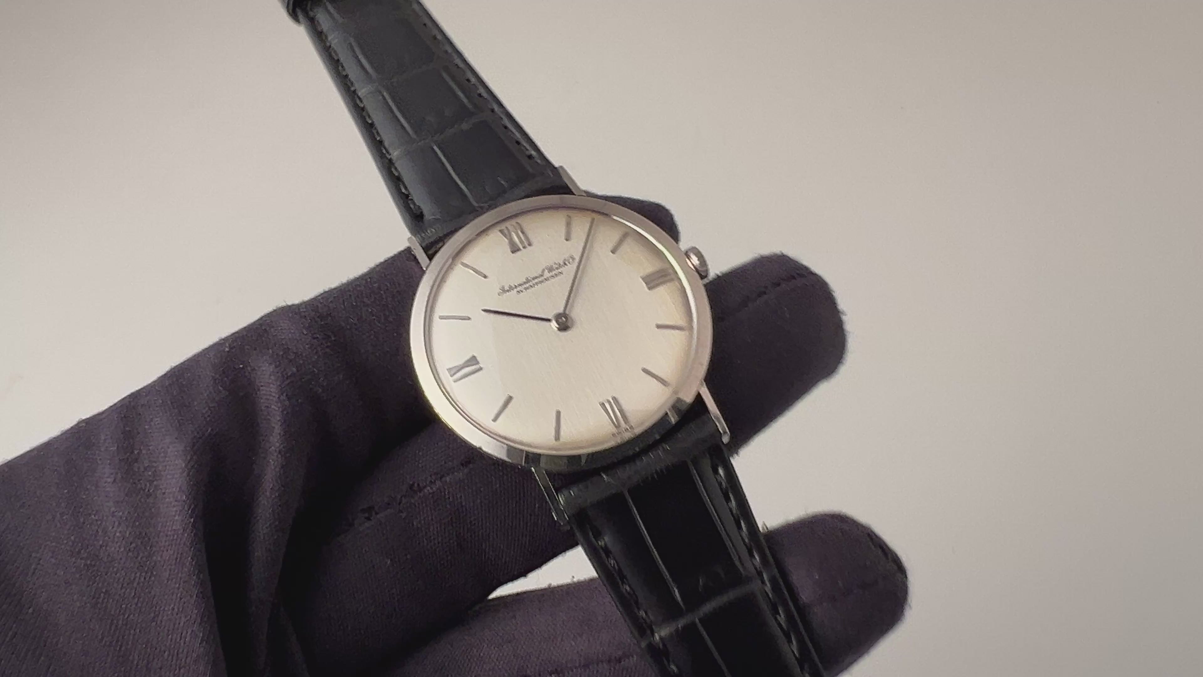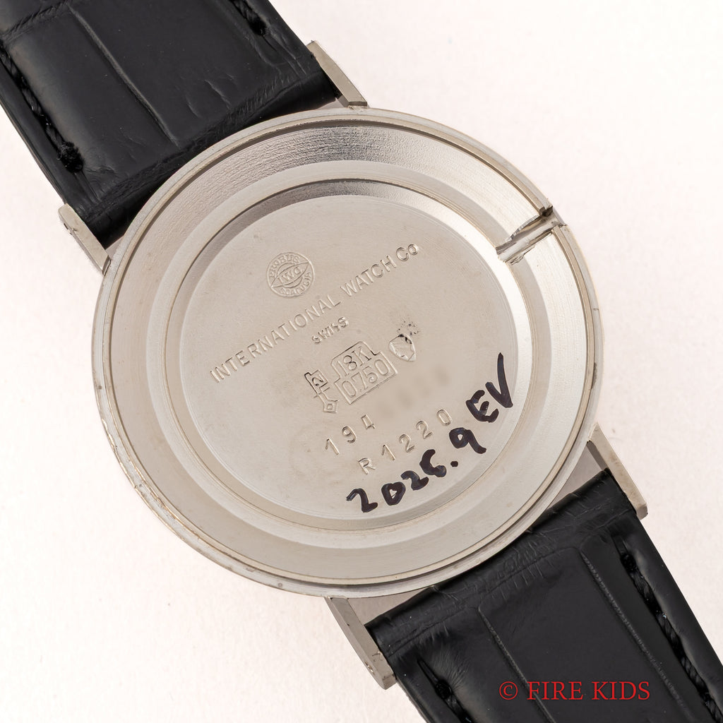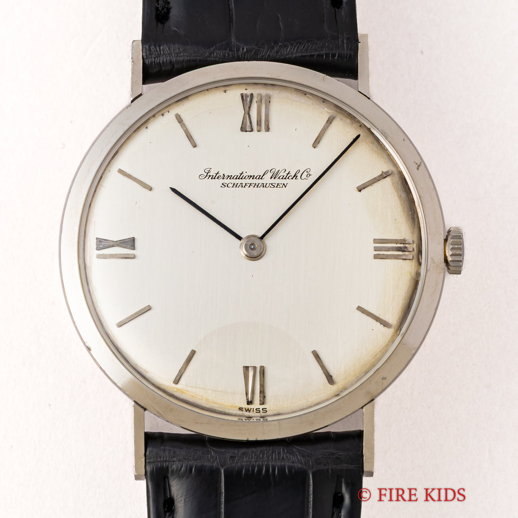 インターナショナルウォッチカンパニーの1972年製 飛びローマンダイヤルです。人気の筆記体の表記の文字盤で、幅約32mmと18金無垢のラウンドケースモデルでシンプルながらも植字のバーインデックスとプリントのローマンインデックスを組み合わせた上品なデザインです。ムーブメントは手巻きのCal.171を搭載しています。文字盤は大きなダメージのない綺麗な状態です。ケースは全体に小キズがありますが、オリジナルのシェイプを保っています。ベルトはファイアーキッズオリジナルのクロコダイルを合わせています。こちらは分解掃除済みになります。