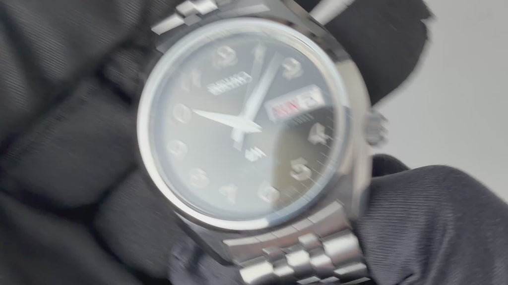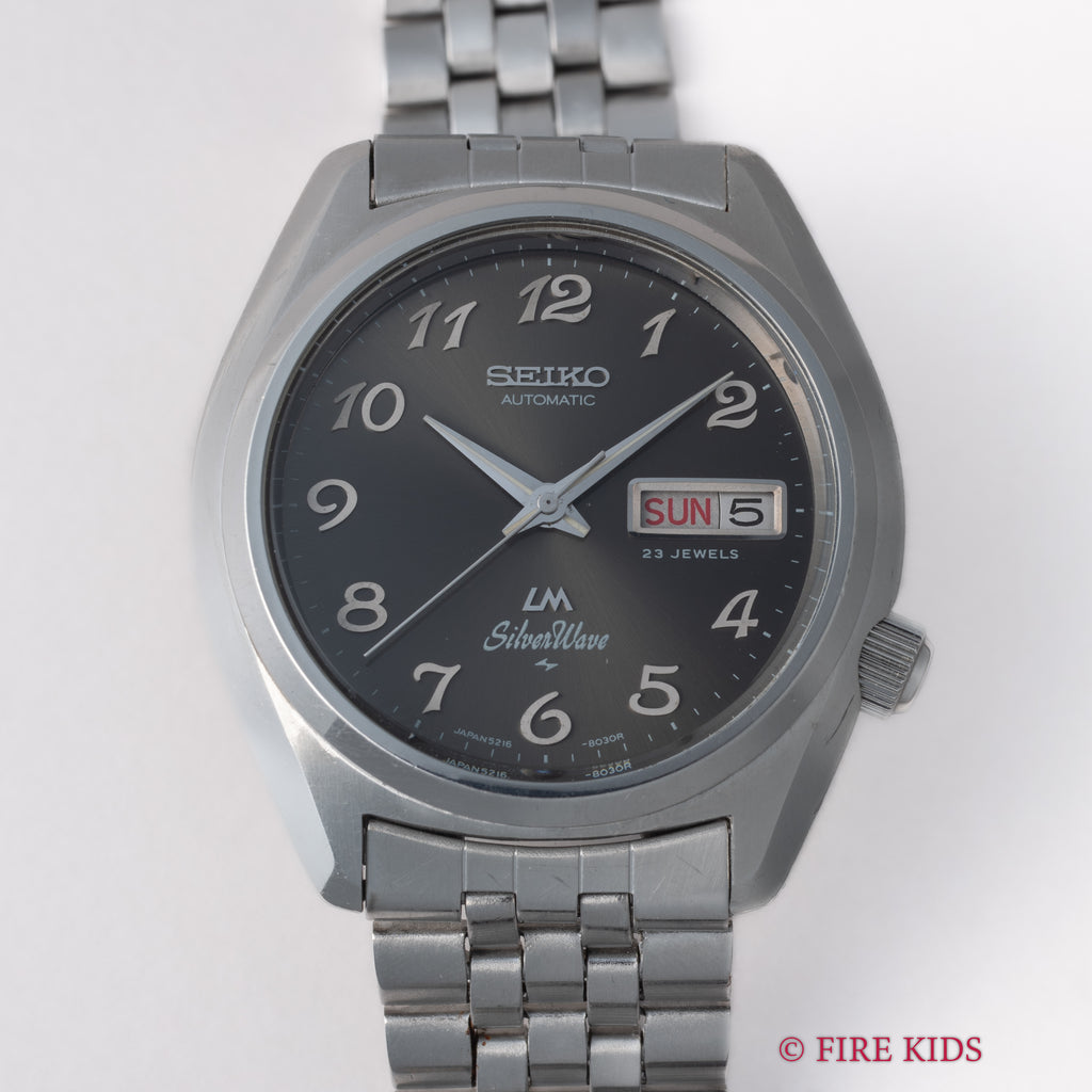 セイコー LM シルバーウェーブ 1976年製 アラビアダイヤル ねじ込みリューズ 自動巻 純正ブレス付きです。アラビアインデックスと濃いグレーダイヤルの個性的な組合わせです。ムーブメントは自動巻きのCal.5216Aを搭載、カレンダー日英表記のクイックチェンジ付きです。ケースは小傷はございますが大きなダメージはございません。ベルトは純正のステンレスブレスが取り付けてあります。針回し、ねじ込みリューズの操作はスムースです。こちらは分解掃除済みです。