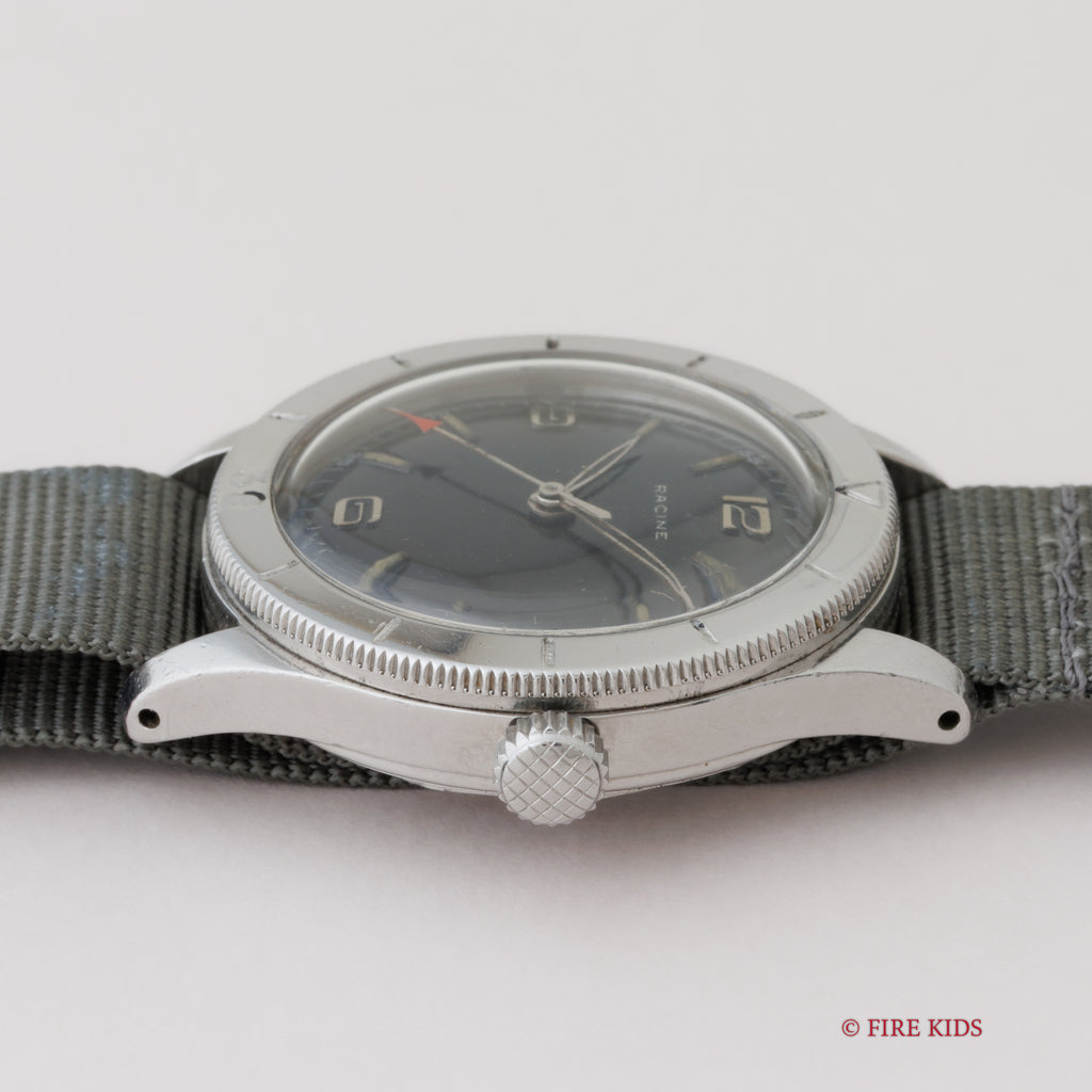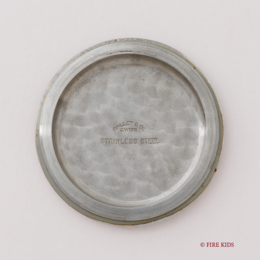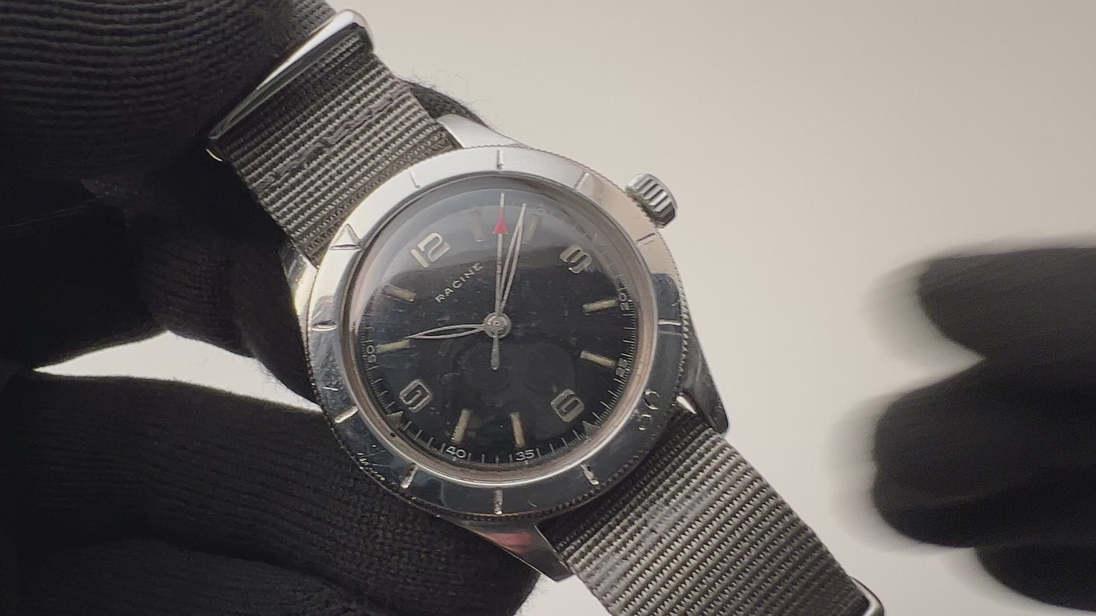 ラシンの1940年代製アラビアダイヤルです。ムーブメント、裏蓋にはGALLETの刻印があります。ミリタリーウオッチの雰囲気でセンターセコンド、スクリューバックケース、耐震装置付きとスペックも軍用時計仕様になっています。ダイヤルは多少の経年変化はございますが、針の夜光は欠落していますが、ダイヤルのプリントの剥がれや夜光の欠落はなく良い状態です。ケースは小キズが見られますが大きなダメージはありません。手巻きや針回しの操作はスムーズです。ベルトはナイロンベルトを合わせております。