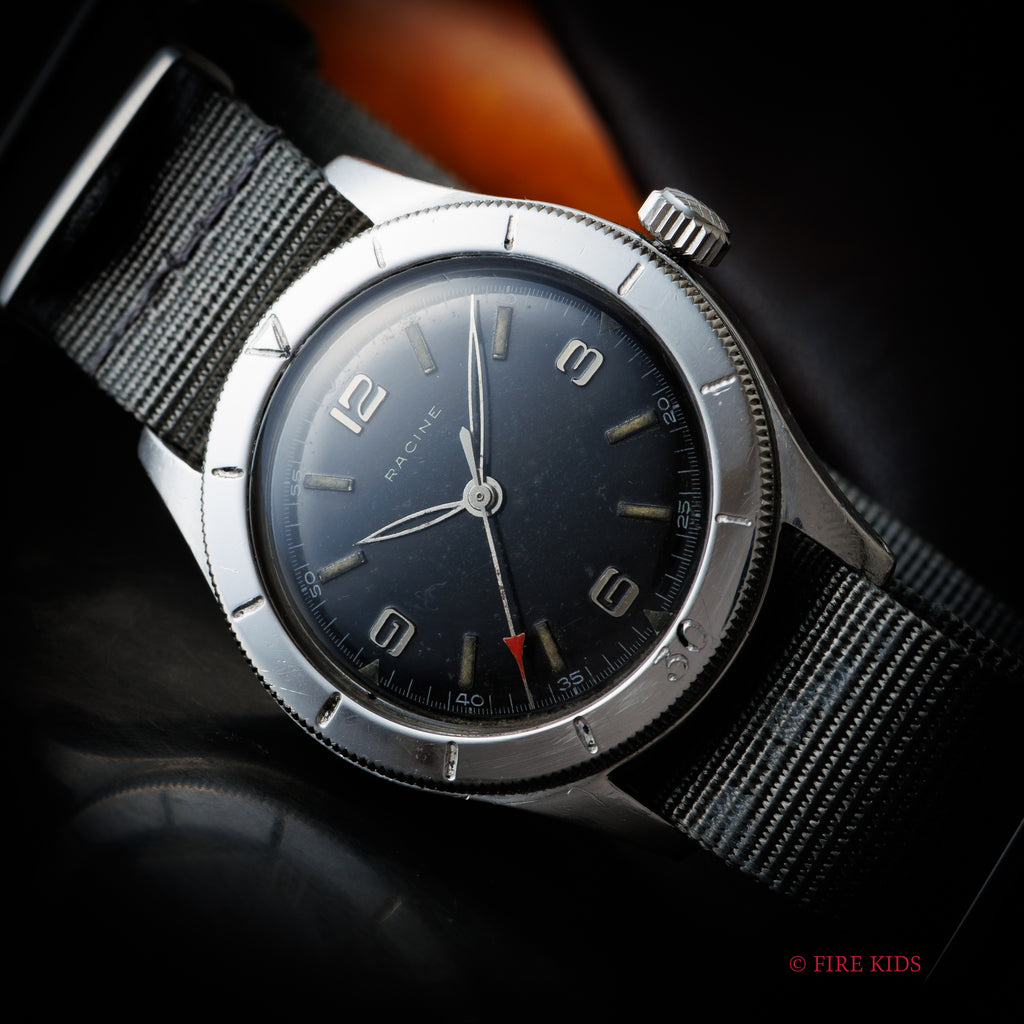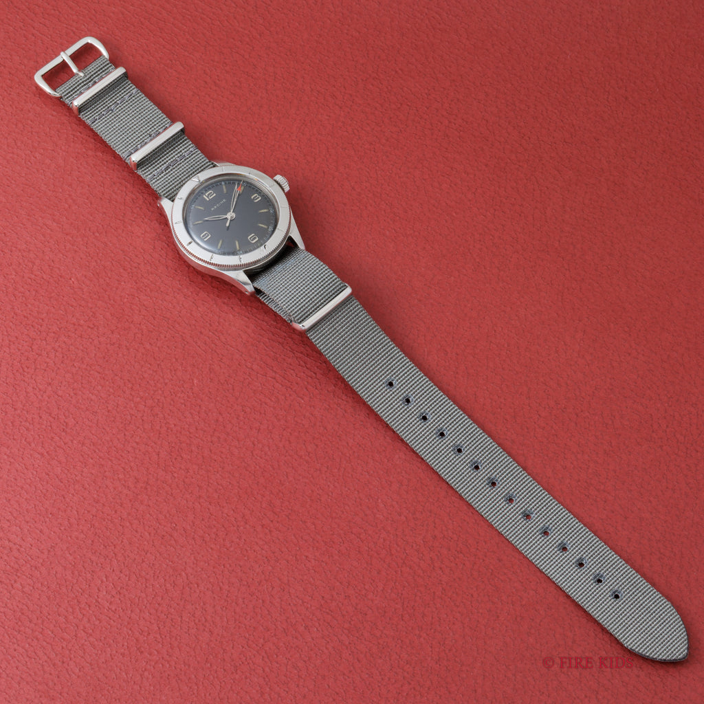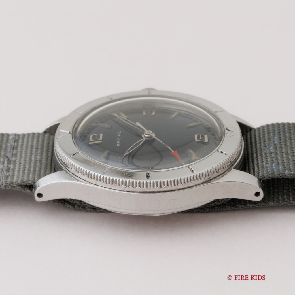 ラシンの1940年代製アラビアダイヤルです。ムーブメント、裏蓋にはGALLETの刻印があります。ミリタリーウオッチの雰囲気でセンターセコンド、スクリューバックケース、耐震装置付きとスペックも軍用時計仕様になっています。ダイヤルは多少の経年変化はございますが、針の夜光は欠落していますが、ダイヤルのプリントの剥がれや夜光の欠落はなく良い状態です。ケースは小キズが見られますが大きなダメージはありません。手巻きや針回しの操作はスムーズです。ベルトはナイロンベルトを合わせております。