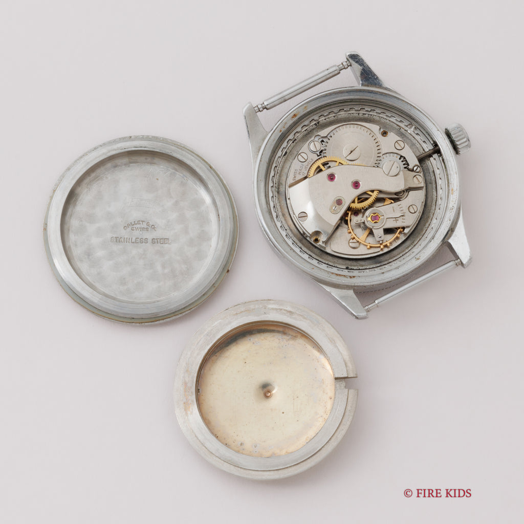 • ヴィンテージ時計の特性上、風防・パッキン・リューズ・バネ棒などの消耗部品は後年メンテナンス過程で交換されている場合がございます。オリジナル性を重視しておりますが、必要に応じて適切な部品にて調整されていますので、よりコレクション性重視のお求めのお客様は事前にご確認ください。