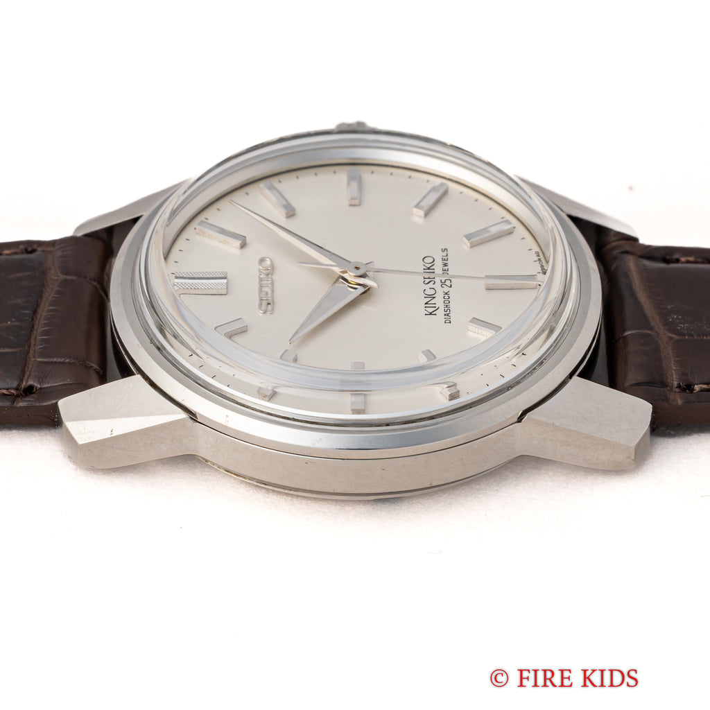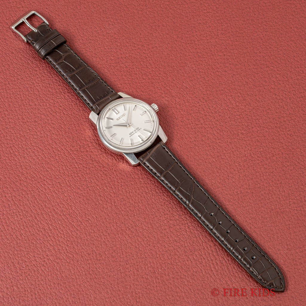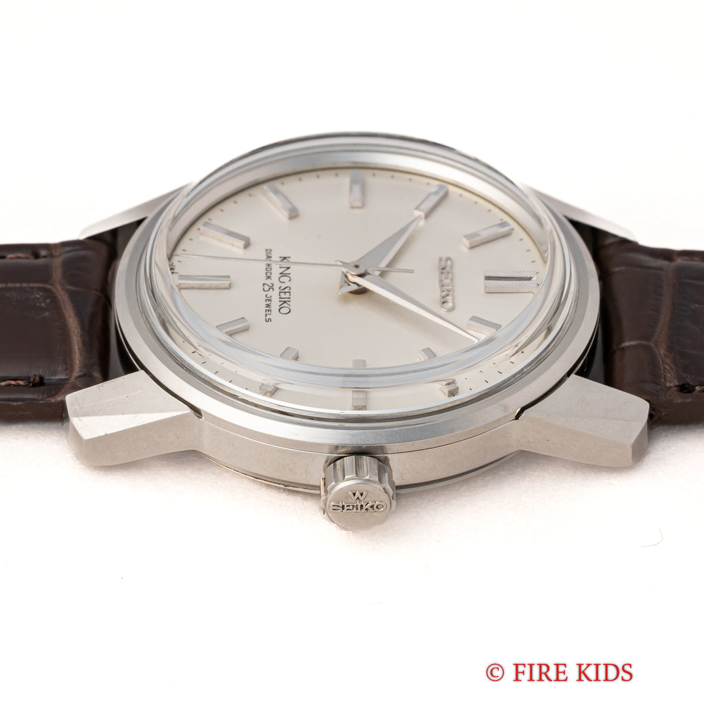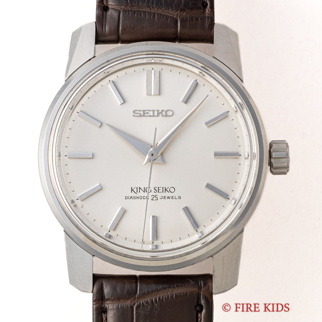 キングセイコー 1966年製 Ref.44-9990 盾メダリオン 44KS前期 手巻き KS尾錠付きです。復刻モデルのケースデザインはこのモデルを参考にしたと思われます。44の前期型で盾メダリオン、鎌式の秒針規制装置が特徴です。 44KINGでも人気のノンデイトで文字盤も綺麗な個体になります。ケースは小傷が見られますが大きなダメージはありません。手巻きや針回しの操作はスムースです。ベルトはファイアーキッズオリジナルのクロコダイル革ベルトが取り付けられています。こちらの時計は分解掃除済みになります。
