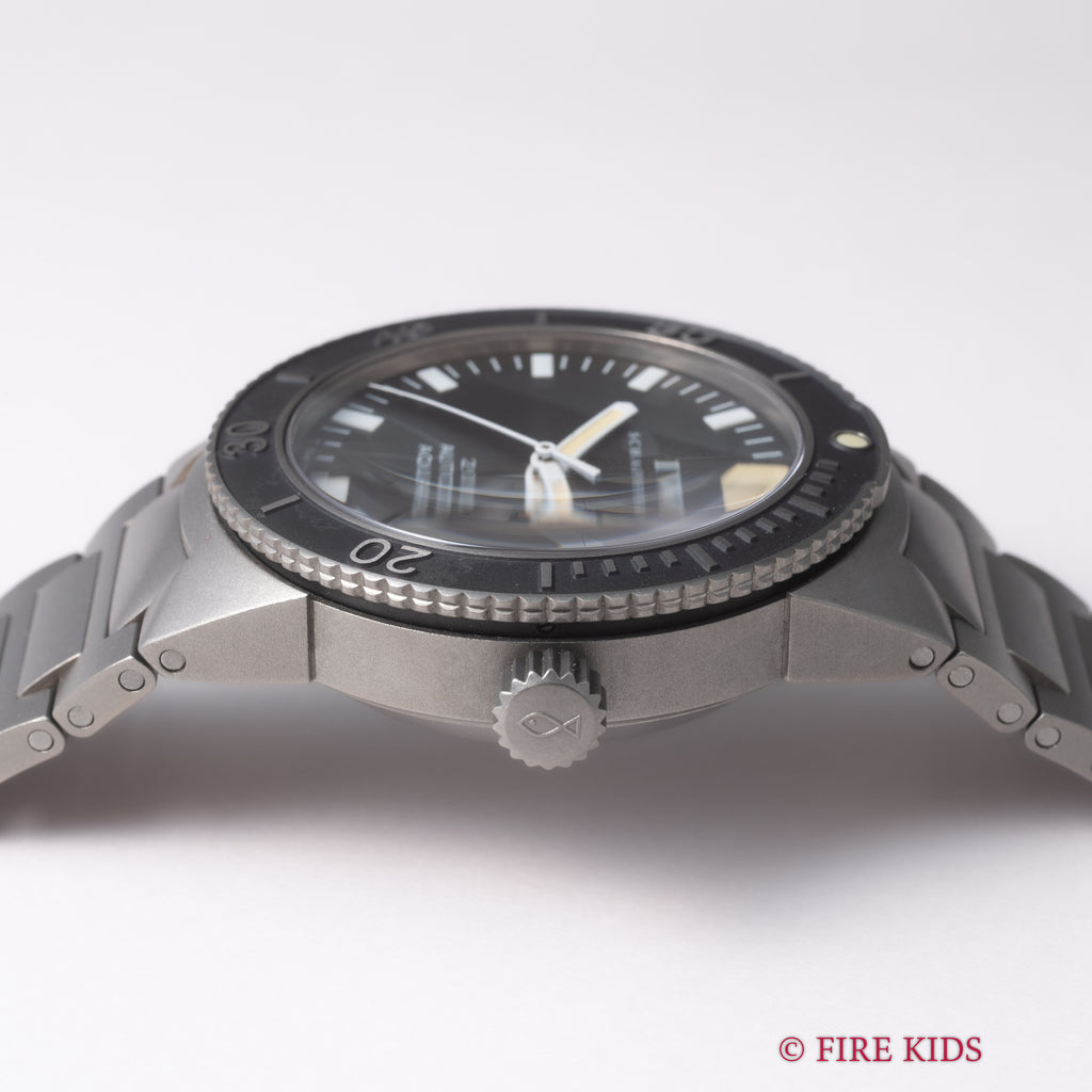 IWC 2000年製(平成12年製) アクアタイマー 2000m防水 チタン オールトリチウム 純正ブレスの入荷になります。ダイヤルはT SWISS MADE T 表記の入る初期タイプで、ルミナスと12時位置インデックス、針が経年で色付いていてカッコいいです。ステンレスモデルもありますが当個体はチタンモデルで、軽量かつコンディションも良くおススメです。2000m防水(当時)ですので現代においても日常的に気兼ねなく使えるヴィンテージウォッチという点も魅力的です。お魚リューズの残ったねじ込みリューズ、その他ファンクションも問題ありません。ベルトも純正チタンブレスが取り付けられています。