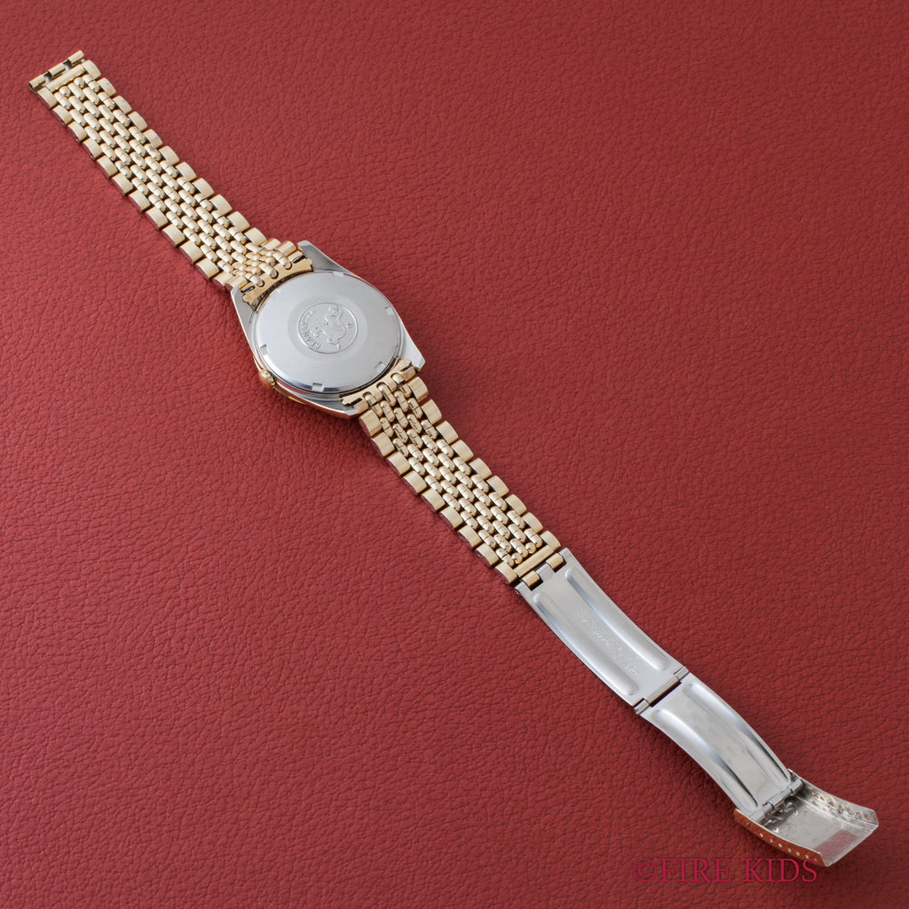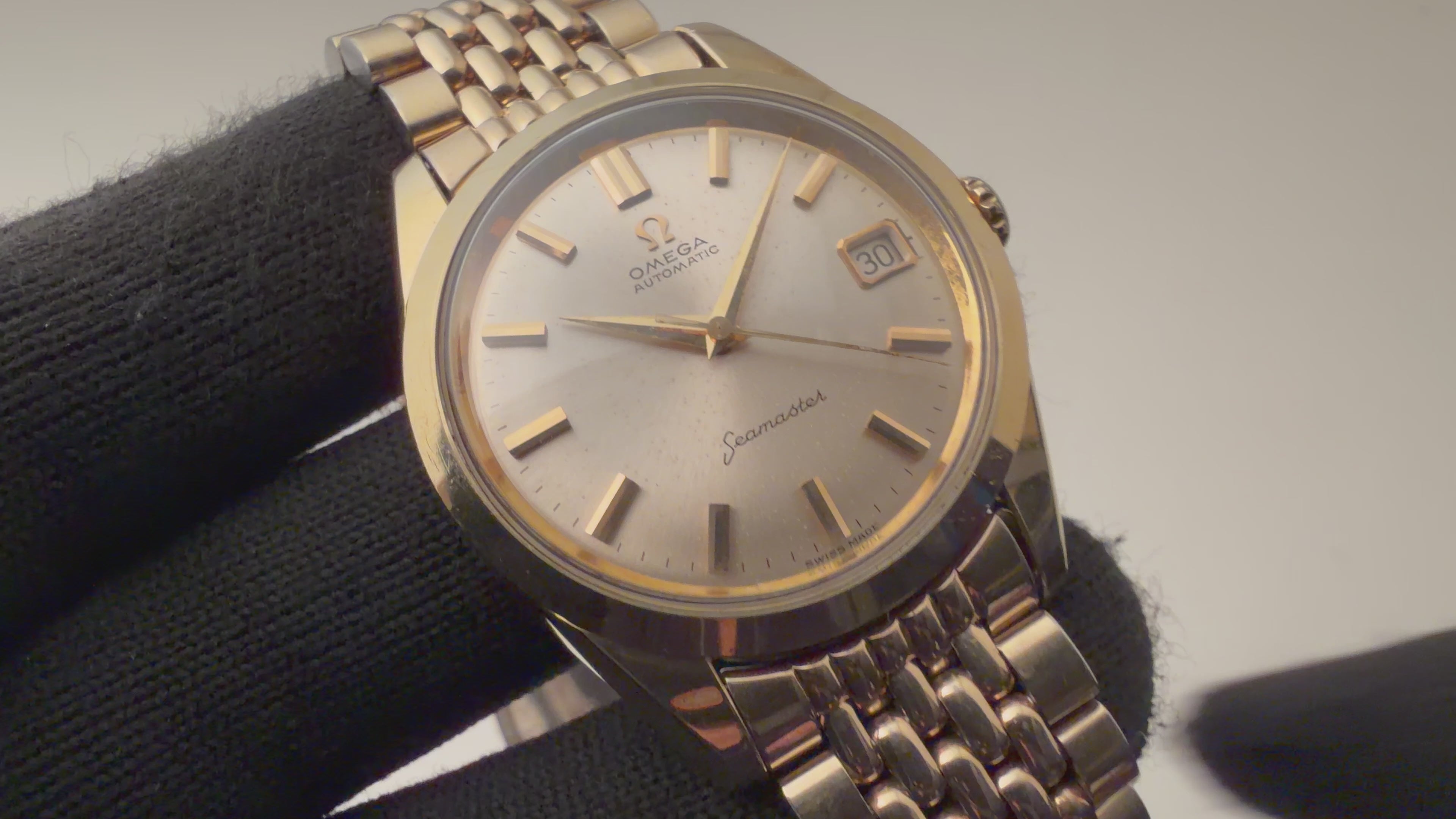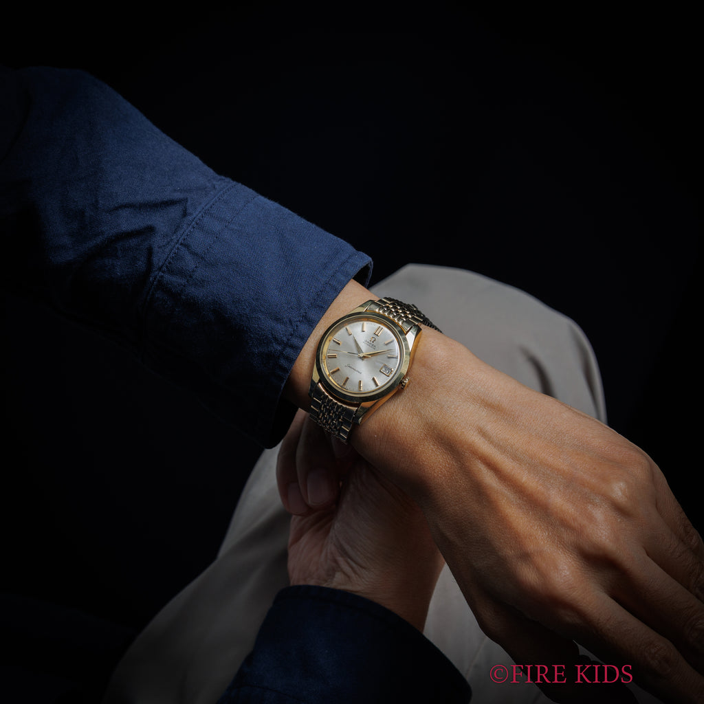 1963年製のオメガシーマスターオートマチック トップゴールドモデルです。シンプルで飽きの来ないデザインが魅力的な定番のヴィンテージのシーマスターです。ムーブメントはCal.562を搭載、カレンダーは針の行き来で送られるタイプです。手巻きや針回しの操作はスムースです。ケースは多少小傷はございますがとてもキレイな状態です。ベルトは純正ライスジュビリーが装着されています。こちらは分解掃除済みになります。
