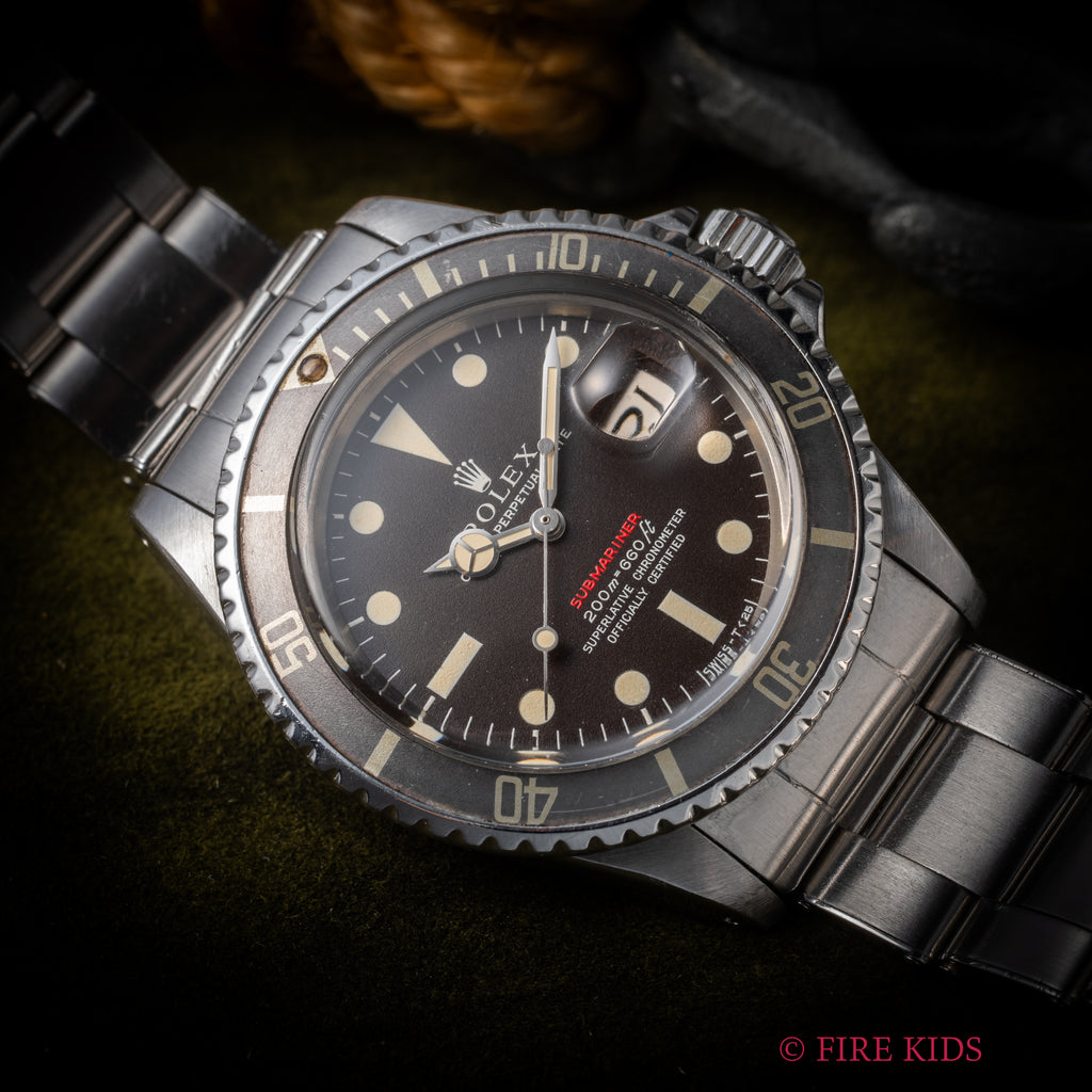 ロレックス 1969年製 サブマリーナー 赤サブ メーターファースト マーク3ダイヤル  Ref.1680 ブラウンチェンジ リベットブレスの入荷になります。ヴィンテージロレックスの中でも抜群の知名度の「赤サブ」の中でも特別感のあるメーターファーストでマーク3ダイヤルだけがブラウンチェンジします。針と文字盤のトリチウム夜光の変色も違和感なくベゼルの退色もあり抜群の雰囲気になっています。ルミナスポイントは交換されています。ケースは若干の磨きが感じられますが大きなダメージはありません。ムーブメントは安心のCal.1570を搭載しています。ブレスは71年のリベットブレスが取り付けられています。