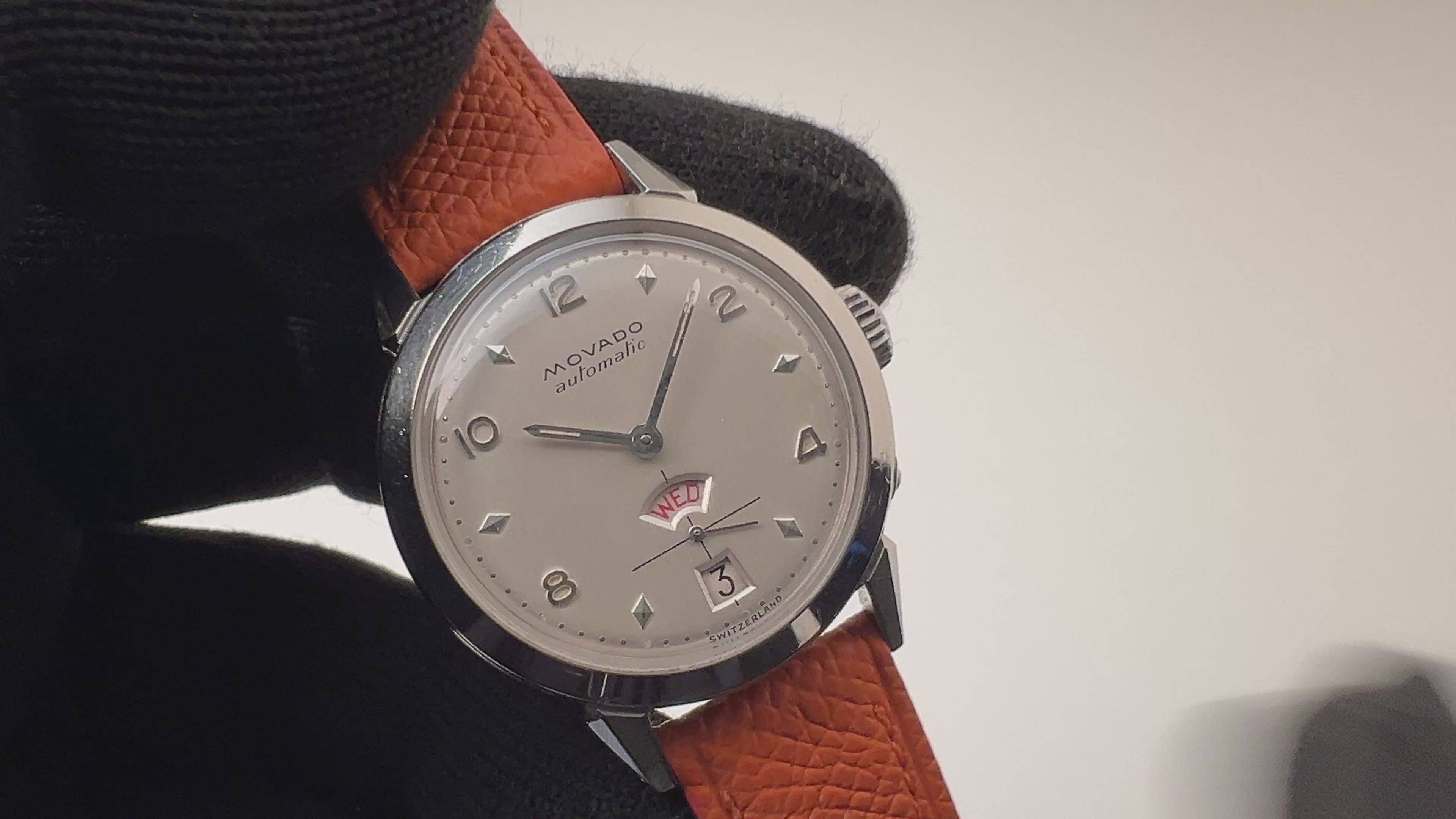モバード カレンドラックス 1950年代製 バンパー式デイデイト自動巻 FBケース 飛びアラビアダイヤルの入荷になります。独創的な6時位置にスモールセコンド、日付、曜日が全て揃った変わり種です。バンパー式オートマチックでハーフローターの独特の振動が使っていて楽しい1本です。ケースはFB社製で防水構造になっています。ムーブメントはハーフローター自動巻きのCal.118を搭載、手巻きや針回しもスムーズです。使用感の少ない美品になります。ベルトは社外のカーフで後年の純正尾錠が取り付けられています。