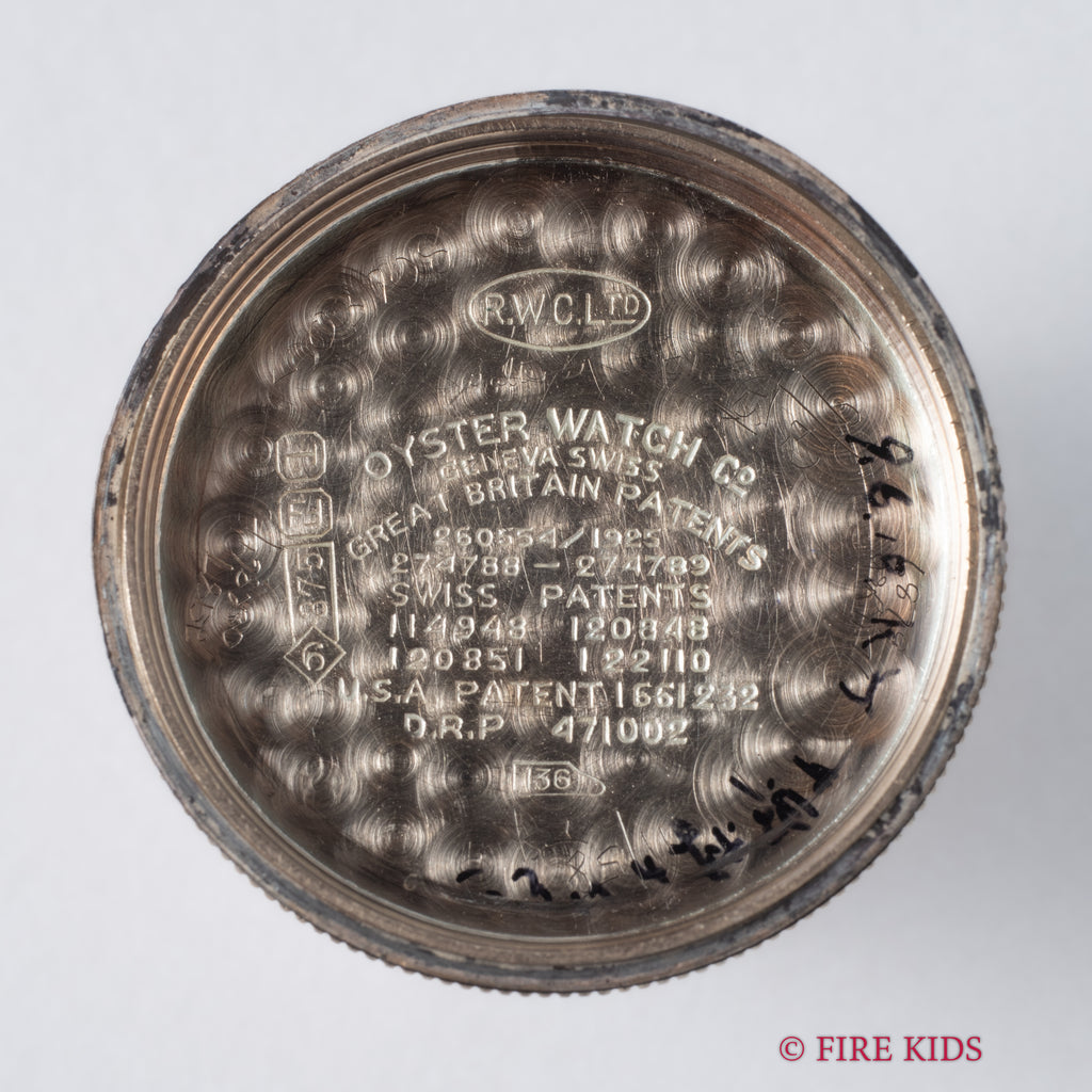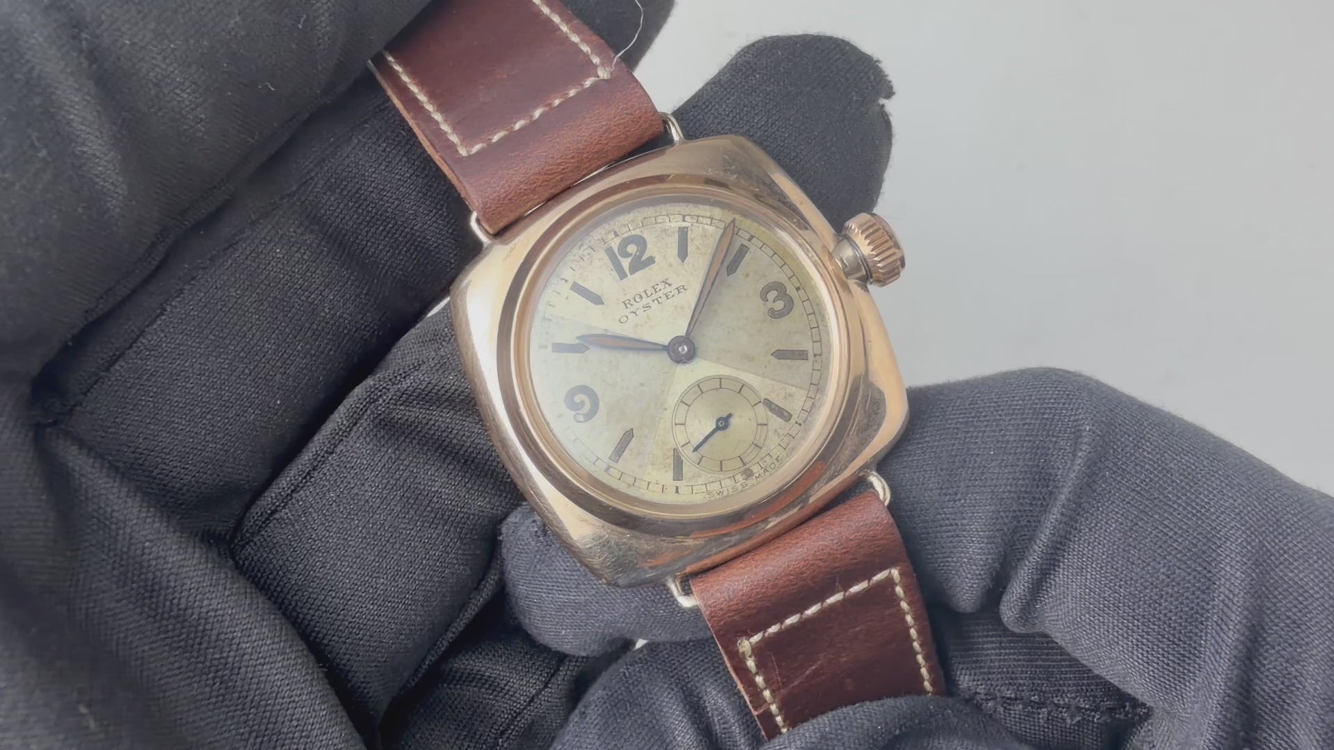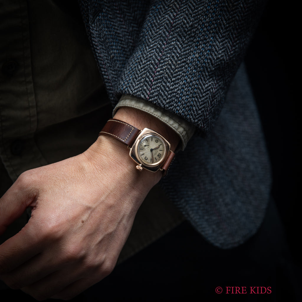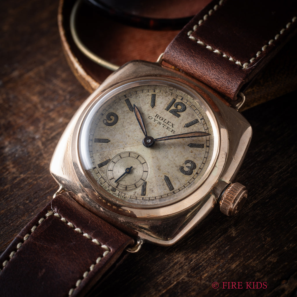 ロレックス オイスター クリスクロス クッションケース 1934年製です。1927年にメルセデス・グライツがドーバー海峡を渡った際に着用したオクタゴンケースのものと同じ世代のモデルで、最初期のオイスターケースの1つです。文字盤はクリスクロスと呼ばれる角度で色合いが変わる人気のダイヤルです。9KYGのクッションケースは大きなダメージもなく良好な状態ですす。手巻きや針回し、リューズのねじ込みの操作はスムースです。ベルトはヴィンテージモデルに相性抜群なアキュレイトフォルム(オープンエンド)のレザーベルトを装着しています。こちらはOH済みです。