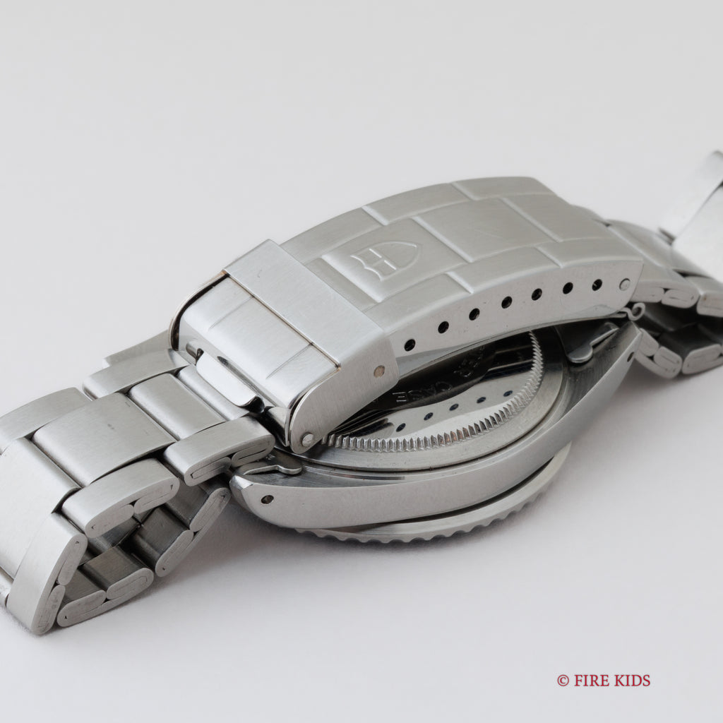 チューダー サブマリーナー 36㎜ミッドサイズ 1993年製 Ref.75090 王冠リューズです。1993年に発売されたベゼル径36㎜のミッドサイズで人気のブルーダイヤルになります。サファイヤガラス採用ながらもフチ無し夜光でヴィンテージの雰囲気になっています。。ムーブメントは自動巻きのCal.2824-2が搭載されています。ベルトはオリジナル3連ステンレスブレス9315/FF383が装着されています。手巻きや針回し、ねじ込みリューズの操作はスムースです。