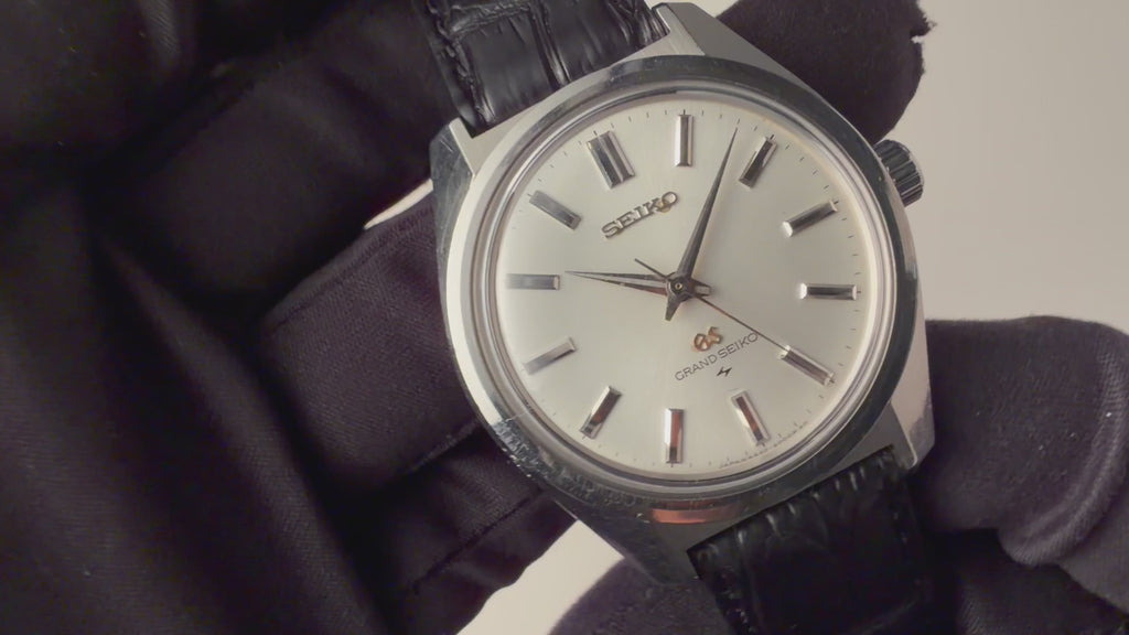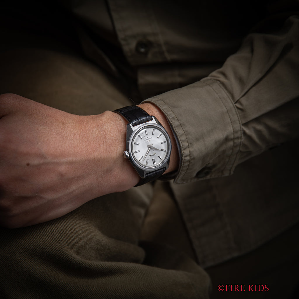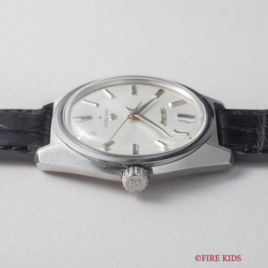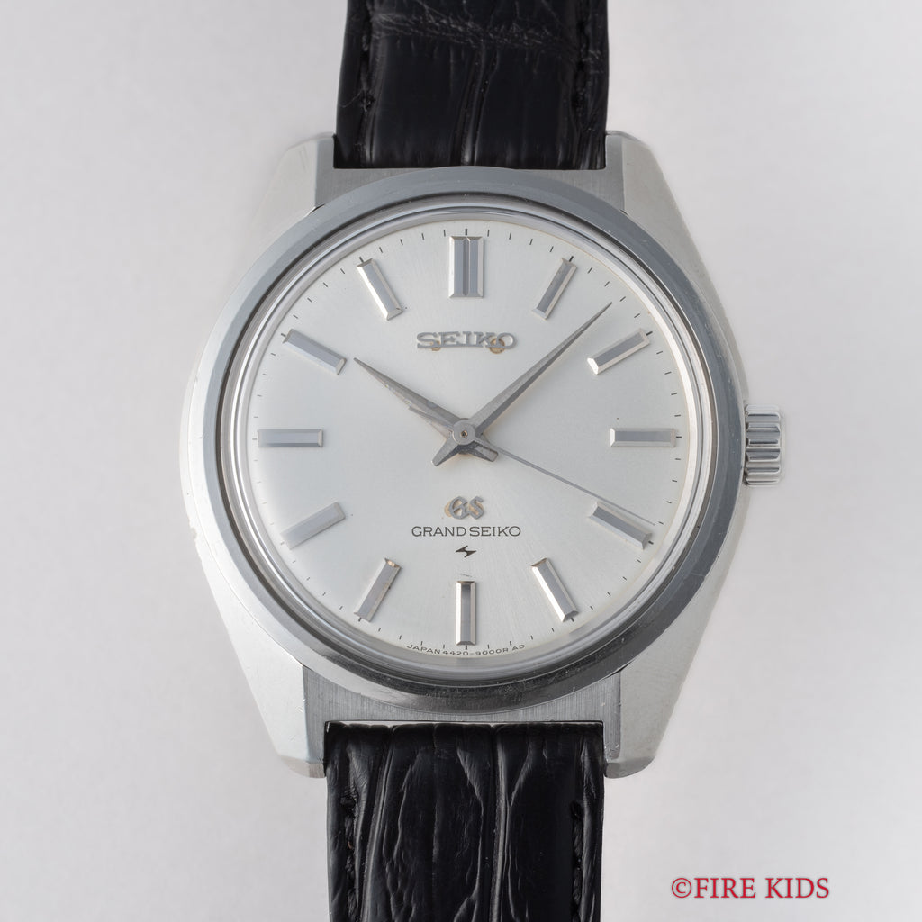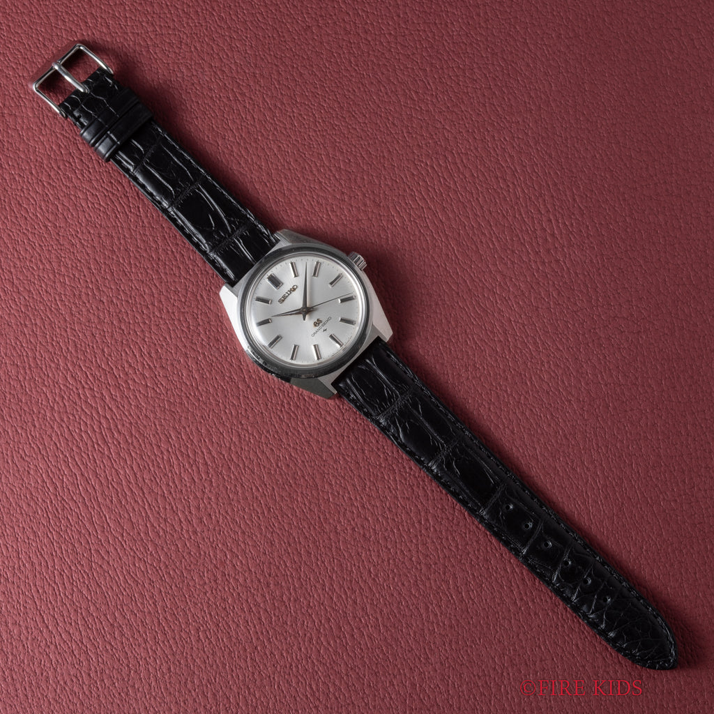 1967年製の44グランドセイコー後期型です。初の第二精工舎(亀戸セイコー)製グランドセイコー、製造期間が僅か2年間の希少なモデルでセイコースタイルと呼ばれるデザインを確立させたといわれるモデルです。ムーブメントは手巻きのCal.4420Bを搭載。文字盤は肉眼でキレイな状態でケースは小傷はございますが大きなダメージはございません。手巻きや針回しの操作はスムースです。ベルトはファイアーキッズオリジナルのクロコダイル革ベルトを取り付けてあります。こちらは分解掃除済みになります。