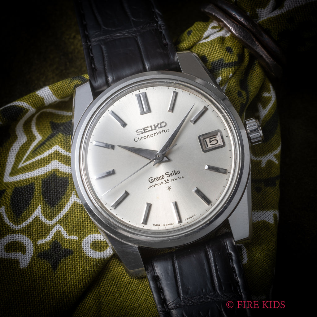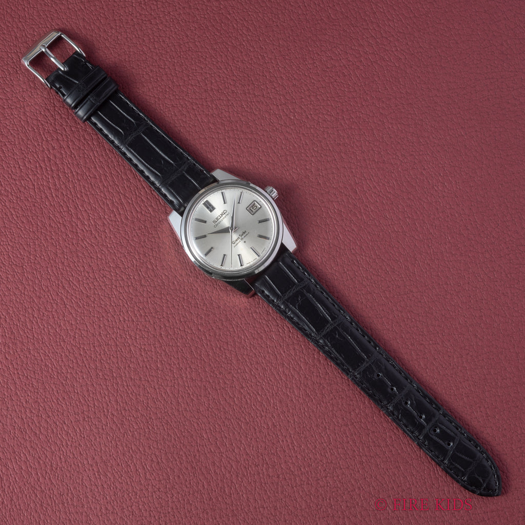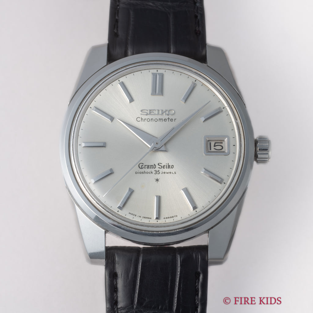 グランドセイコー セルフデーター 1965年製 Ref.43999 GS2nd 初期 ライオンメダルの入荷になります。グランドセイコーのセカンドモデルの初期型Ref.43999でADのマーク入り文字盤です。グランドセイコーの第2世代セルフデーターはステンレスケースにスクリューバック、日付早送り機能の搭載など実用性がアップしたモデルです。メダリオンは人気の獅子メダルで状態も良いです。ケースは小傷はございますが大きなダメージはございません。ムーブメントは手巻き35石のCal.5722Aを搭載。ベルトはファイアーキッズオリジナルのクロコダイル革ベルトが取り付けられています。