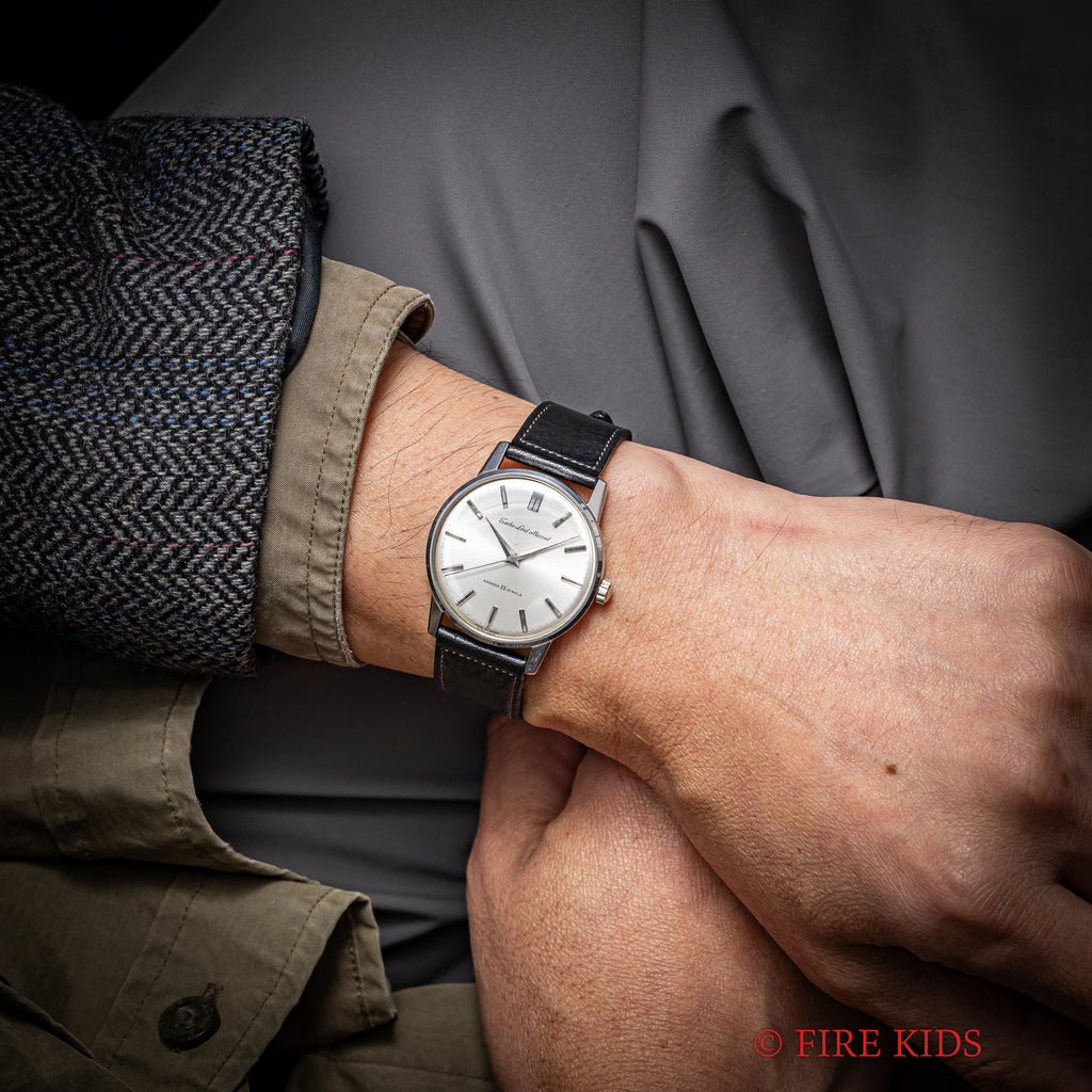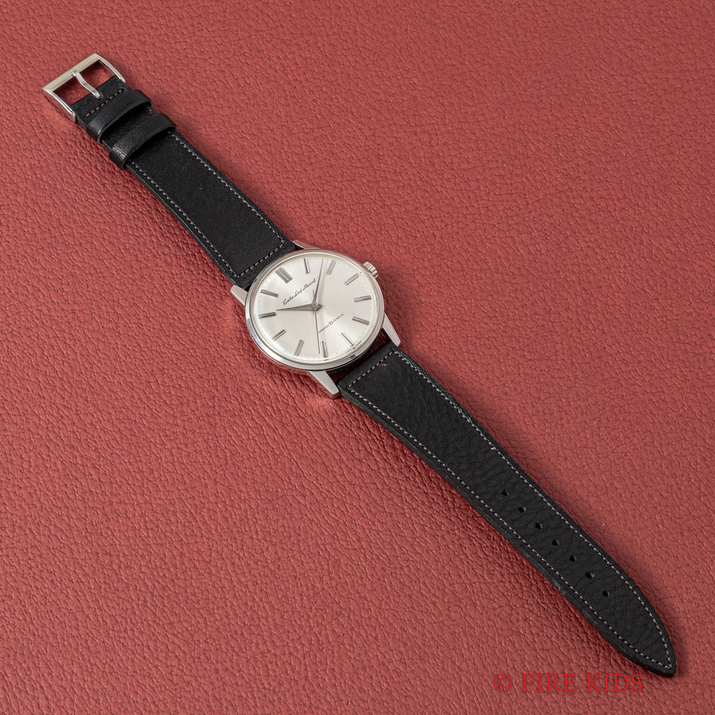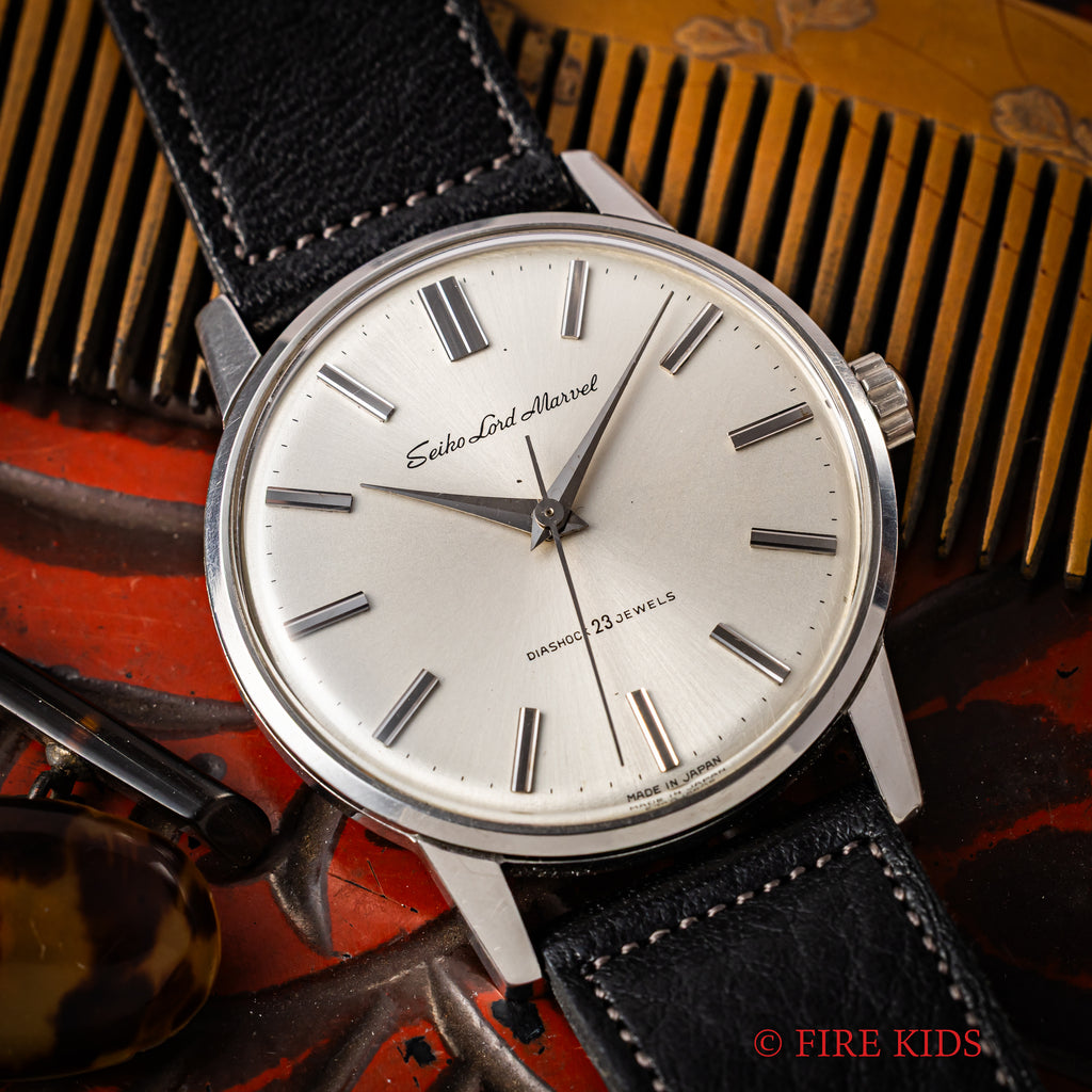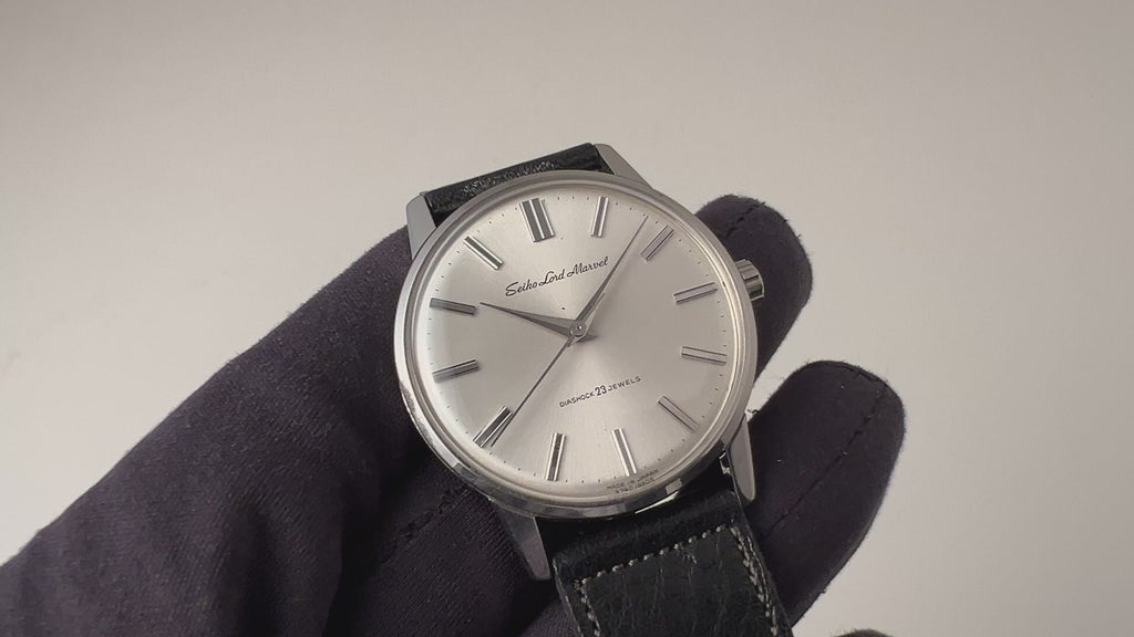 1964年製のセイコー ロードマーベル 手巻き ロービートモデルが入荷しました。1960年にグランドセイコーが生まれる以前の高級機として1958年から製造されたロードマーベル。サンバースト仕上げの文字盤やドーフィンハンド、植字のインデックスなど高級感が感じられます。ダイヤル、ケースともに多少の経年や小傷はありますが大きなダメージはありません。機械はロービート(5振動)手巻きのCal.5740Aを搭載。ベルトはアキュレイトフォルムの革ベルトを合わせています。手巻きや針回しはスムーズです。